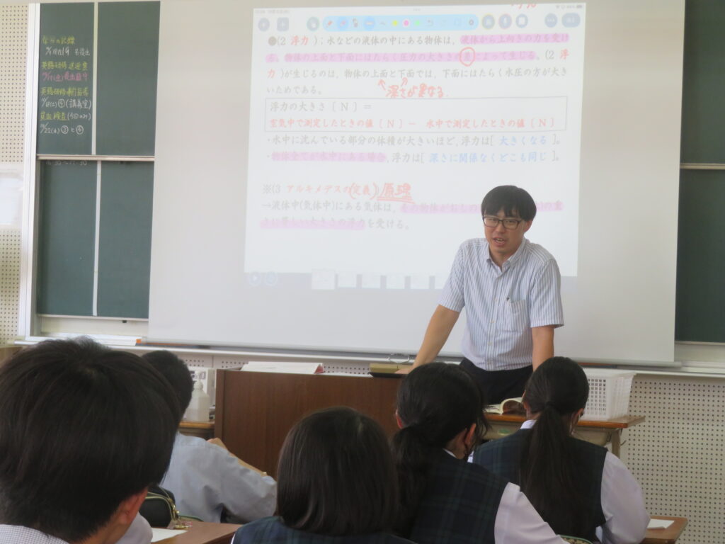 先週第3回定期考査が終了して、今週2日目となりました。本日は昼食・清掃後、午後の1番目に行われる5時間目の授業にお邪魔しました。J2B教室では、井料田先生が理科の授業をなさっていました。生徒たちはとても静かに先生の説明を聞いていました。力の合成と「ピコ太郎」を連想させて指導されており、とてもユーモアがあふれる授業でした。