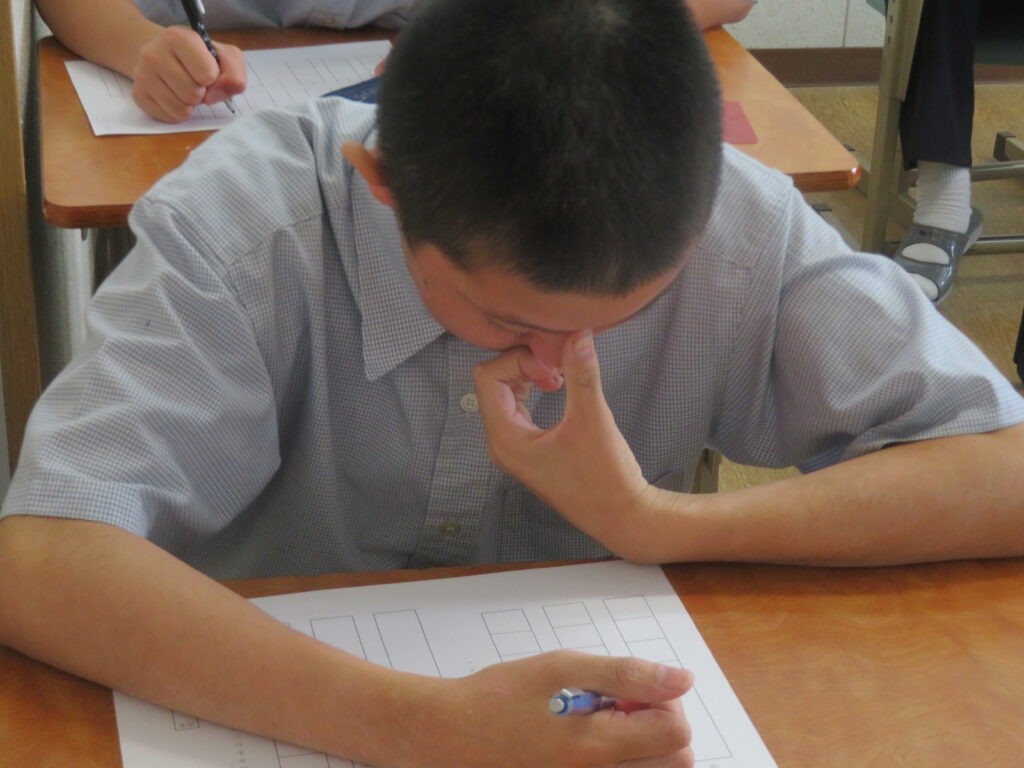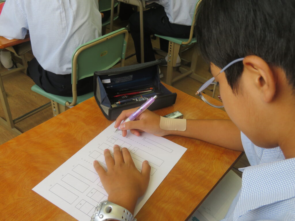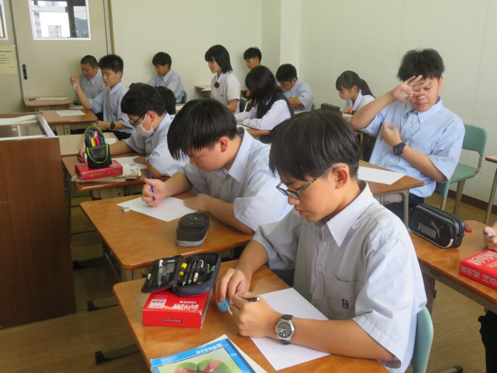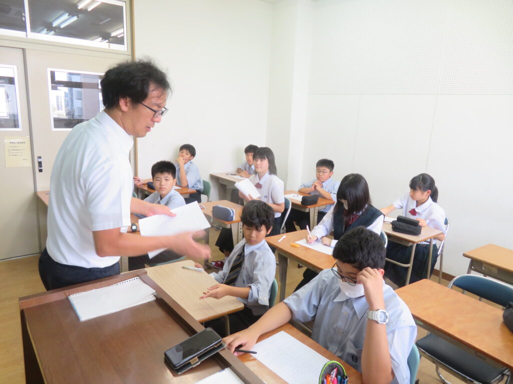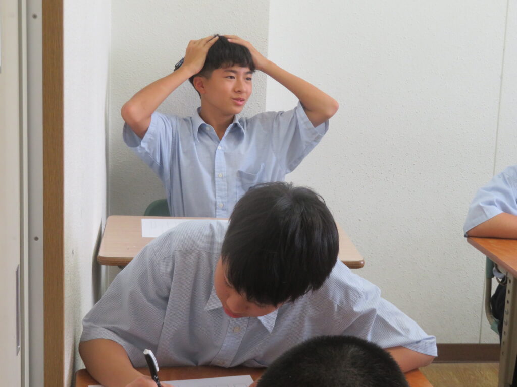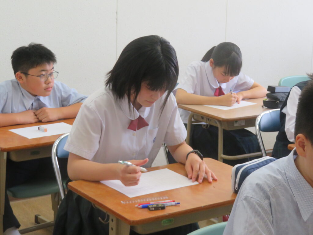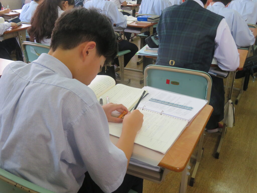 演習室では、来る漢字検定に向けた対策として、吉田亮介先生が工夫を凝らした授業を展開されていました。生徒自身に漢字に関する問題を作成させ、そのプリントをクラスメートと交換して解答するという形式です。早々に問題を完成させる生徒もいれば、時間をかけてじっくり取り組む生徒もいましたが、問題の作成と解答の両方を通して、生徒たちが楽しみながら学んでいる様子が伝わってきました。作成中には頭を抱えていた生徒も、プリントを交換すると、興味津々に問題に取り組んでいました。