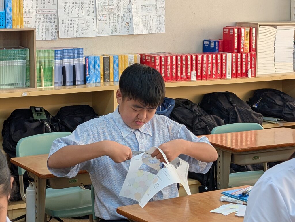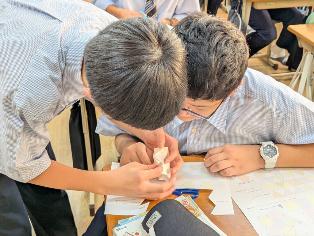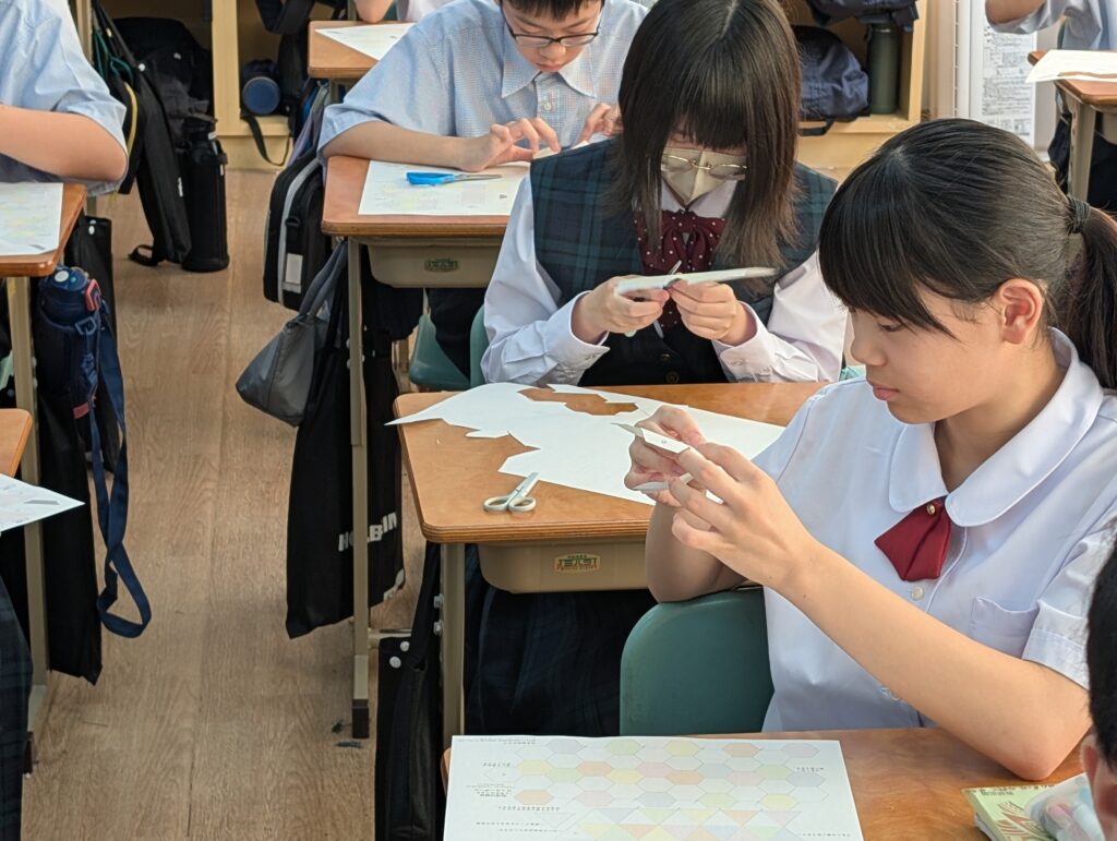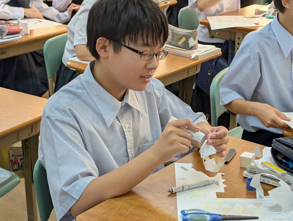 現在、J1生の数学の授業では、空間図形の学習をしています。その中で、正多面体を学ぶために実際に立体を作り、特徴などを確認しました。