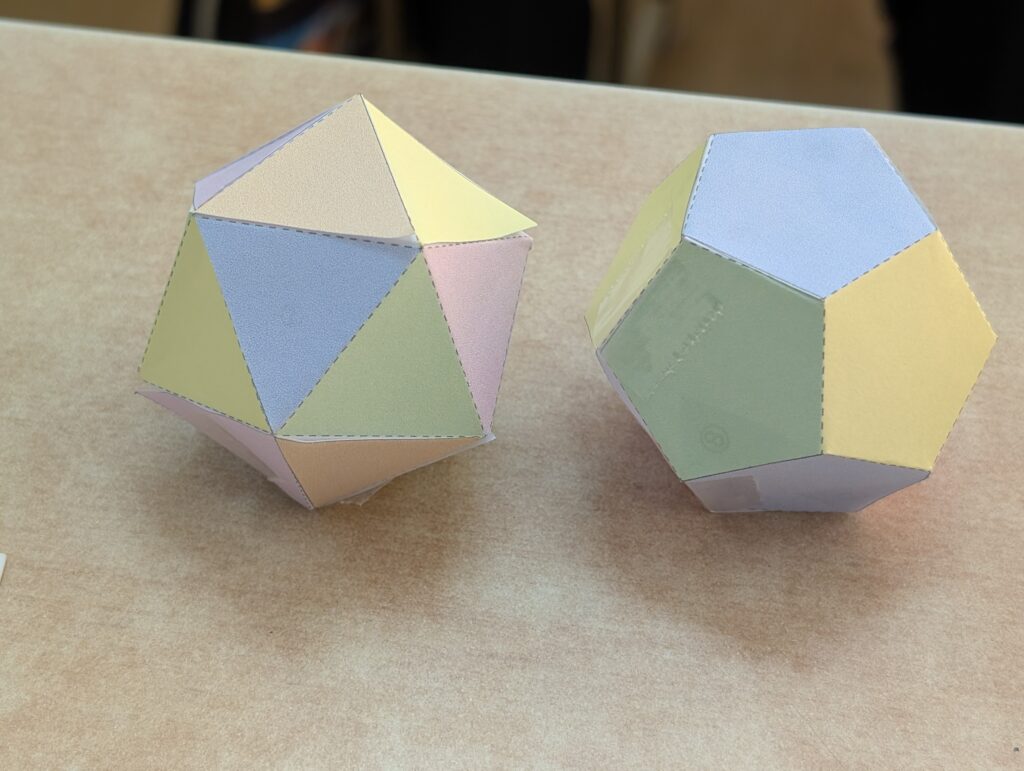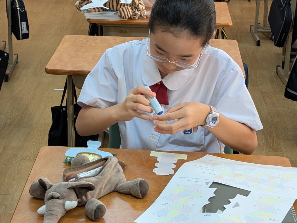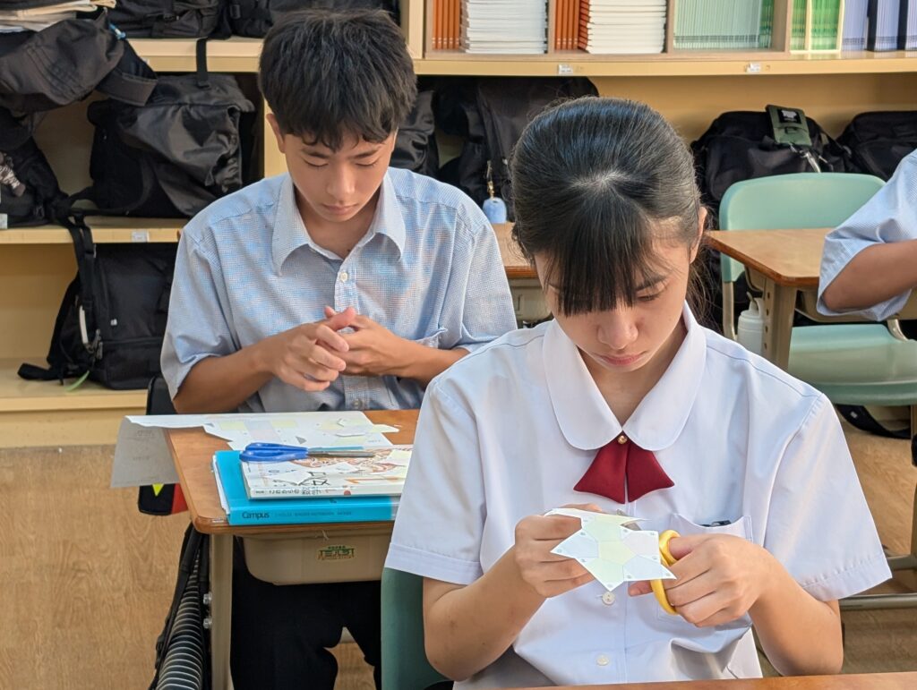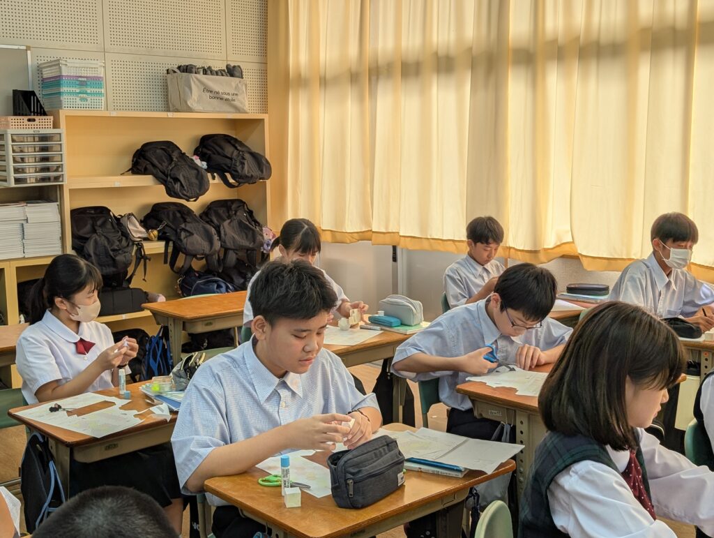現在、J1生の数学の授業では、空間図形の学習をしています。その中で、正多面体を学ぶために実際に立体を作り、特徴などを確認しました。