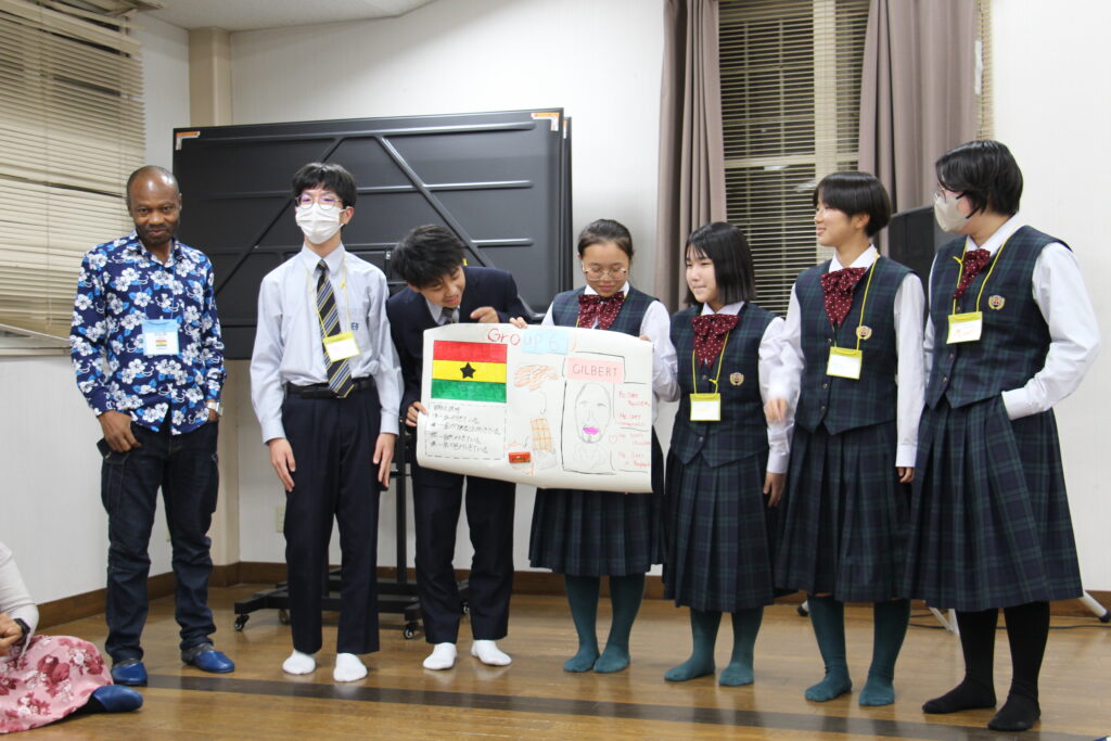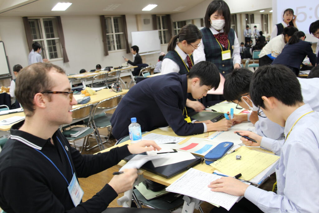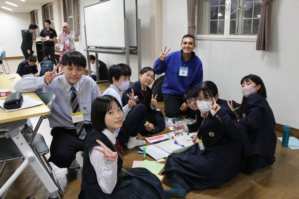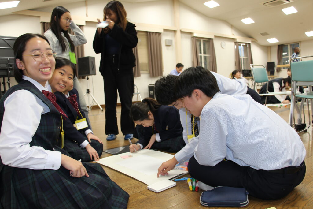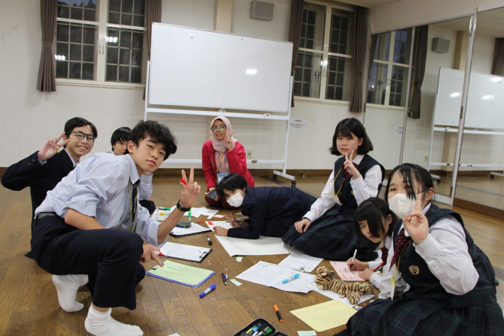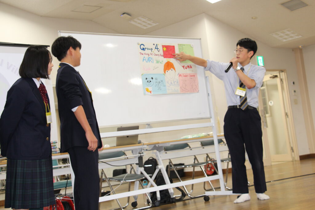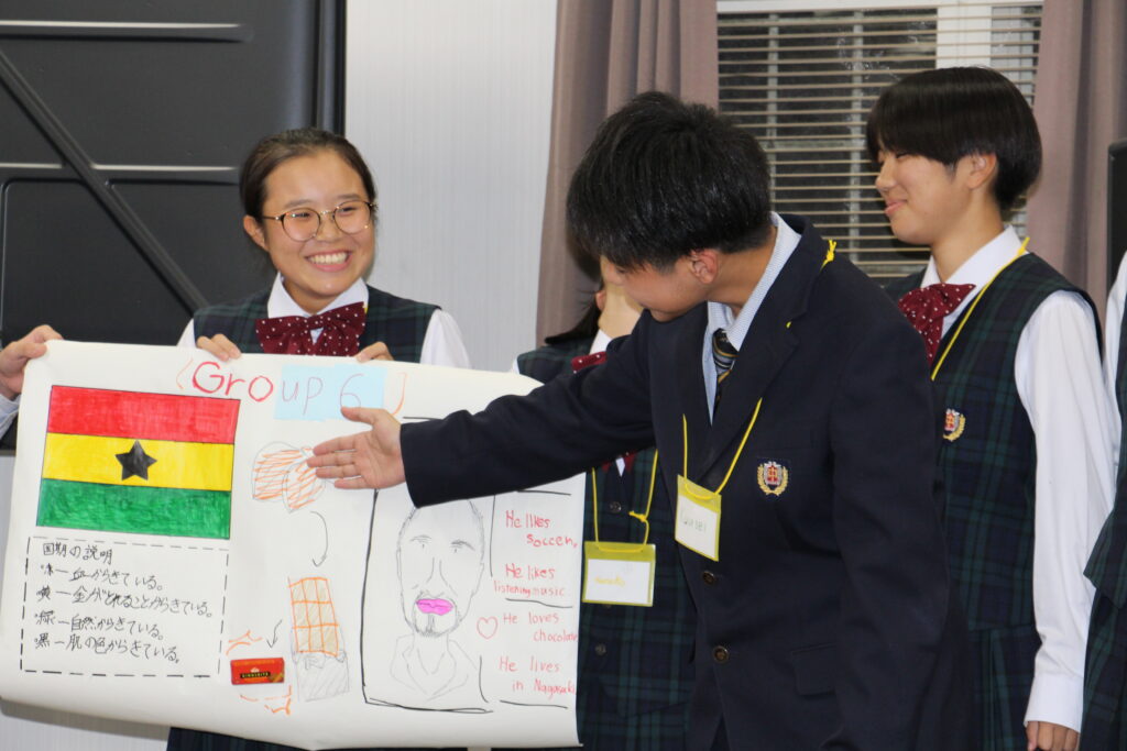 午後の活動の続きです。夕食前の活動はポスター制作です。グローバルリーダーに出身国の事や日本の好きな食べ物など、思い思いのことを一生懸命に英語で質問していました。質問したことをグループでまとめ、リーダーのことをみんなにわかりやすく紹介するため、似顔絵を描いたり、国旗を書いたりいろいろ工夫していました。
