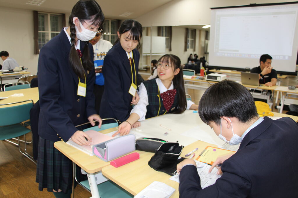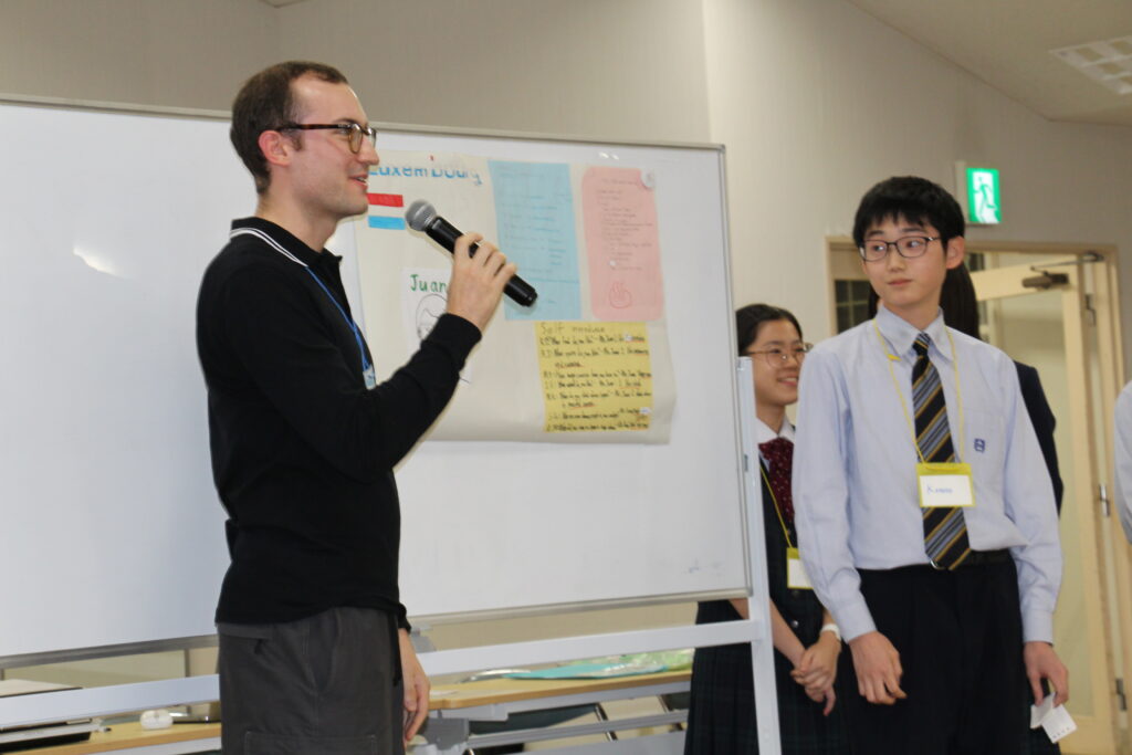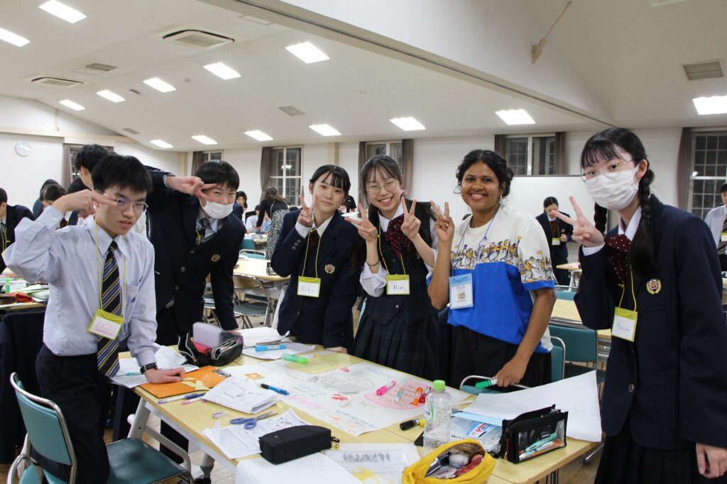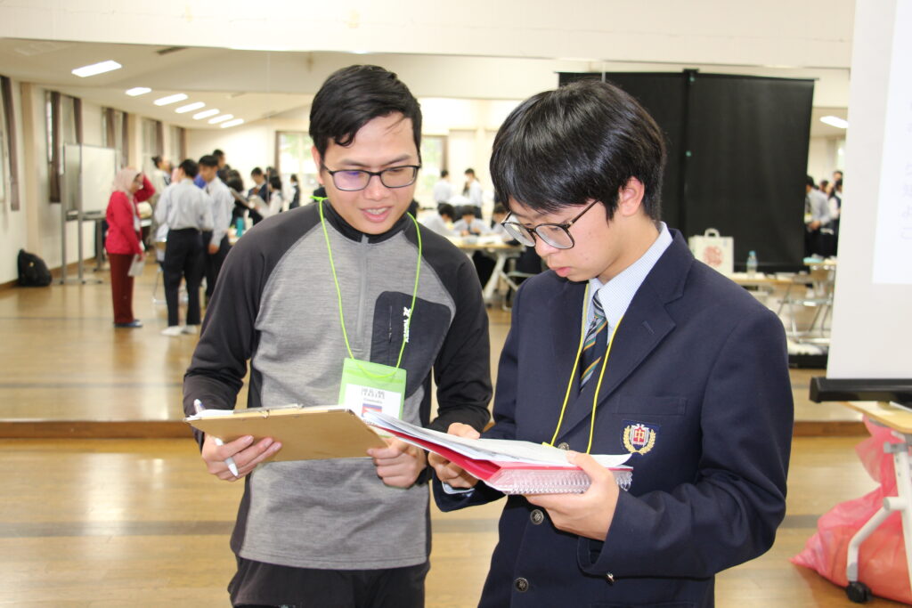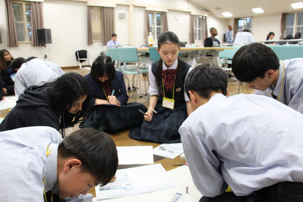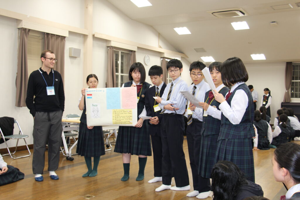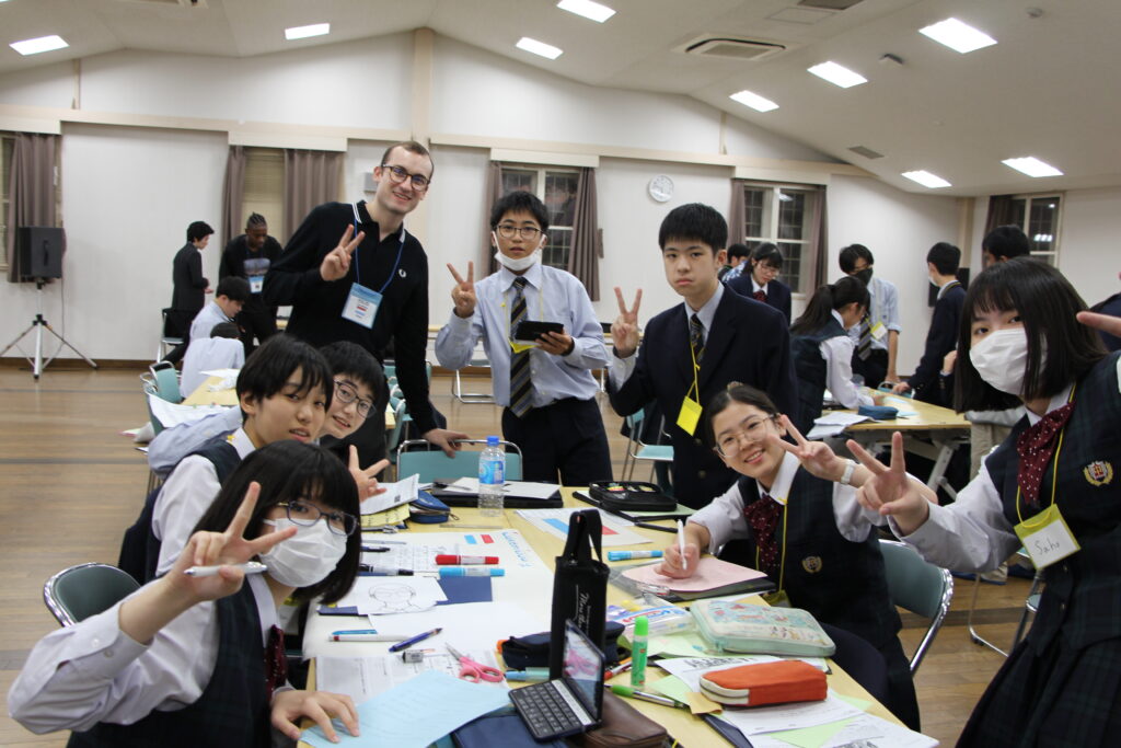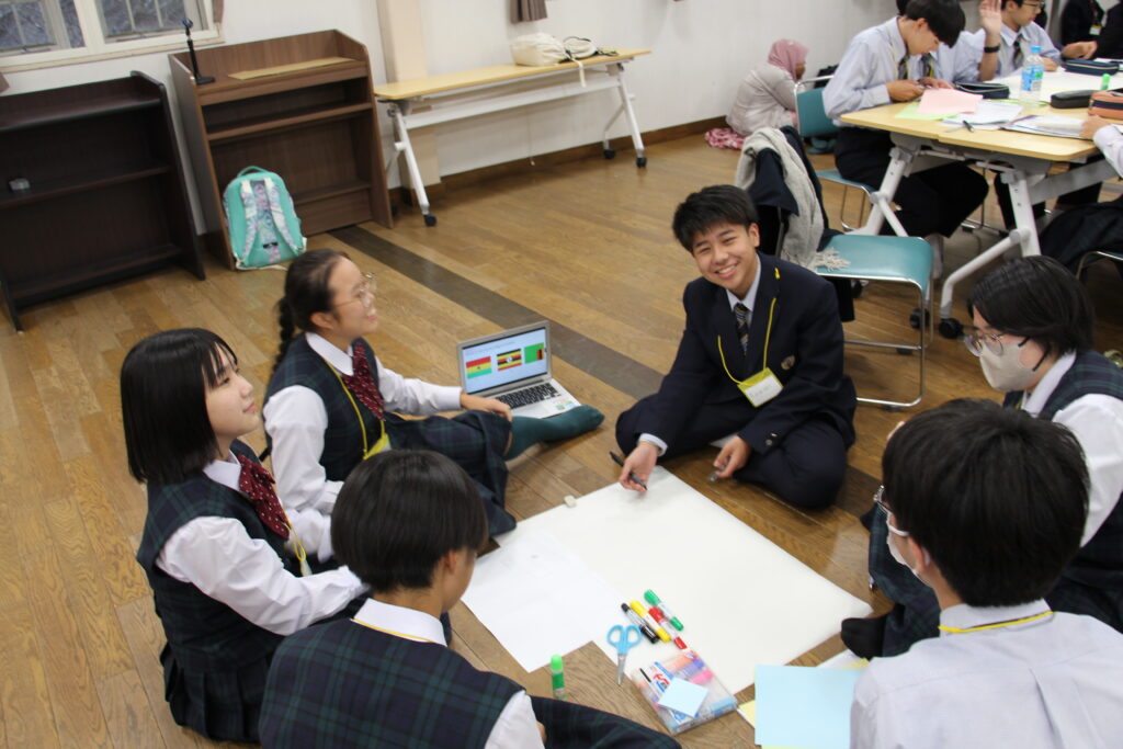 午後の活動の続きです。夕食前の活動はポスター制作です。グローバルリーダーに出身国の事や日本の好きな食べ物など、思い思いのことを一生懸命に英語で質問していました。質問したことをグループでまとめ、リーダーのことをみんなにわかりやすく紹介するため、似顔絵を描いたり、国旗を書いたりいろいろ工夫していました。