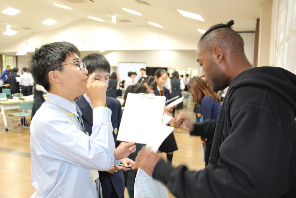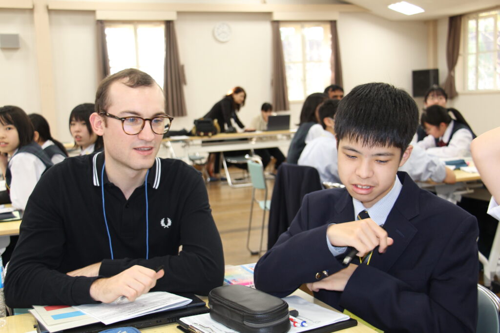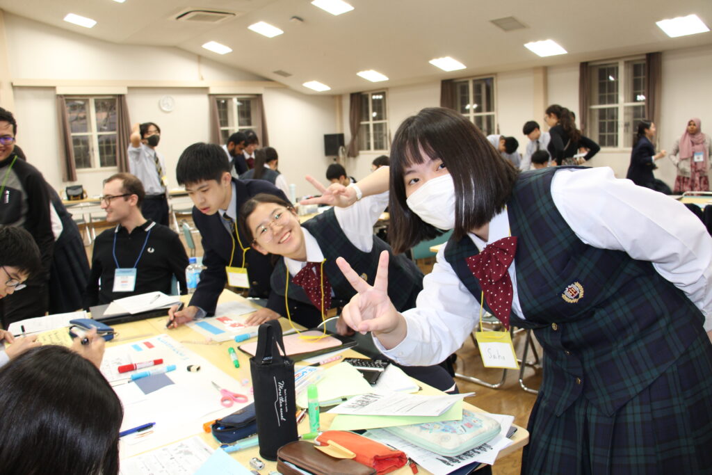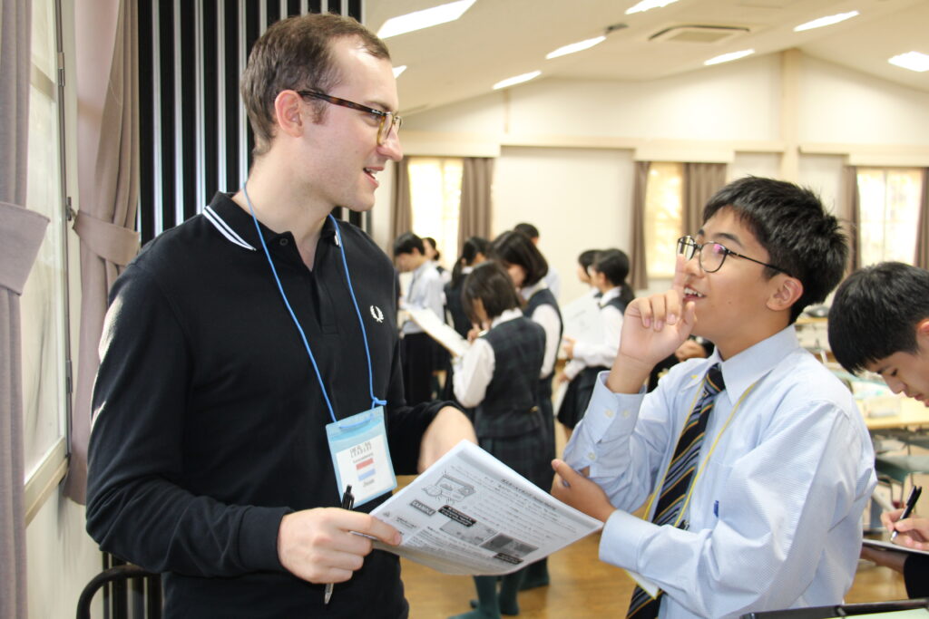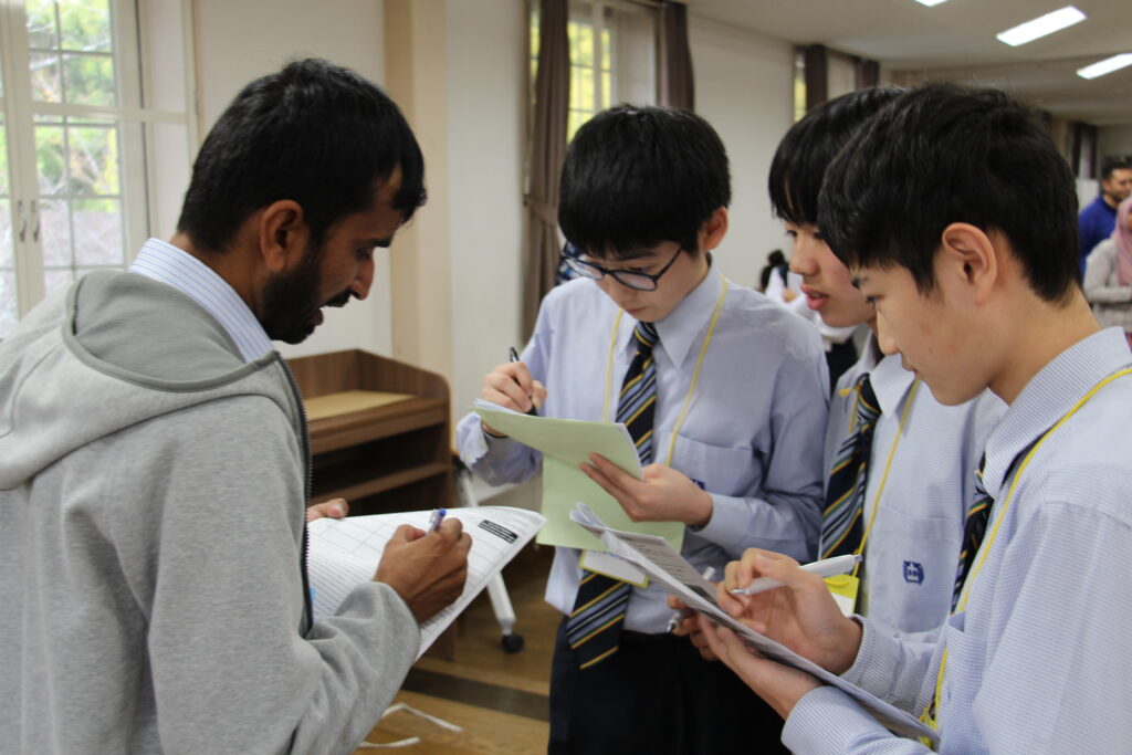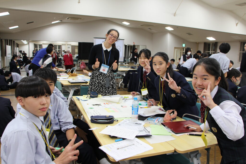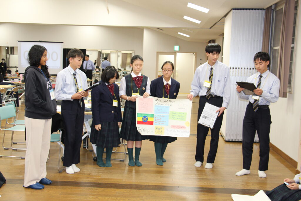 午後の活動の続きです。夕食前の活動はポスター制作です。グローバルリーダーに出身国の事や日本の好きな食べ物など、思い思いのことを一生懸命に英語で質問していました。質問したことをグループでまとめ、リーダーのことをみんなにわかりやすく紹介するため、似顔絵を描いたり、国旗を書いたりいろいろ工夫していました。