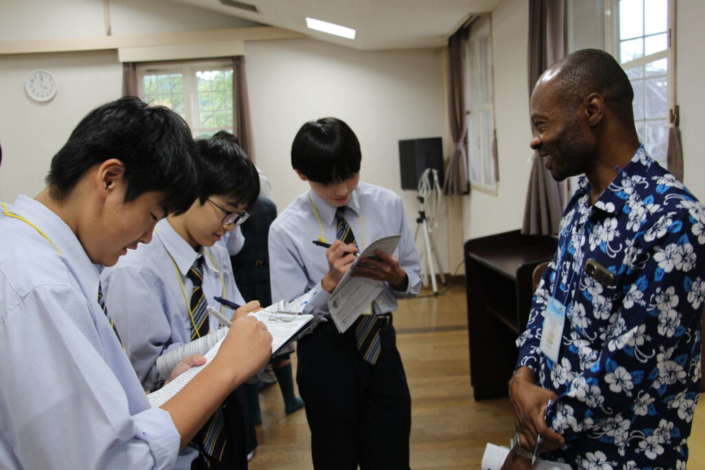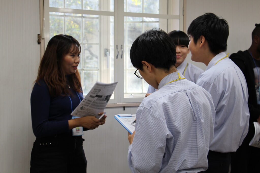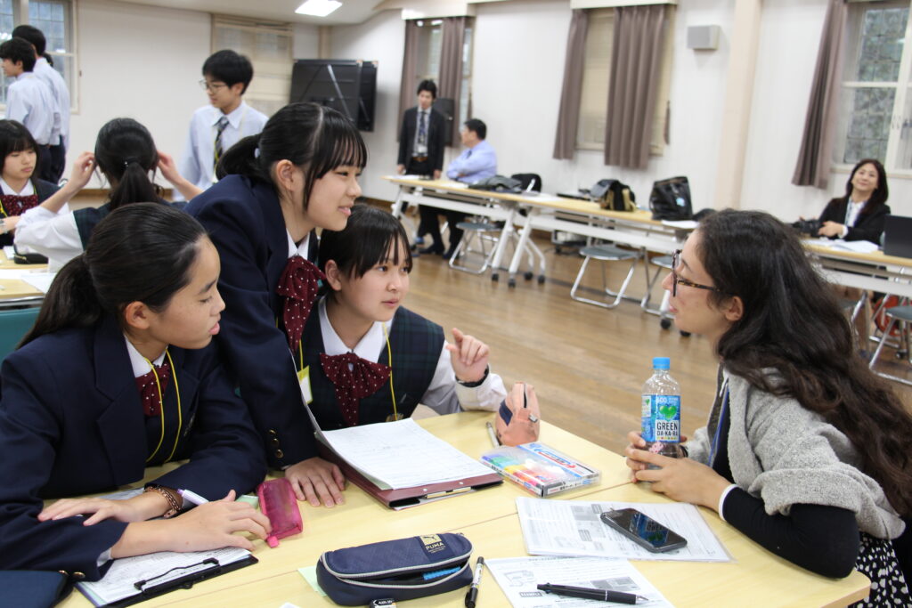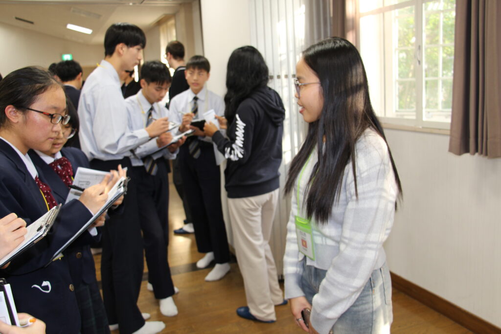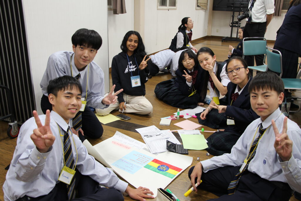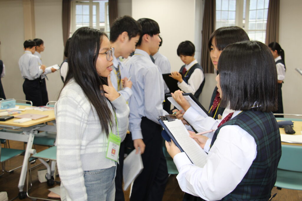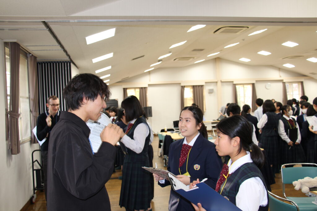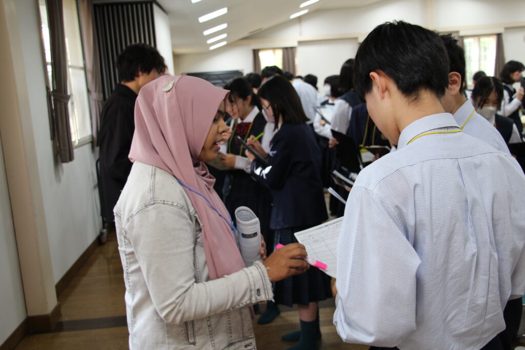 午後の活動の続きです。夕食前の活動はポスター制作です。グローバルリーダーに出身国の事や日本の好きな食べ物など、思い思いのことを一生懸命に英語で質問していました。質問したことをグループでまとめ、リーダーのことをみんなにわかりやすく紹介するため、似顔絵を描いたり、国旗を書いたりいろいろ工夫していました。