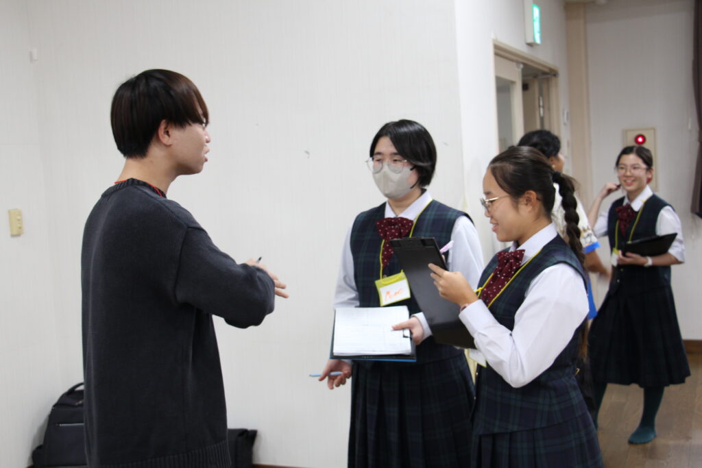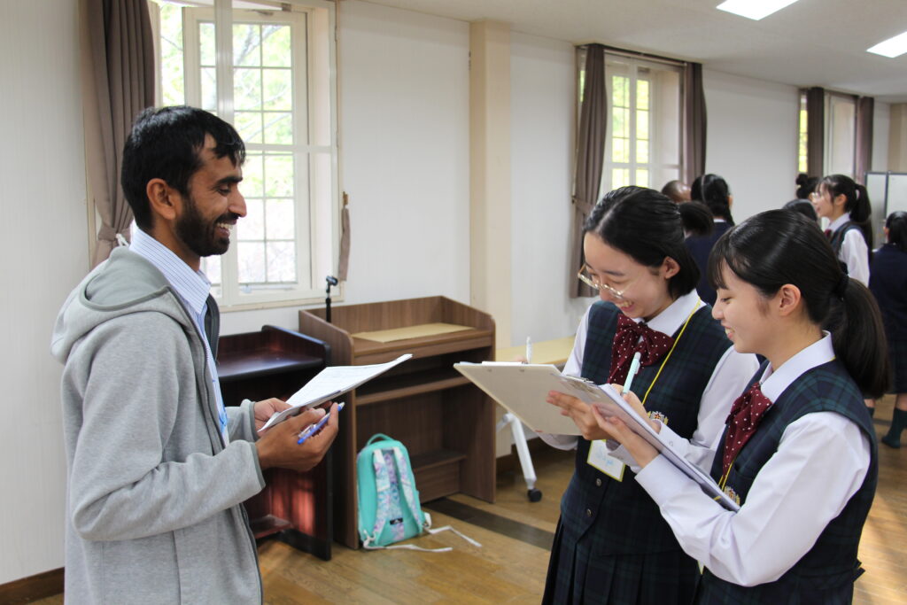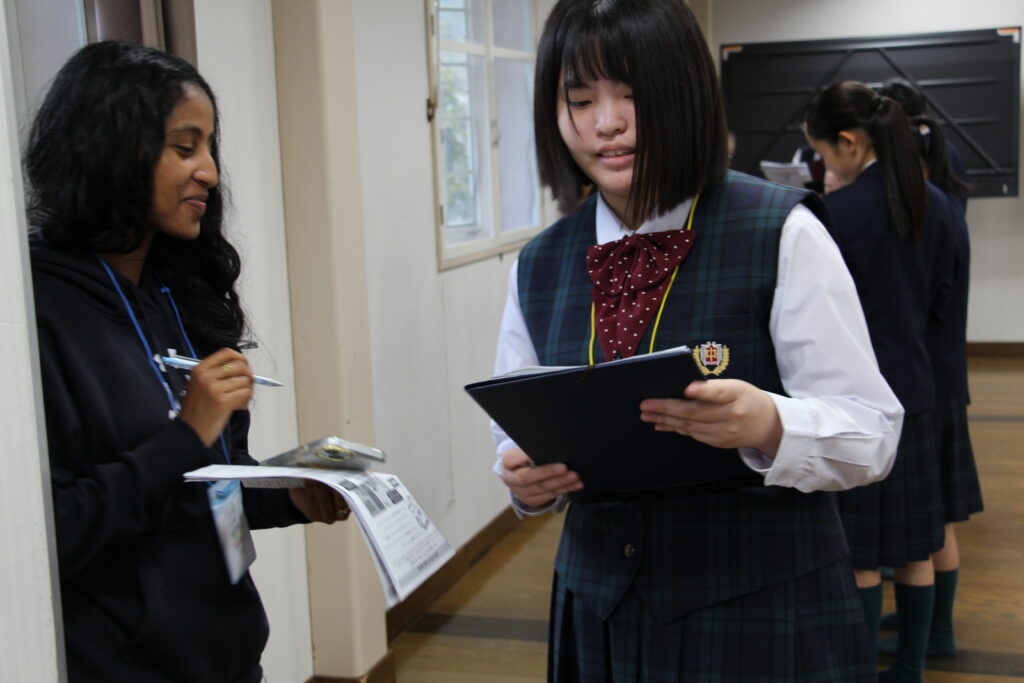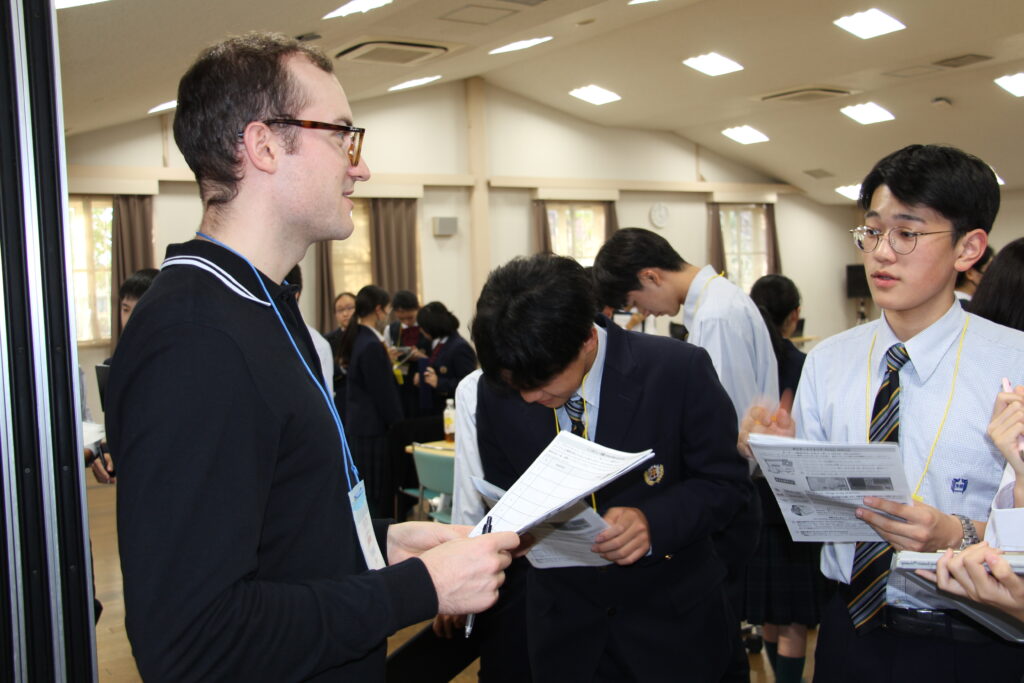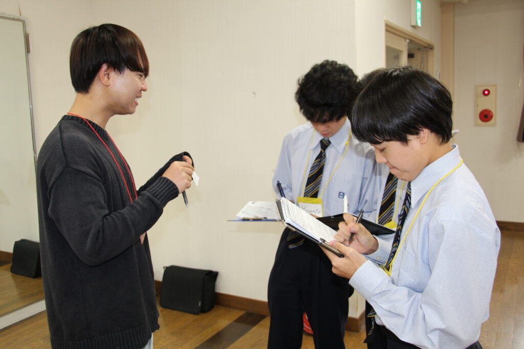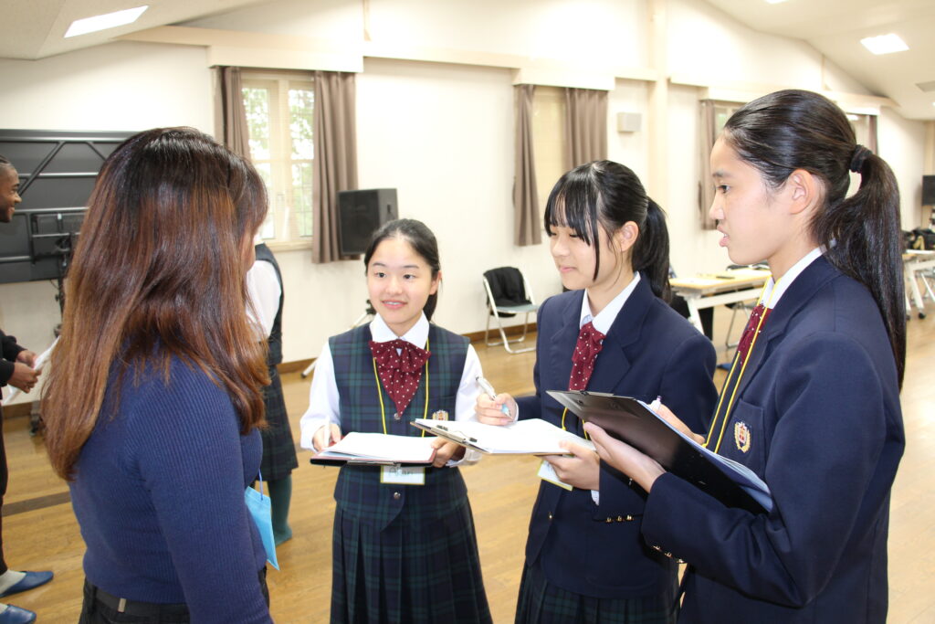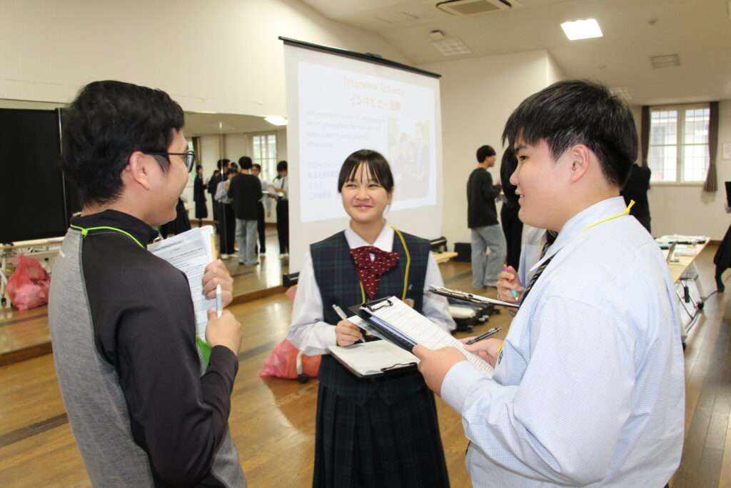午後の活動の続きです。夕食前の活動はポスター制作です。グローバルリーダーに出身国の事や日本の好きな食べ物など、思い思いのことを一生懸命に英語で質問していました。質問したことをグループでまとめ、リーダーのことをみんなにわかりやすく紹介するため、似顔絵を描いたり、国旗を書いたりいろいろ工夫していました。