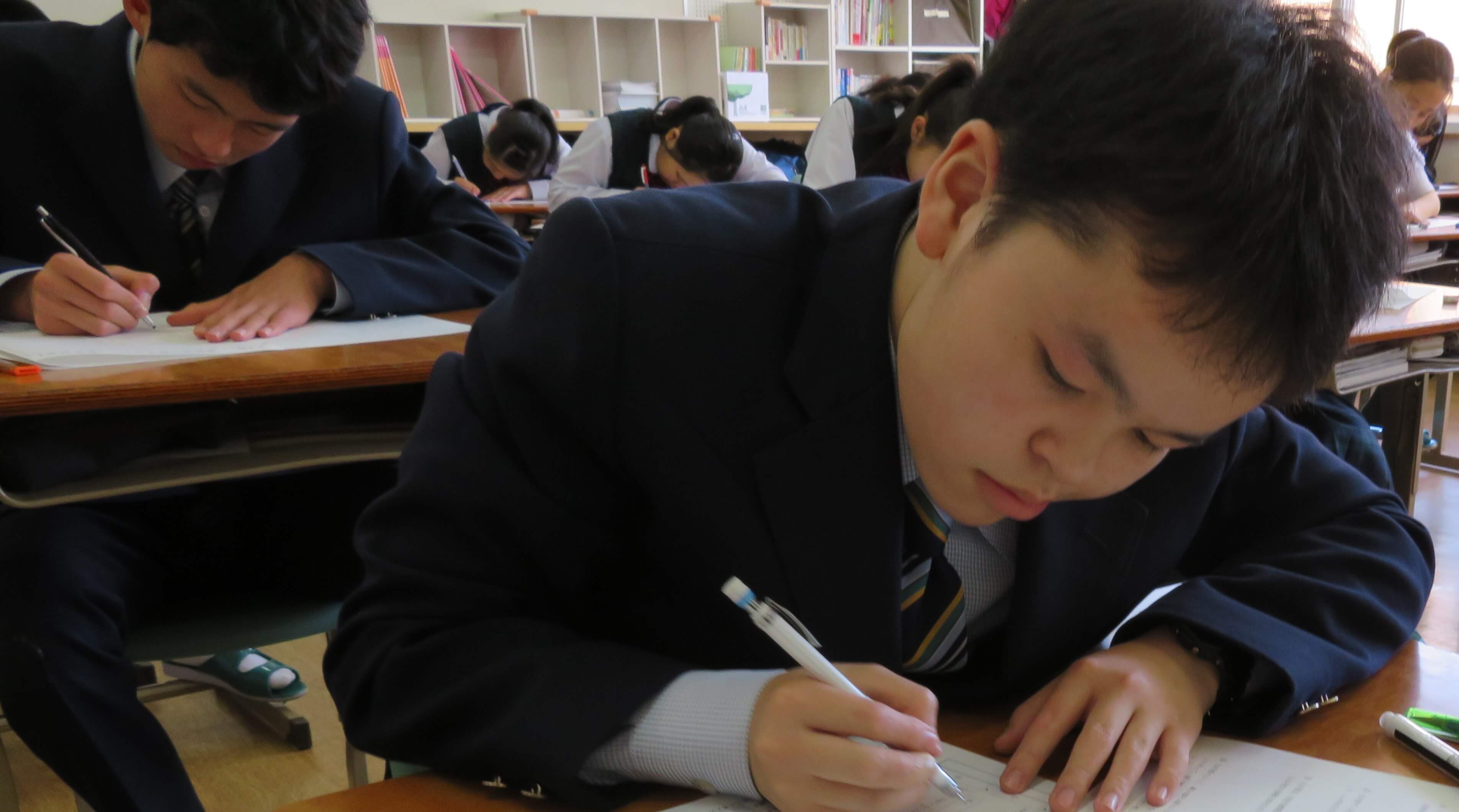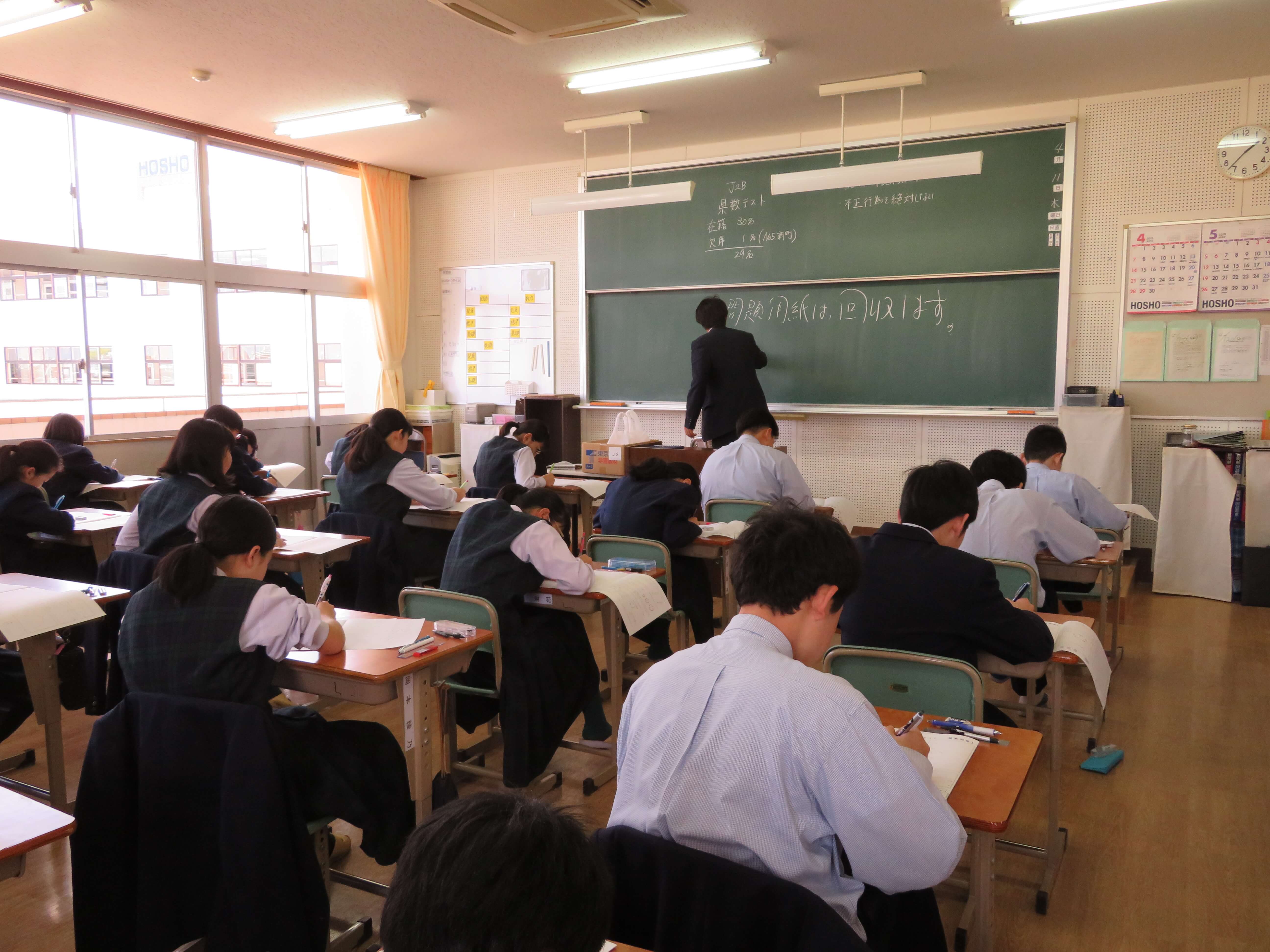 全学年「県数テスト」。黙想も徹底し、落ち着いた状態で取り組んでいました。