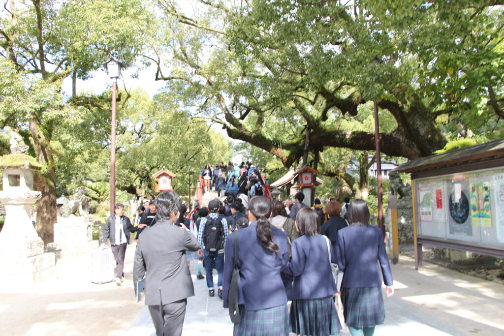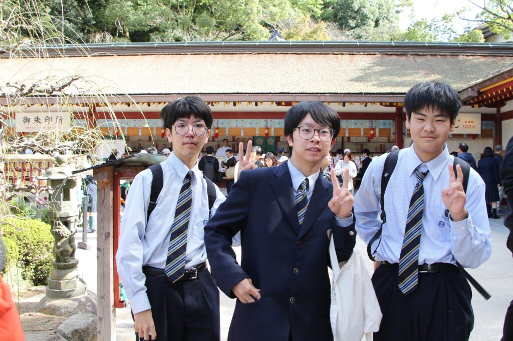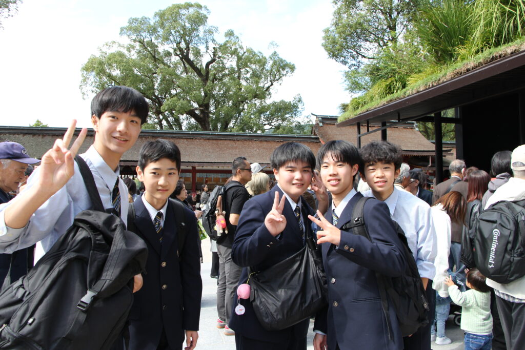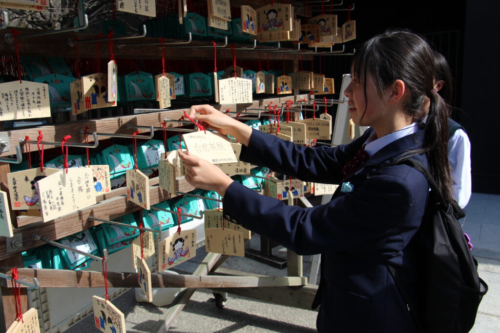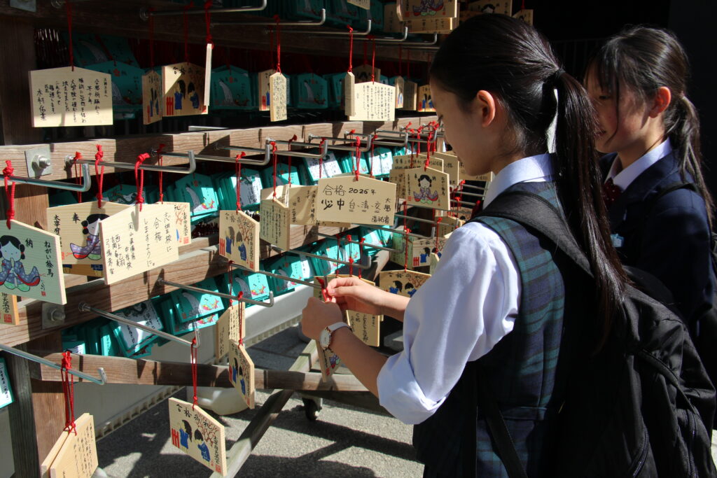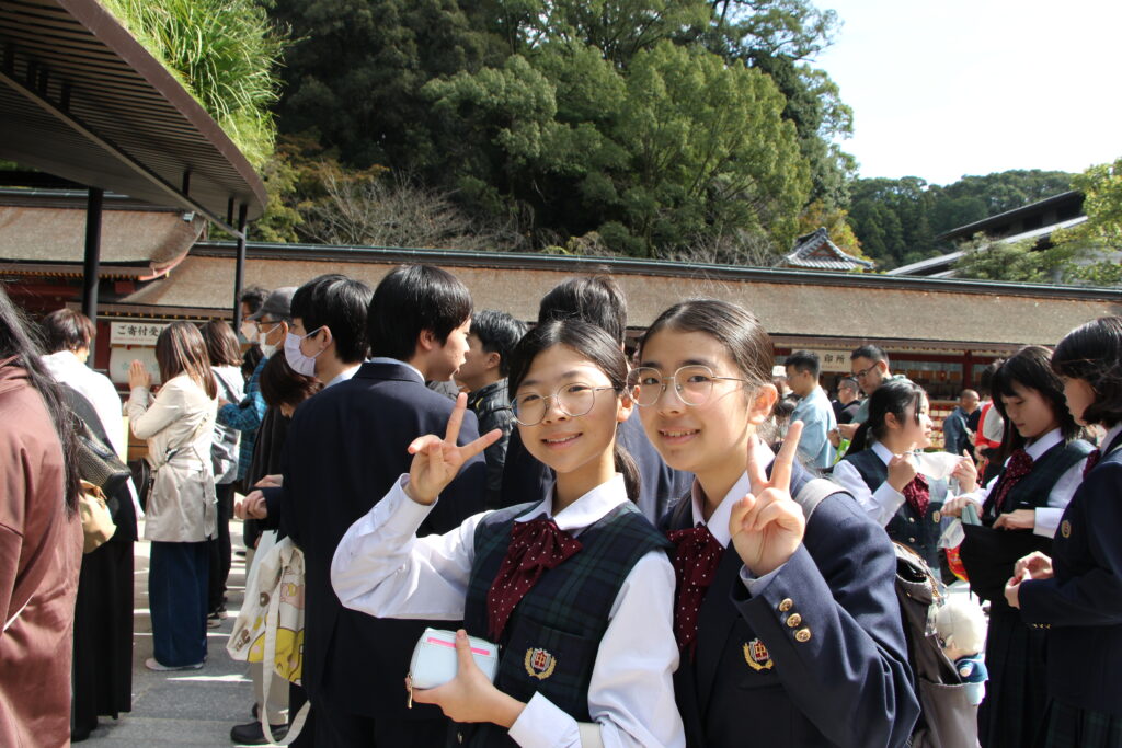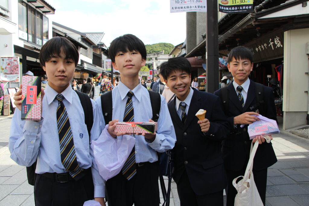 グローバルビレッジプログラムが終了した後は、楽しみにしていた太宰府天満宮参拝です。成績向上や合格を祈願してお参りや、おみくじをひいたりしていました。またJ2生から中高一貫の18期生の先輩方に合格を願って絵馬を書きました。その後は参道で、お土産を買ったり、食べ歩きをしたりと、楽しんでいました。