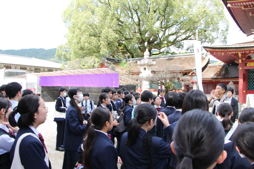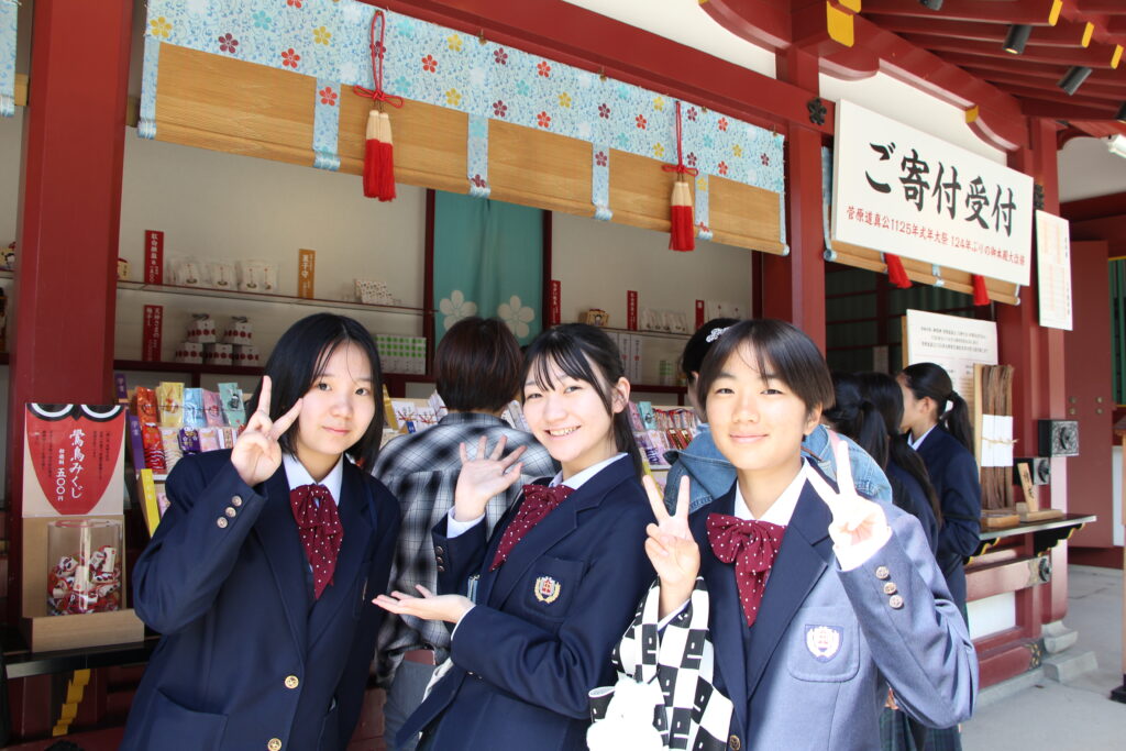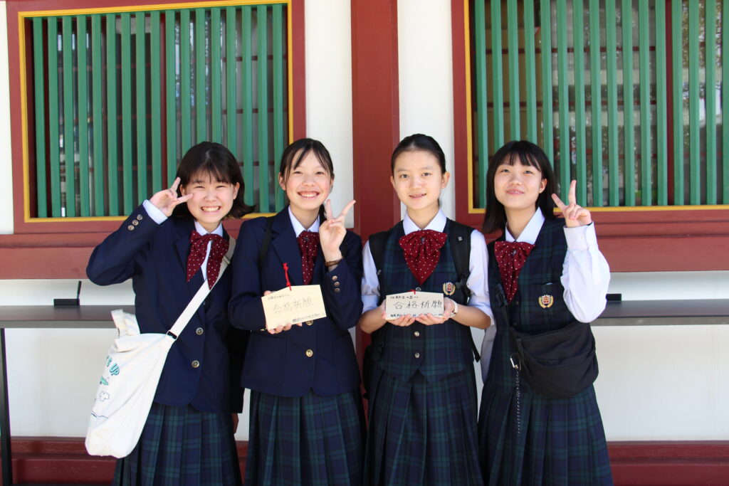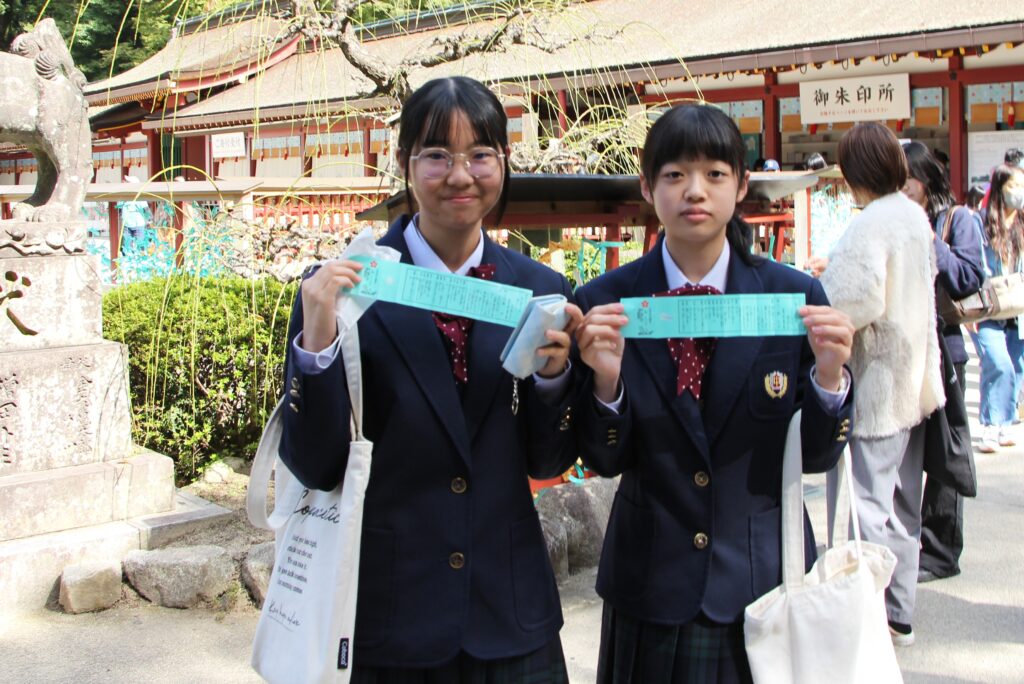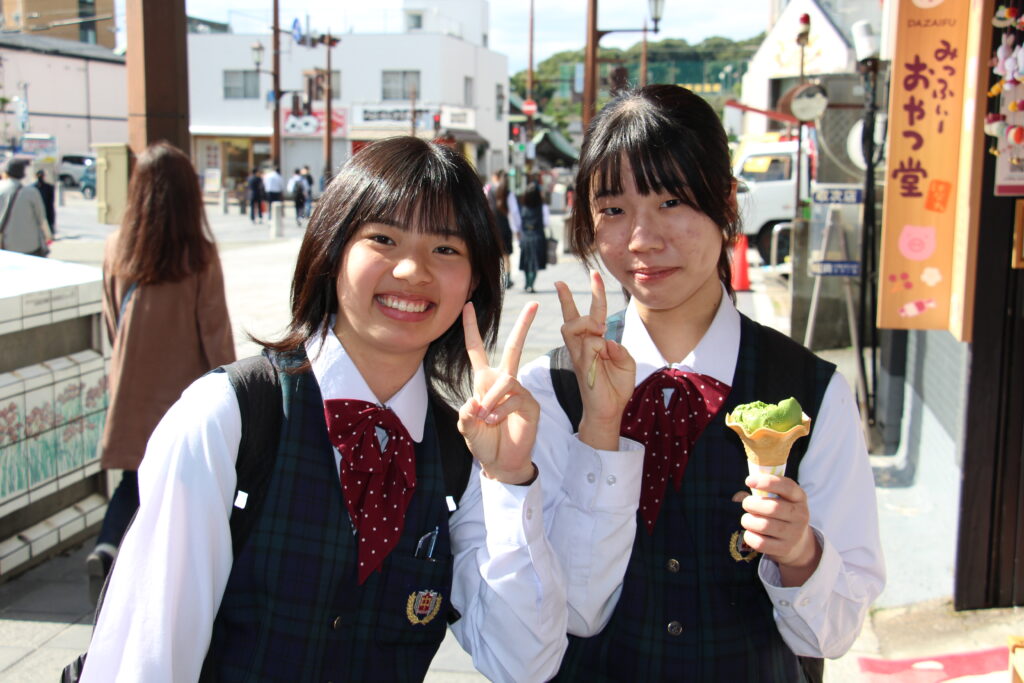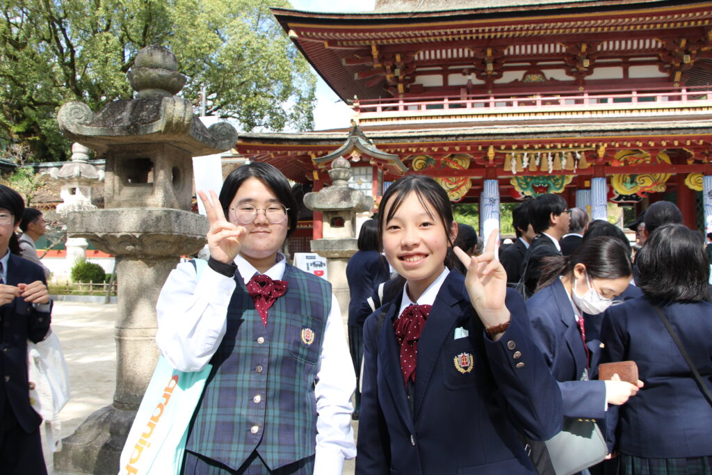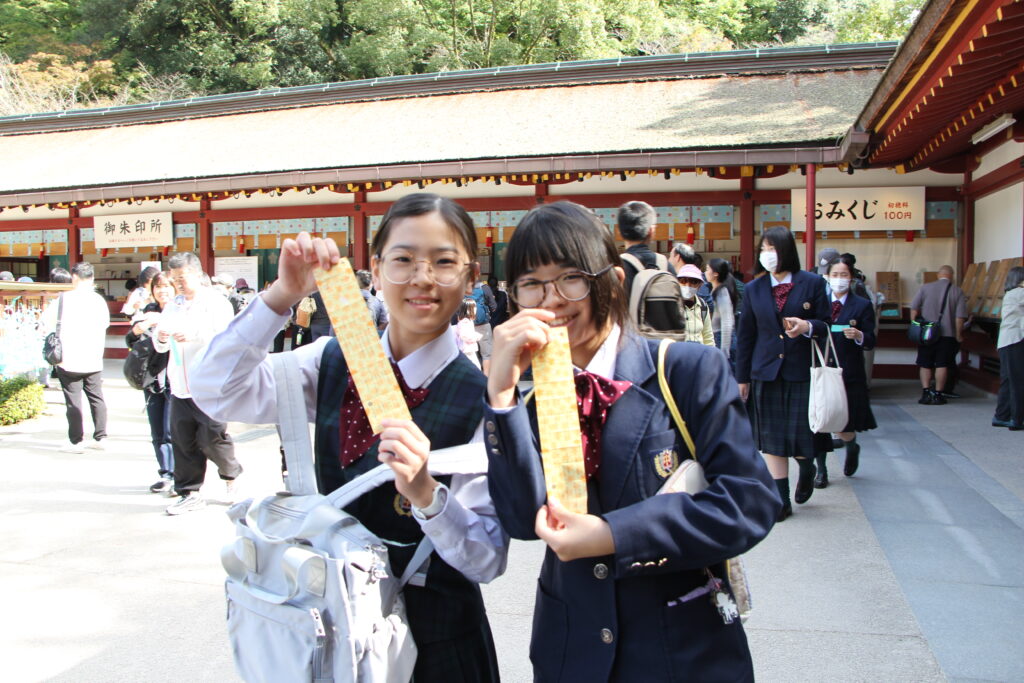 グローバルビレッジプログラムが終了した後は、楽しみにしていた太宰府天満宮参拝です。成績向上や合格を祈願してお参りや、おみくじをひいたりしていました。またJ2生から中高一貫の18期生の先輩方に合格を願って絵馬を書きました。その後は参道で、お土産を買ったり、食べ歩きをしたりと、楽しんでいました。