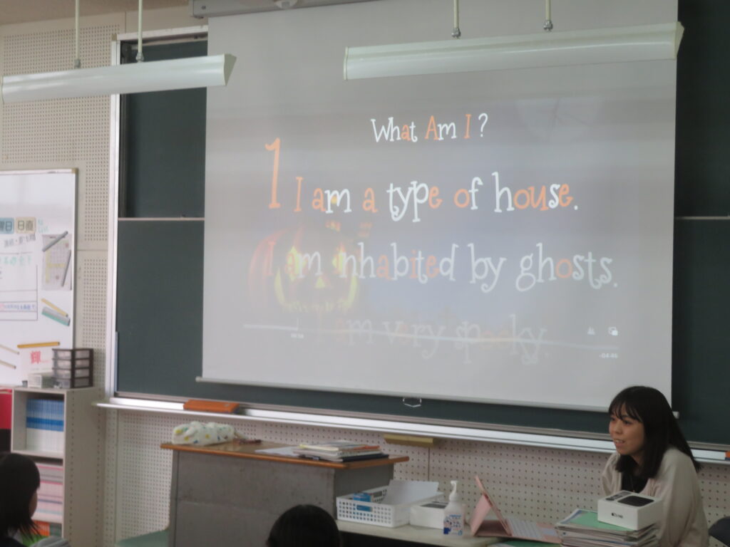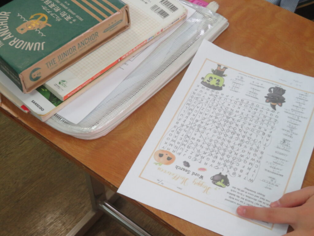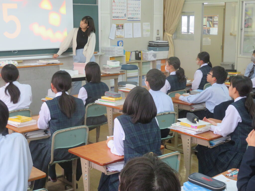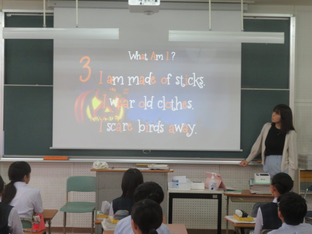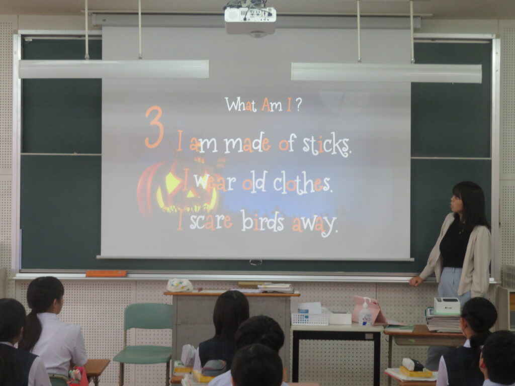 本日は、ハロウィンですね。日本では、本来の感謝祭(収穫祭)の意味合いから少し離れたイベントになっている感もありますが、鵬翔中学校では、ESS部のハロウィンパーティーなど楽しい行事の1つとして生徒は過ごしています。J1の英語【発展クラス】では、ハロウィンを題材にした授業が行われました。