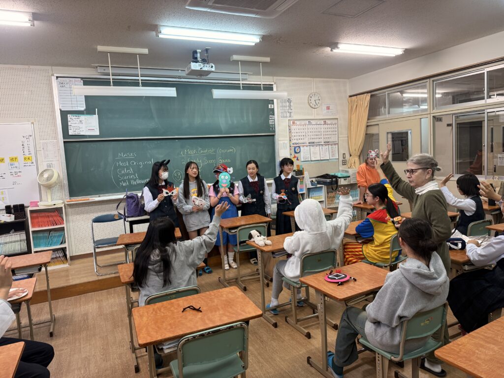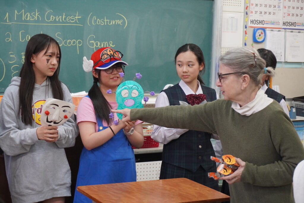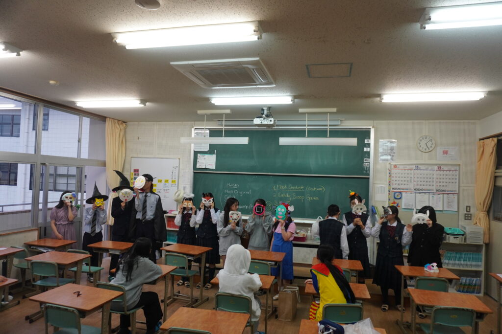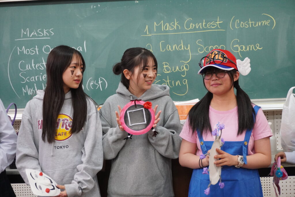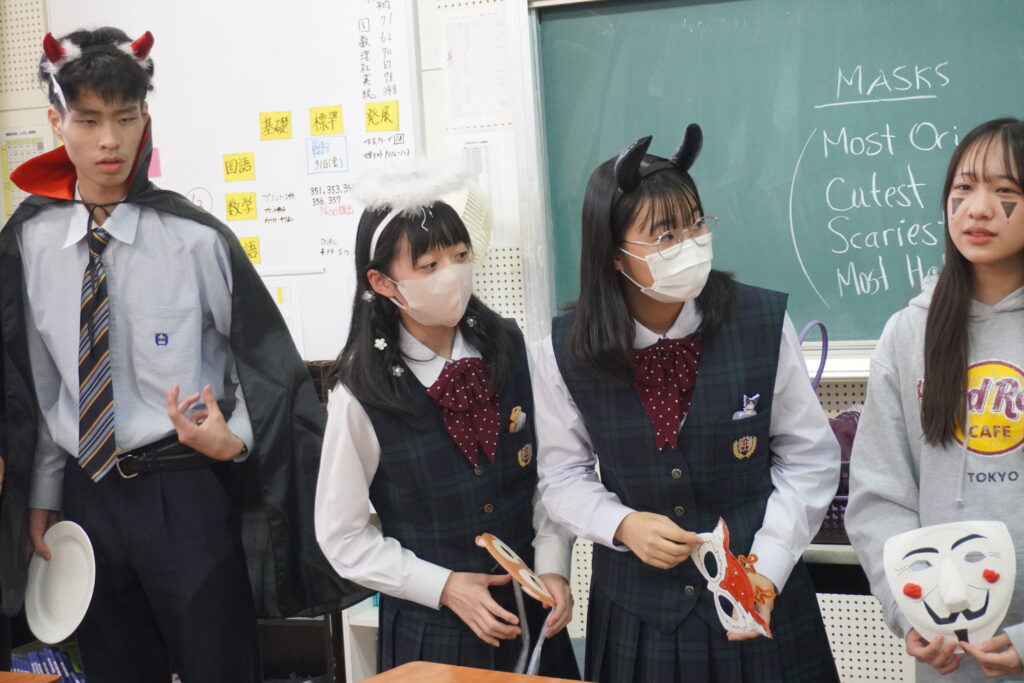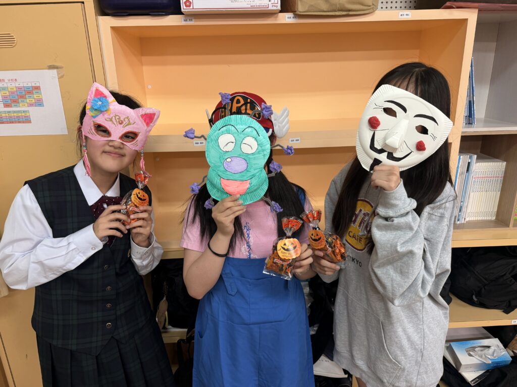 この日のために作成したお面とそれぞれのコスチュームをトンプソン先生、ジェニファー先生に審査してもらいました!審査の結果上位者にはプレゼントが渡されました!もらえた生徒はとても嬉しそうでした。