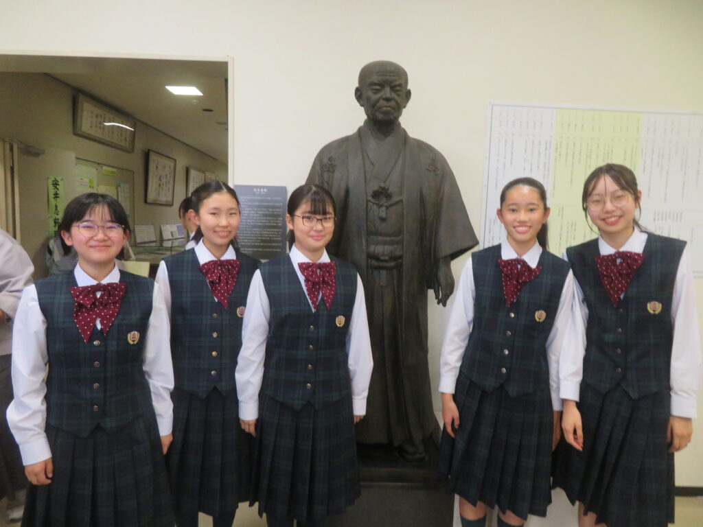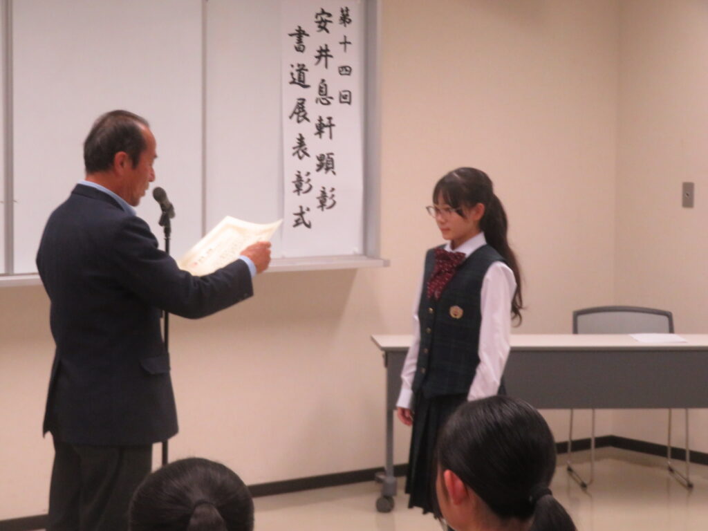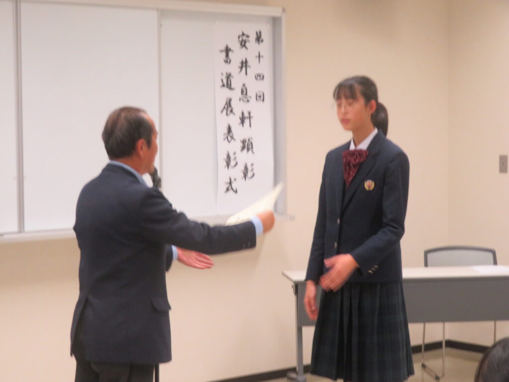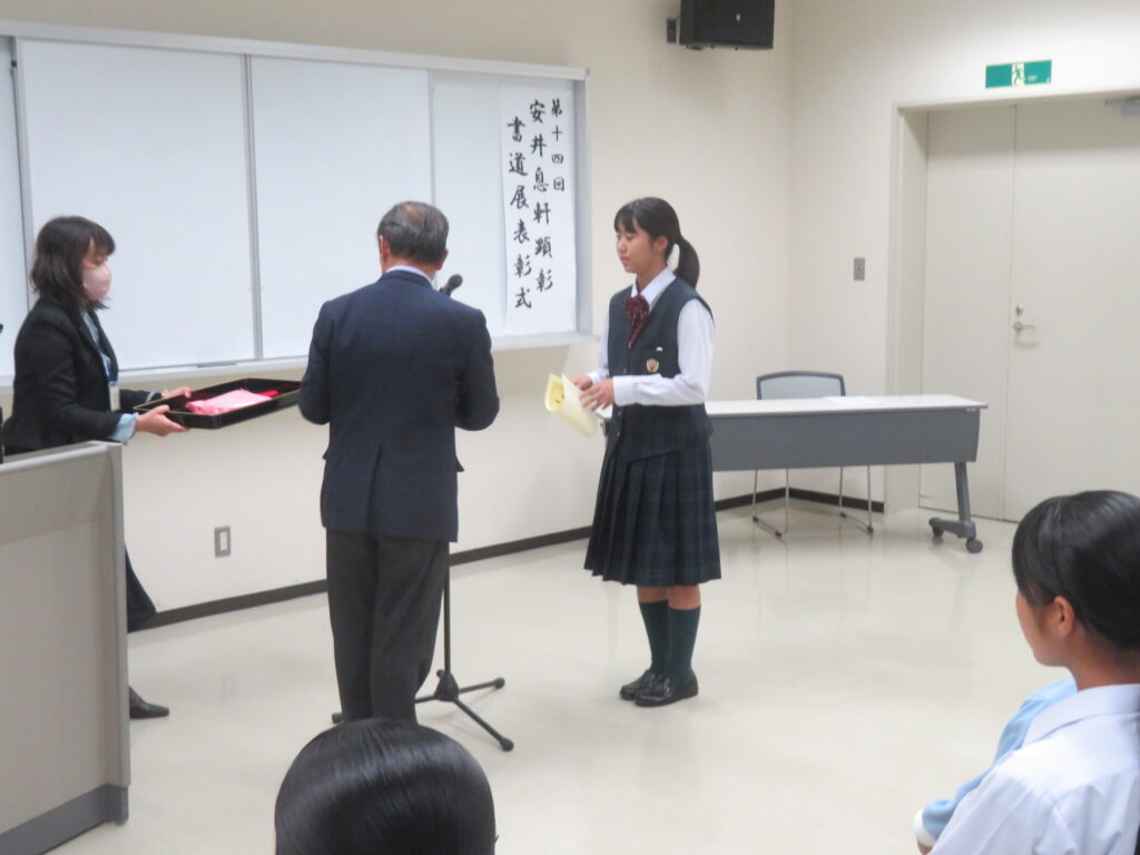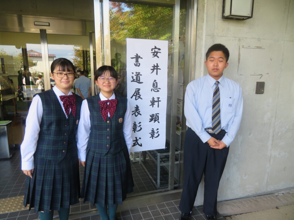 表彰式には家族の方々も多く訪れ、受賞の皆さんの功績を称えていました。伊東館長さんのお話では、作品としての揮毫(きごう)のみでなく、名前の文字の出来栄えも評価したとのことで、今回も多くの力作が寄せられたことを喜んでおられました。また、鵬翔中学校からは毎年多く作品を寄せてもらい、感謝しているとも話されていました。表彰の前後には安井息軒記念館内の展示資料等を観覧する生徒の皆さんの姿も見られ、なかなか訪れることの少ない記念館の、貴重な展示資料等に触れる機会ともなっていたようです。今回、入賞をのがしたものの、作品創作に挑戦したすべての生徒の皆さんの努力を称え、今後のさらなる頑張りに期待したいと思います。