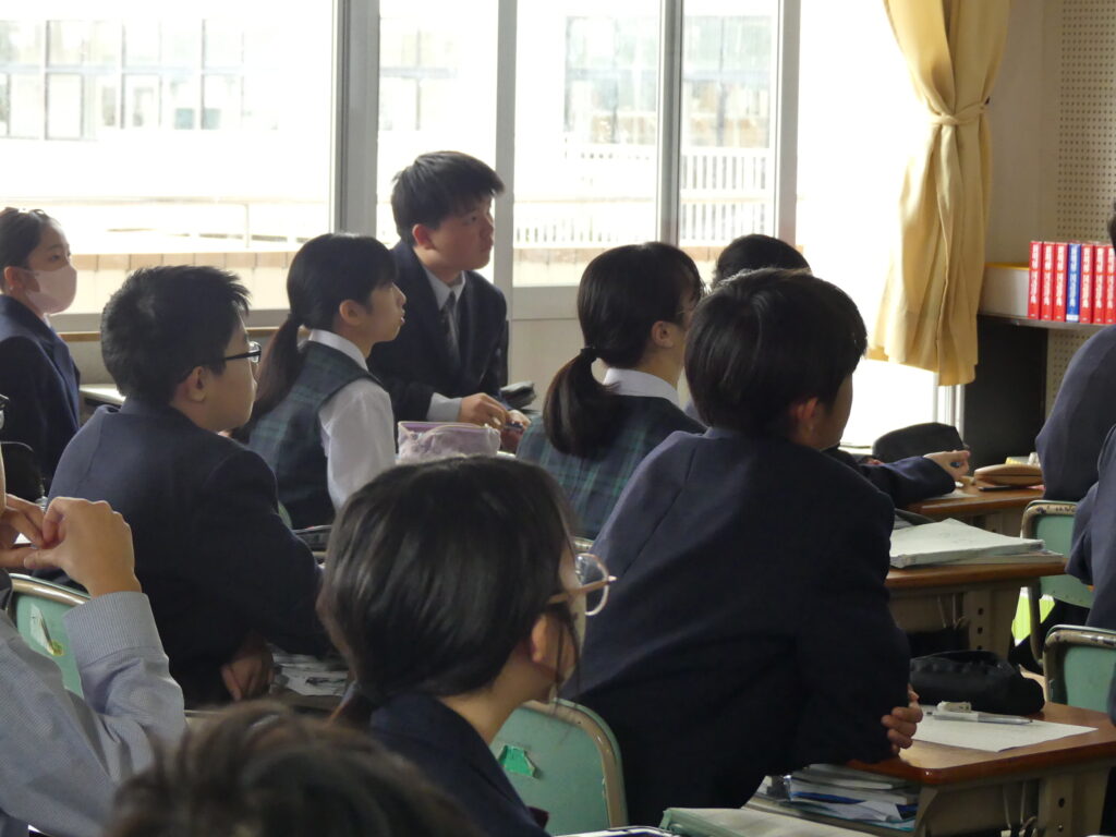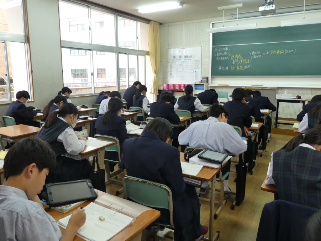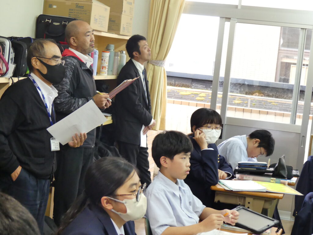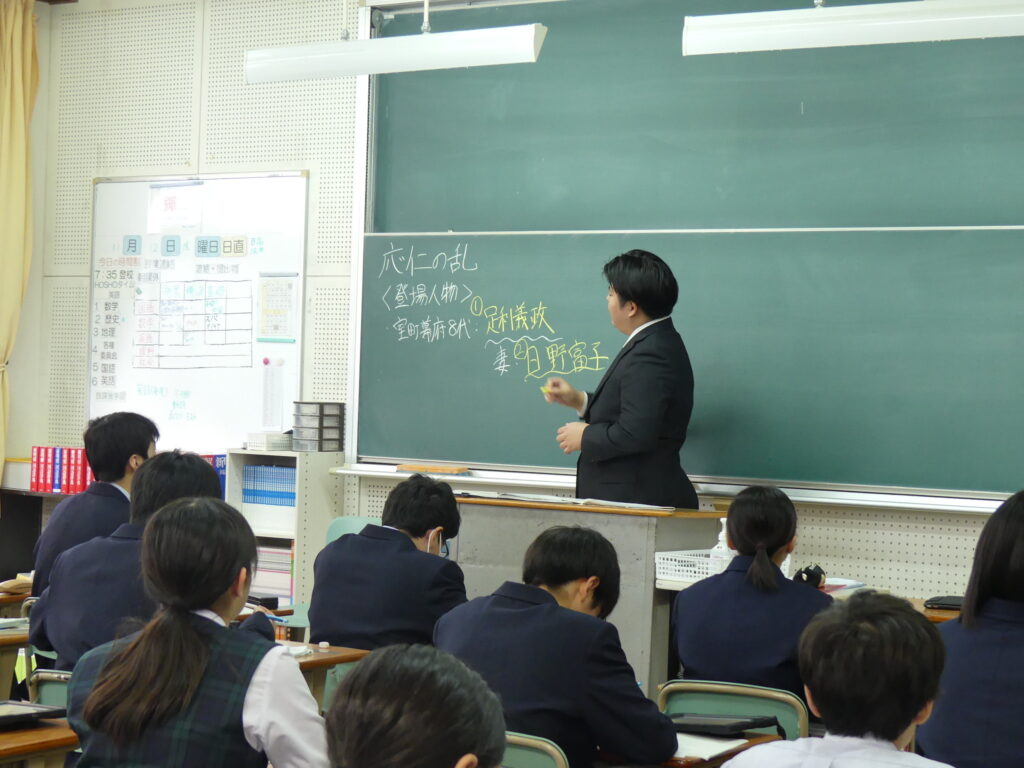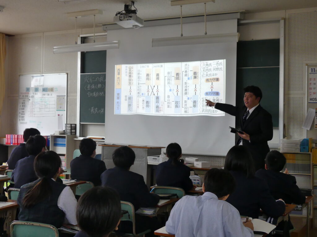 社会科の荒木先生の研究授業がJ1Aで行われました。たくさんの先生方が見学に来られ、生徒たちも少々緊張気味でしたが、「応仁の乱が長期化した理由を推理しよう!」というテーマで授業が始まると、真剣な眼差しで授業に集中していました。