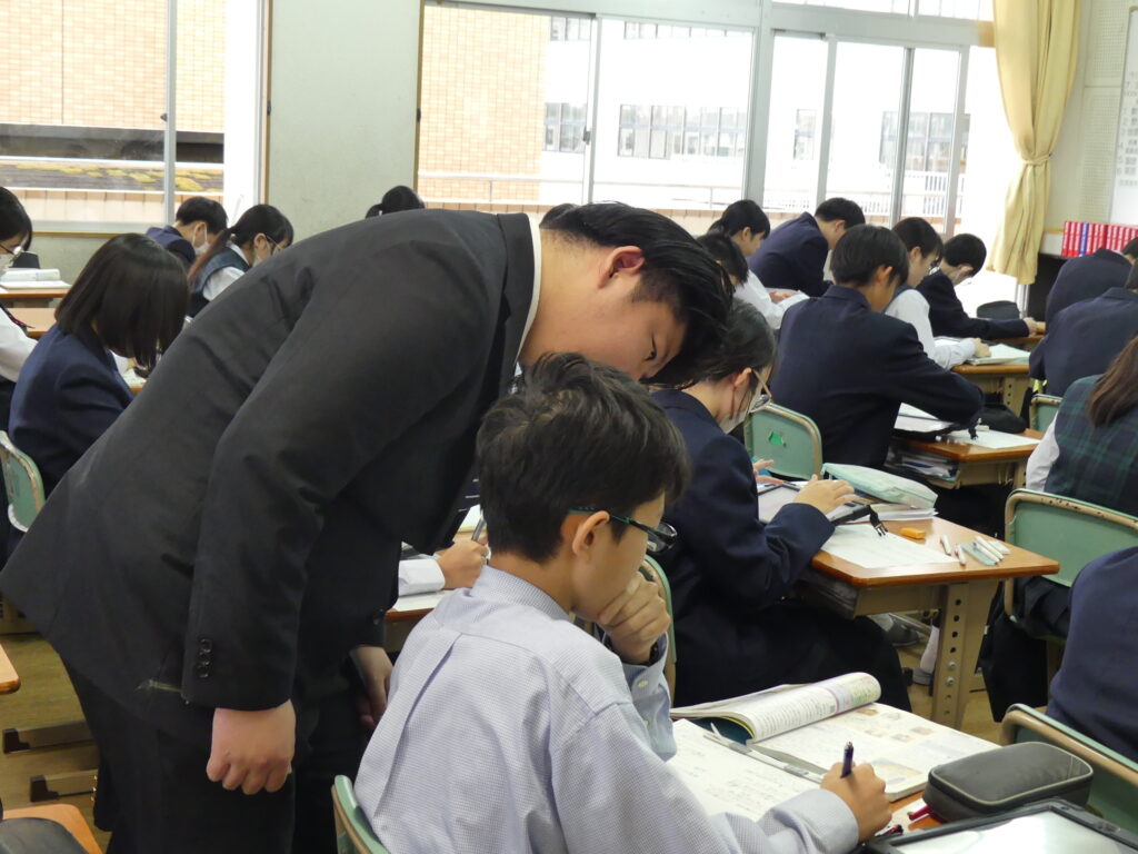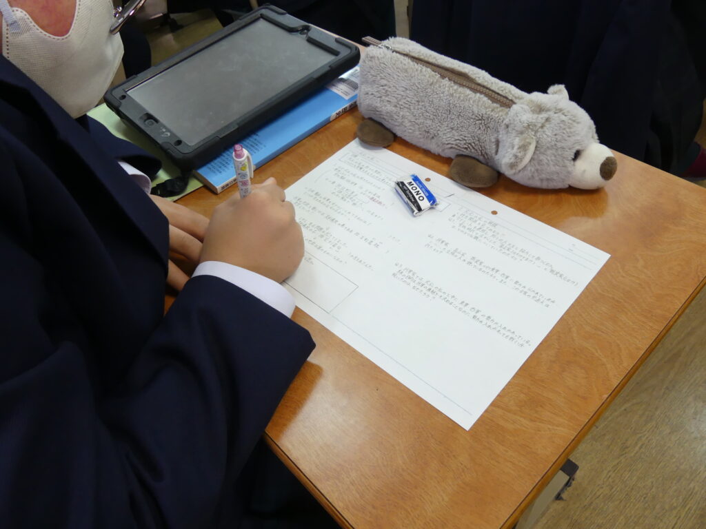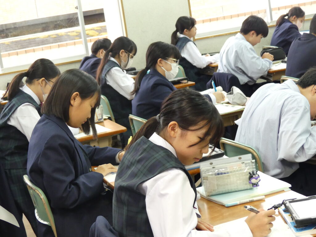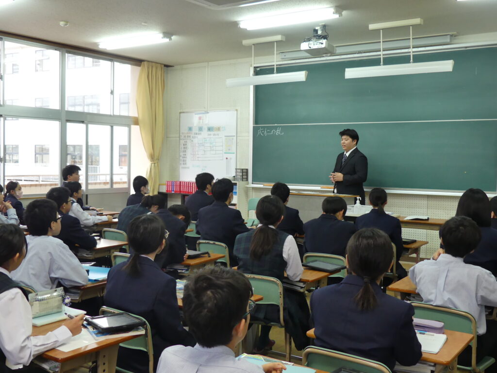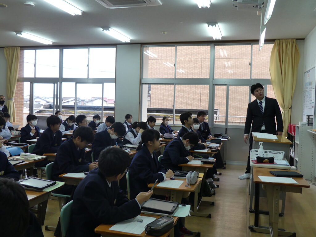 社会科の荒木先生の研究授業がJ1Aで行われました。たくさんの先生方が見学に来られ、生徒たちも少々緊張気味でしたが、「応仁の乱が長期化した理由を推理しよう!」というテーマで授業が始まると、真剣な眼差しで授業に集中していました。