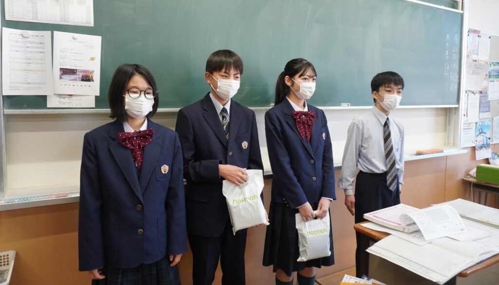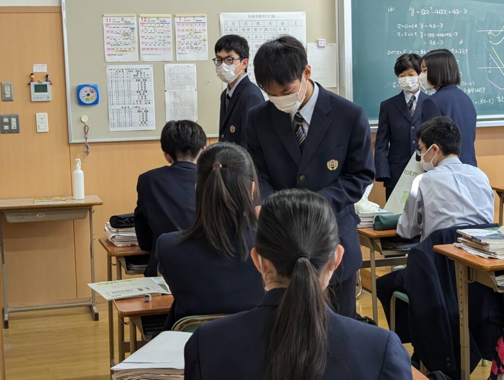 本日、特進英数科中高一貫3年生の先輩方のところへ、中学生を代表して生徒会のメンバーが合格タオルを届けに行きました!!この合格タオルは、毎年、鵬翔中学校の生徒と保護者の皆さんから激励の気持ちを込めて贈られています。