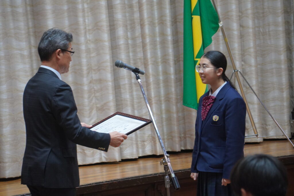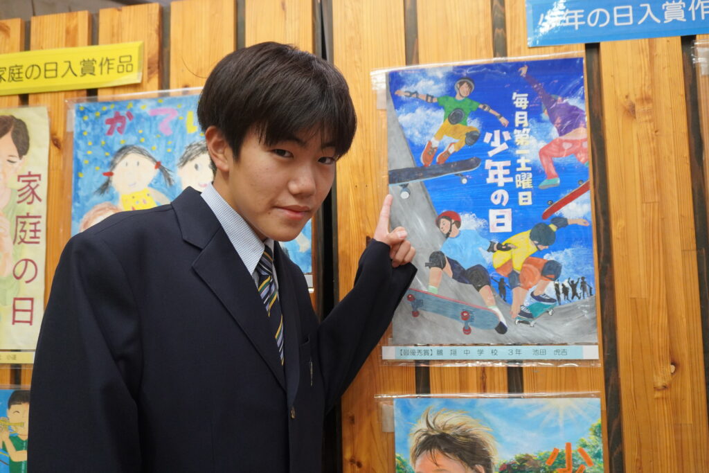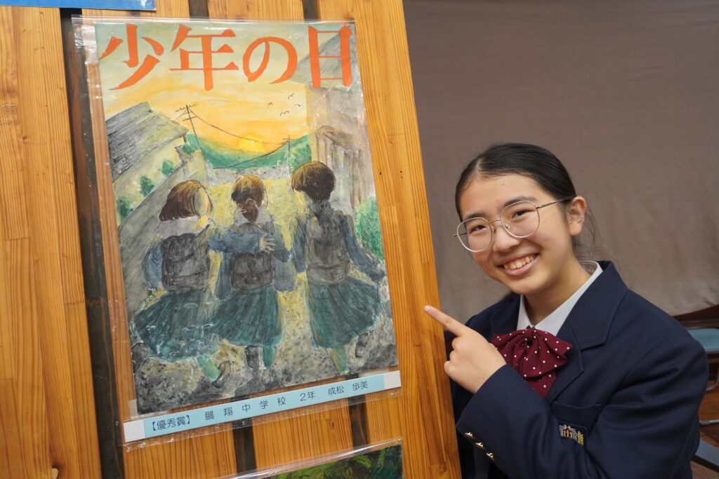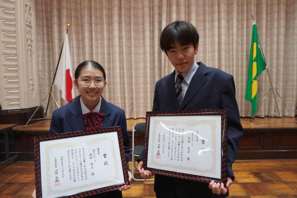昨日、少年の日ポスターコンクールにおいて、J3-A池田虎吉さん(宮大附属小出身)が最優秀賞、J2-A成松歩美さん(江南小出身)が優秀賞を受賞し、表彰式へ参加しました。