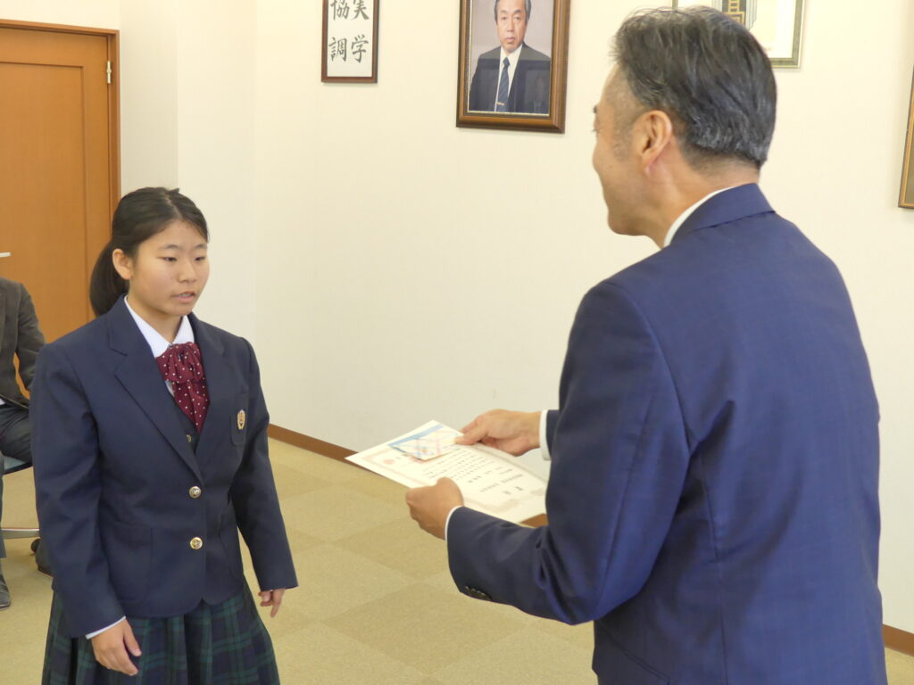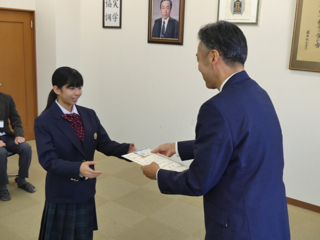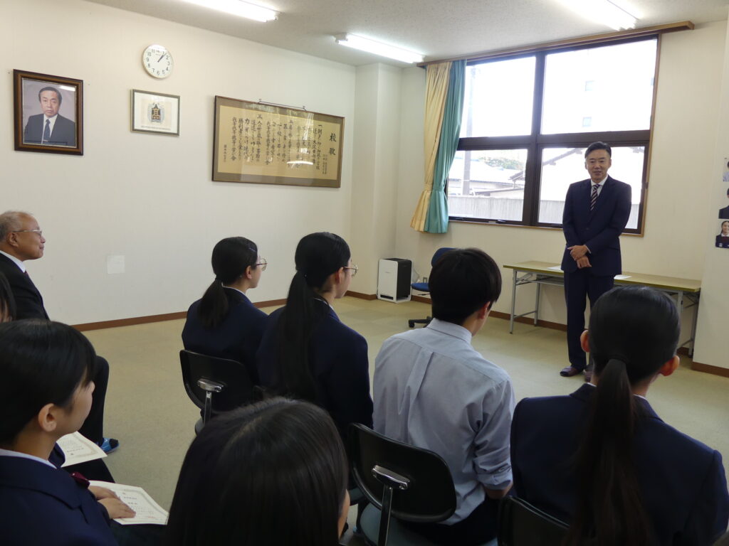 11月21日(金)に「第63回中学生作文コンクール」の表彰式を行いました。表彰に際しまして、一般社団法人生命保険協会宮崎県協会事務局長:権田学様にご来訪いただきました。