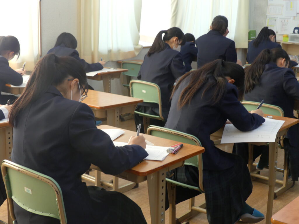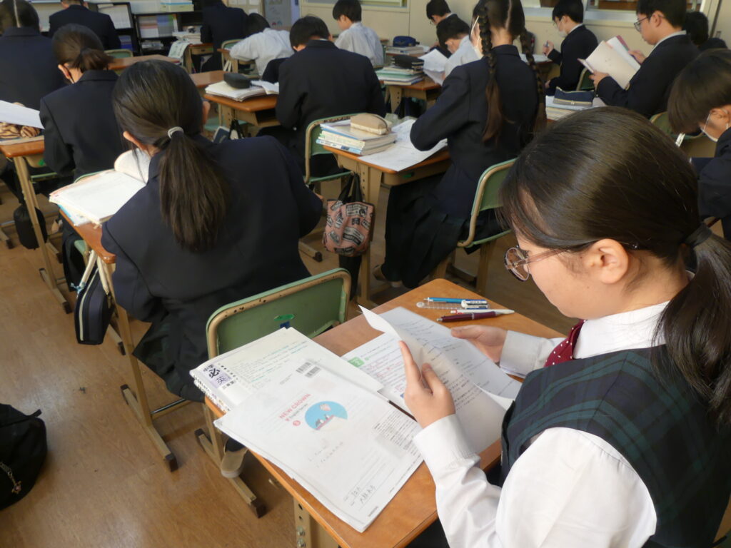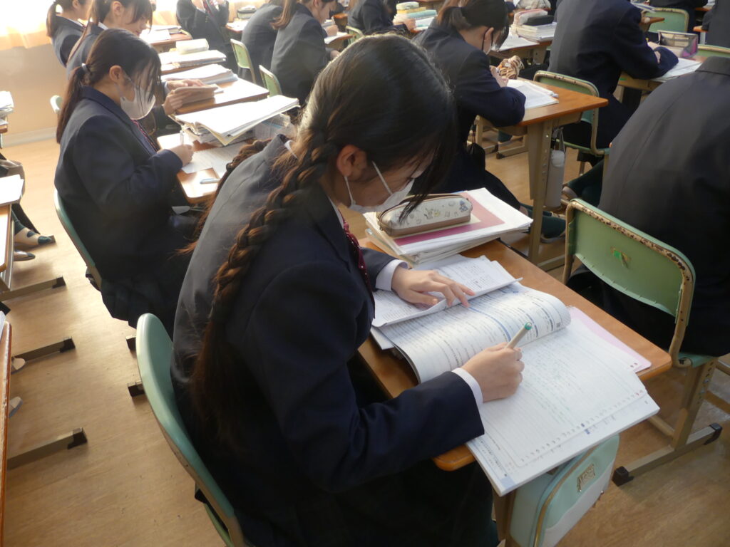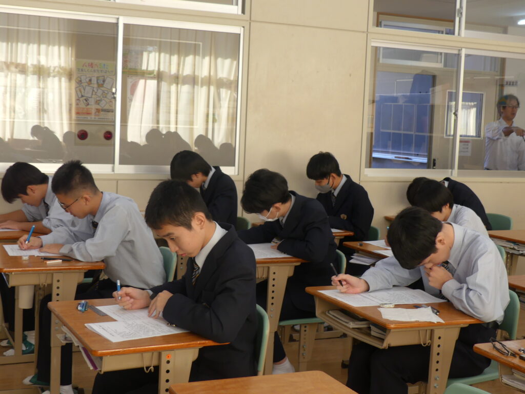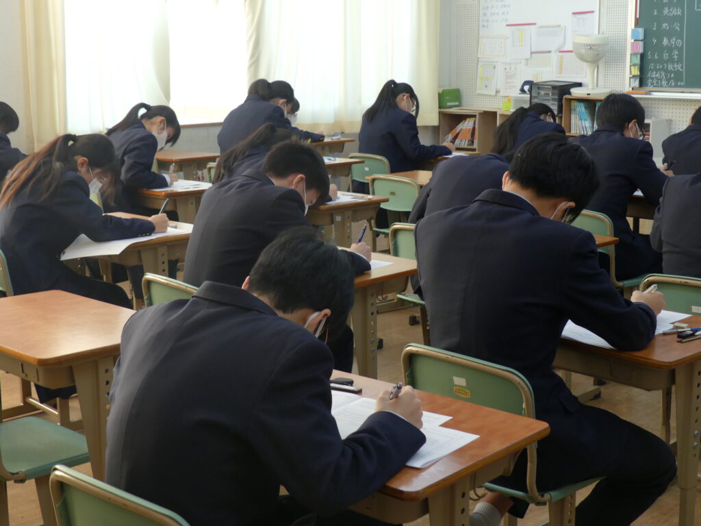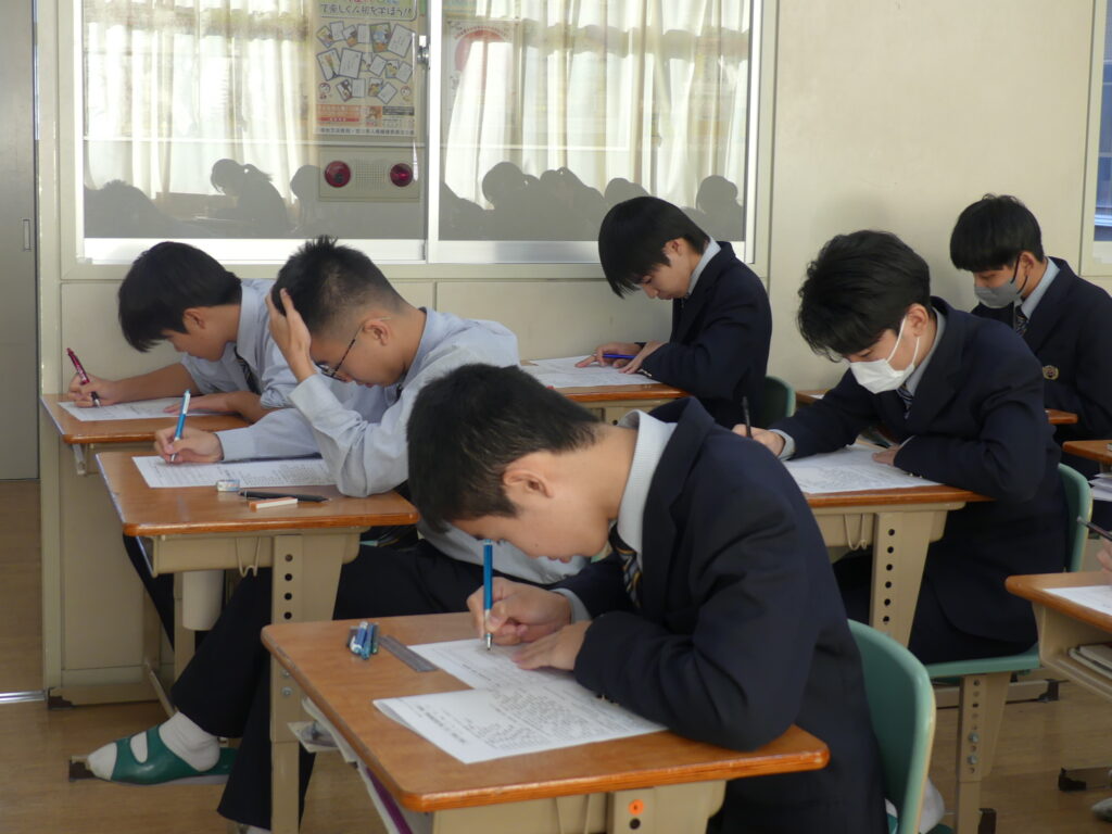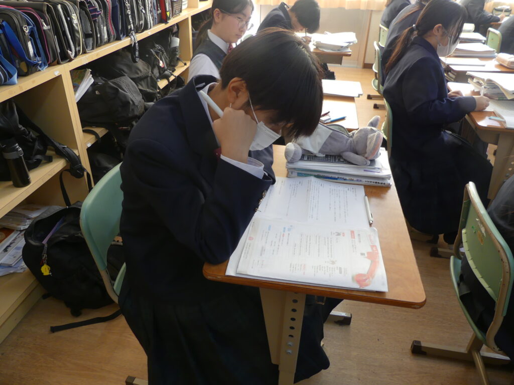 第4回定期考査2日目です。昨日より気温が下がった朝でしたが、感染症予防のため窓を開け喚起を十分に行っています。自学の時間に教室を回ってみると、ノートにたくさんの書き込みをしていたり、シートで答えを確認したりと、定期考査に向き合っている姿がとてもたくましく感じました。