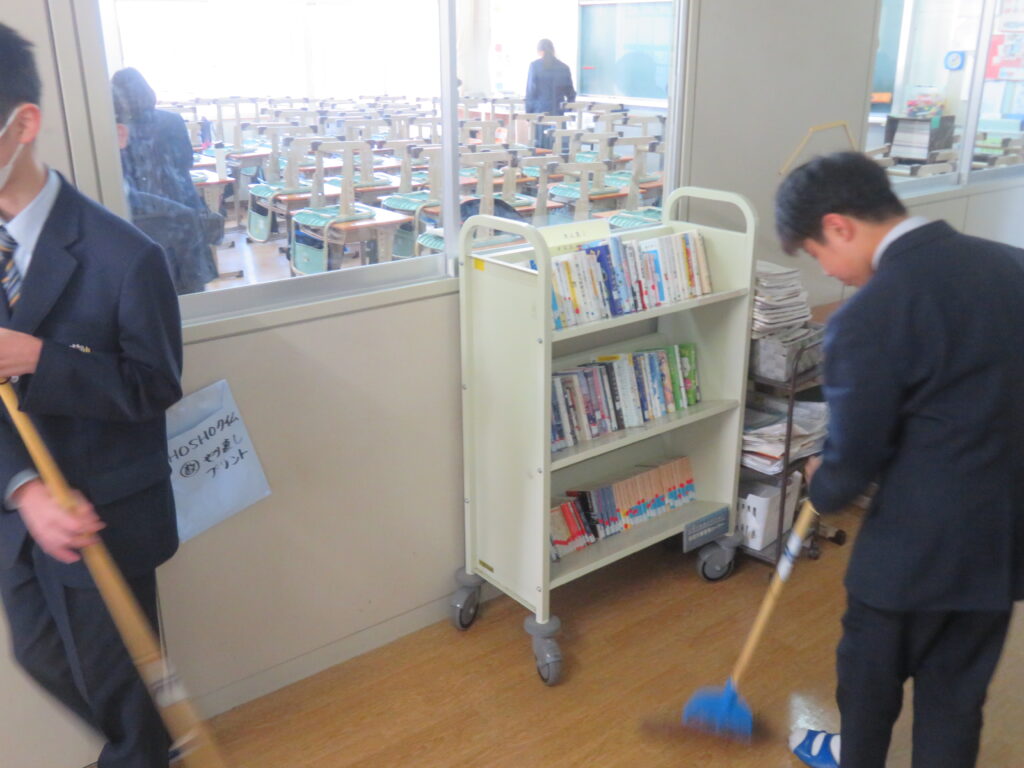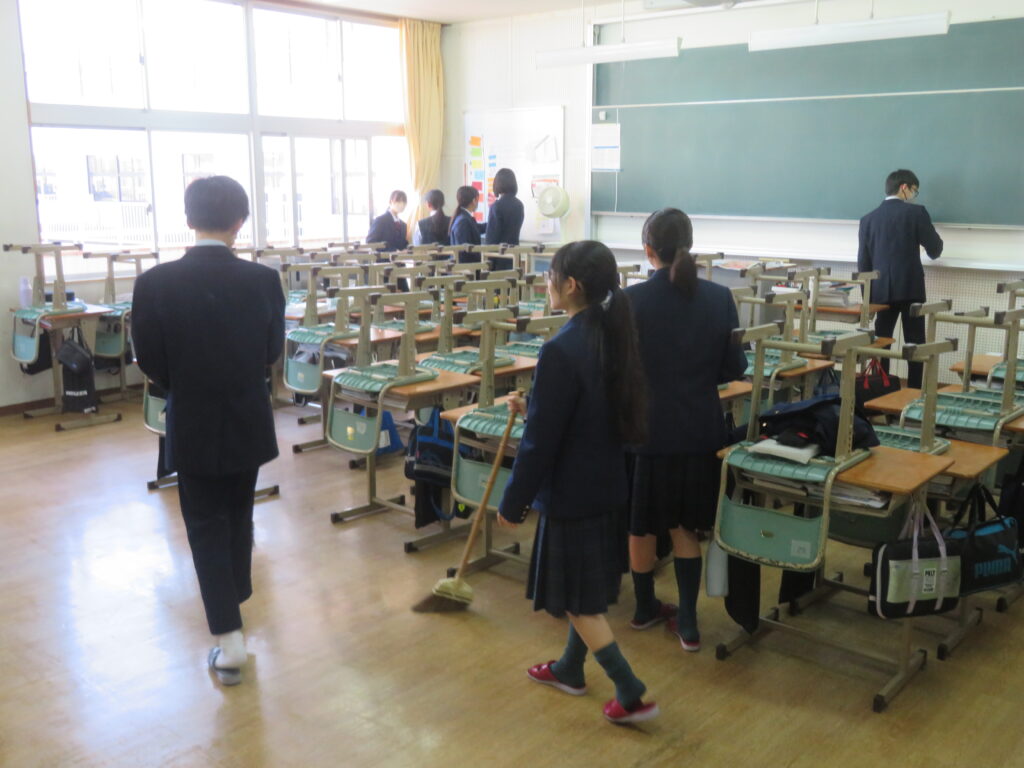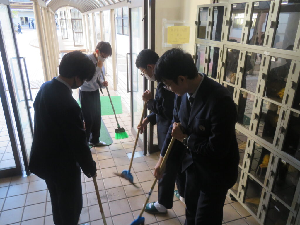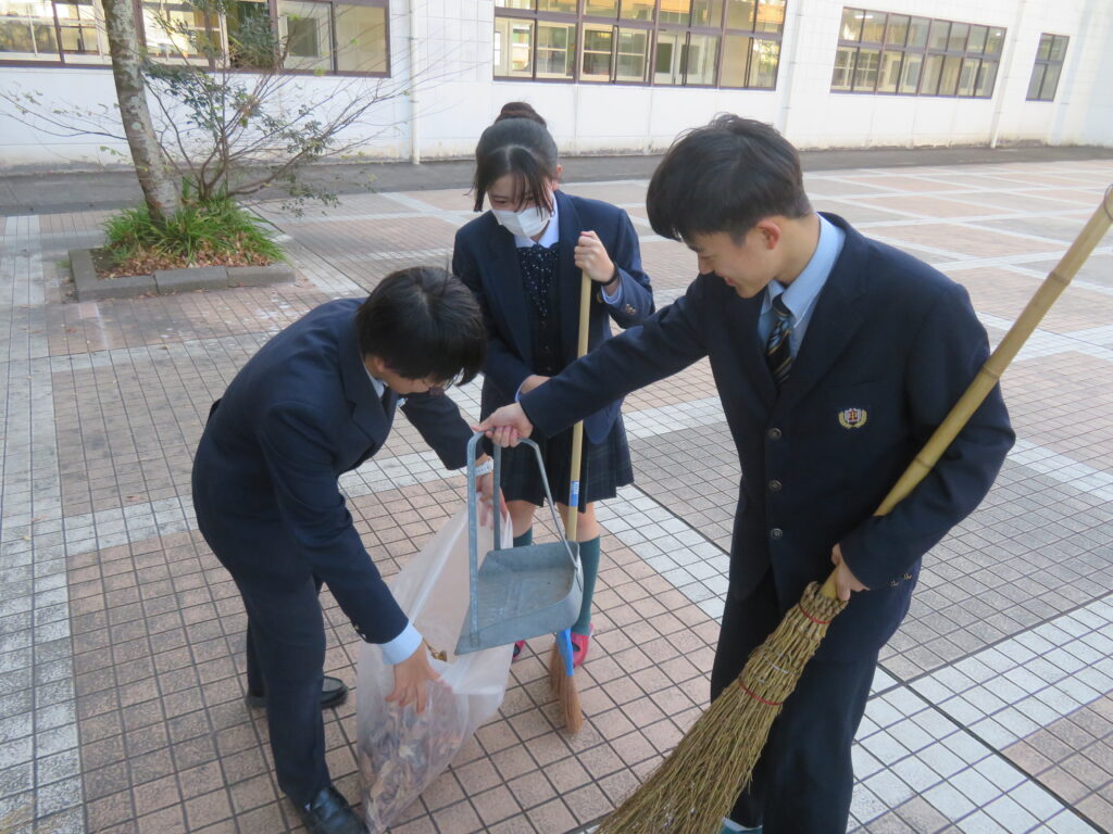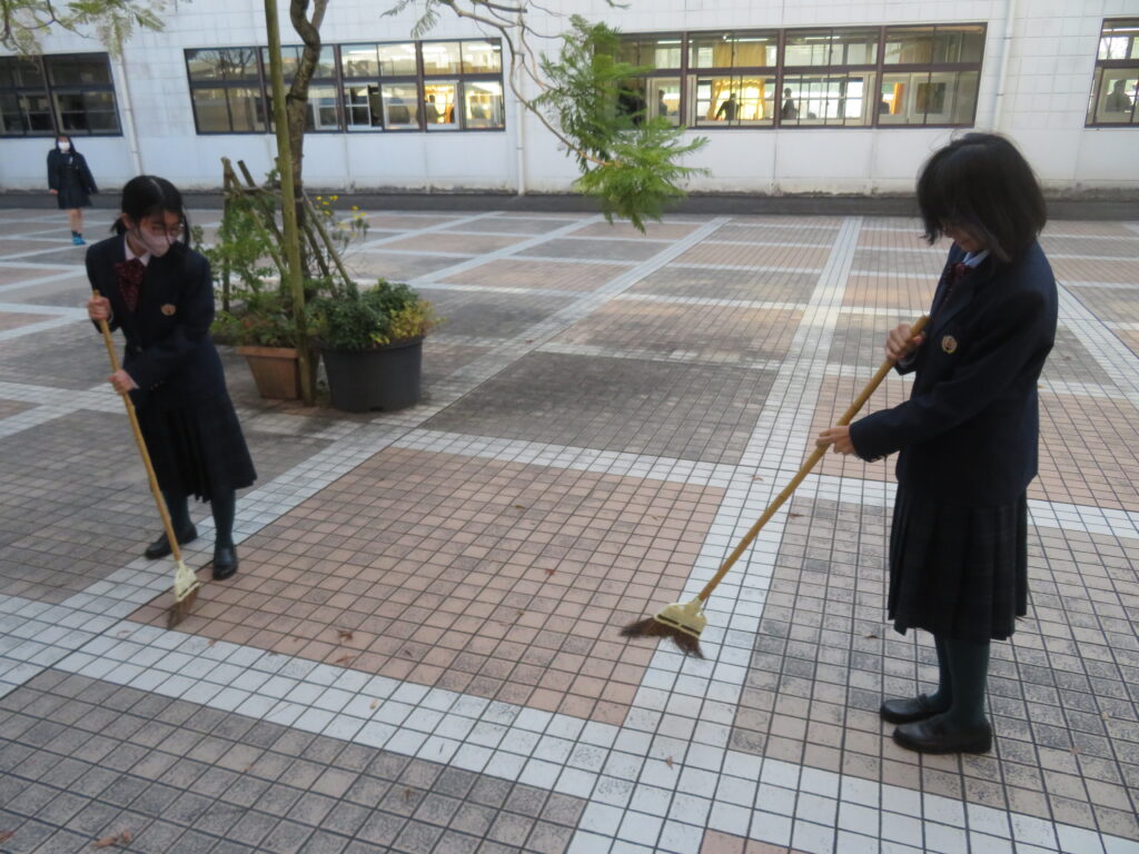 日差しがある日はまだ暖かいですが、曇りの日や風が強い日はやはり冬の寒さを痛感しますね。今日は、毎日の掃除の様子です。鵬翔では、昼休みの後の15分間が清掃の時間です。清掃の後はファミリーで集まり、ファミリーのチューターの先生からお話があり解散します。今日も外回り担当の生徒たちは寒そうにしながら自分たちに割り当てられた場所を丁寧に掃除していました。