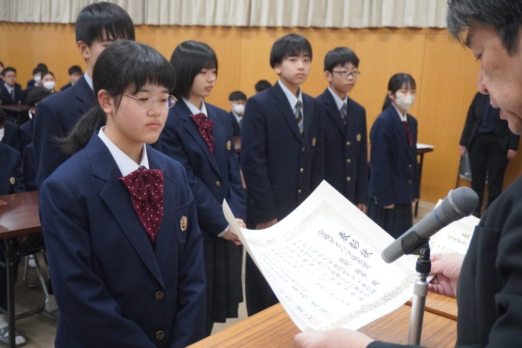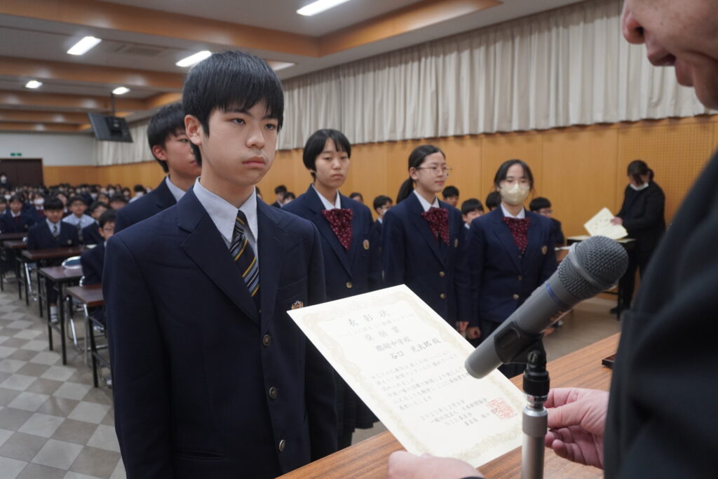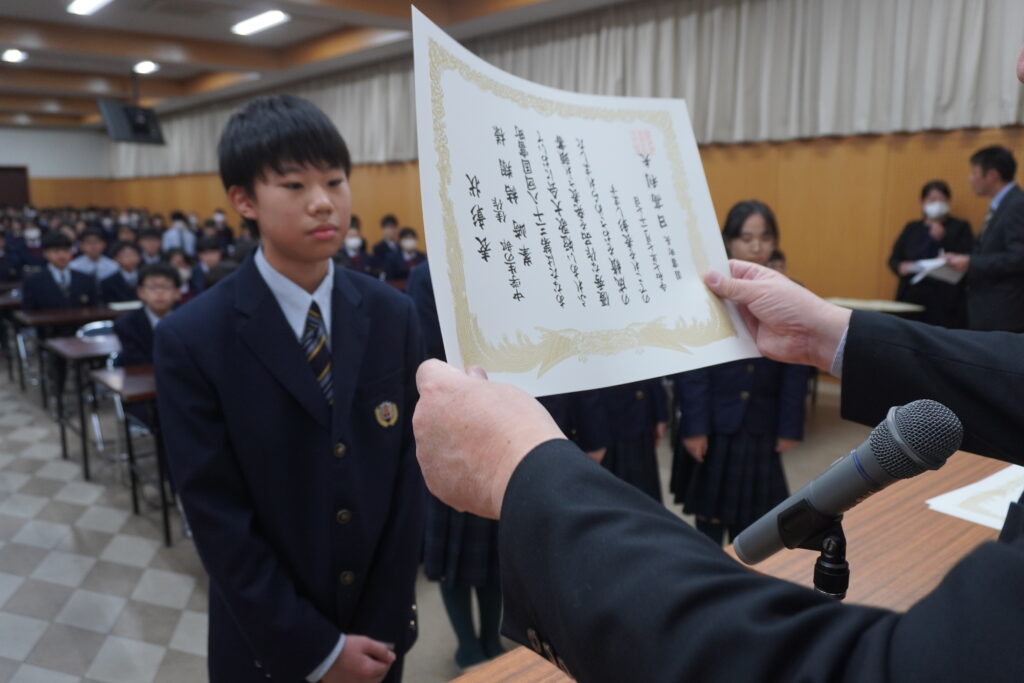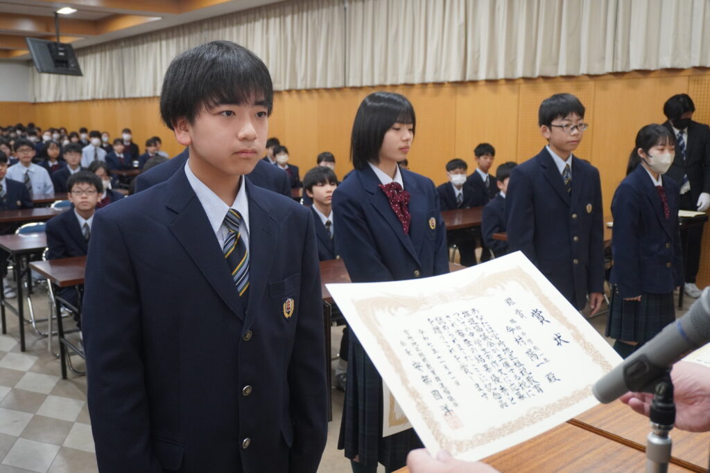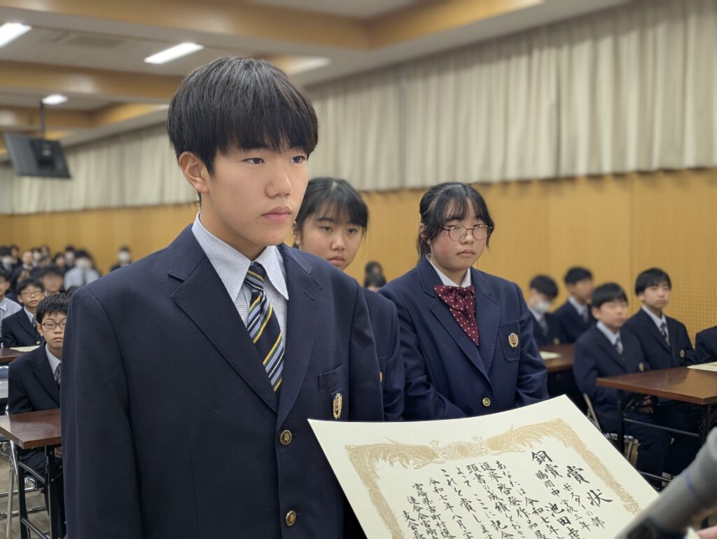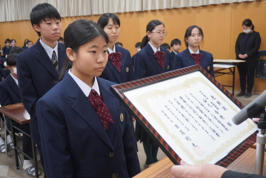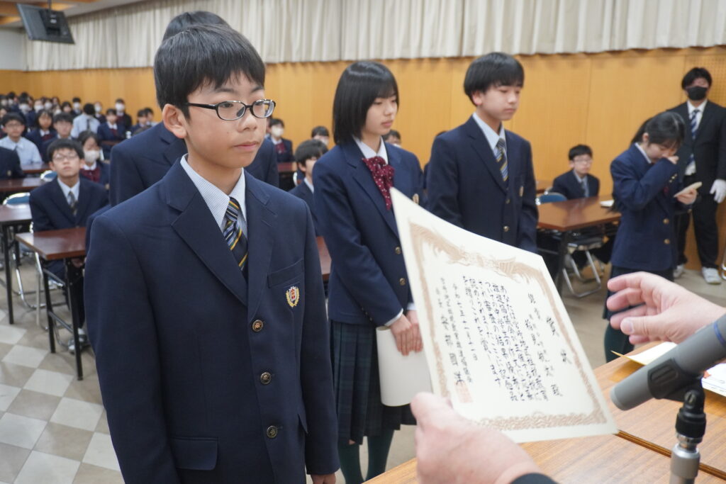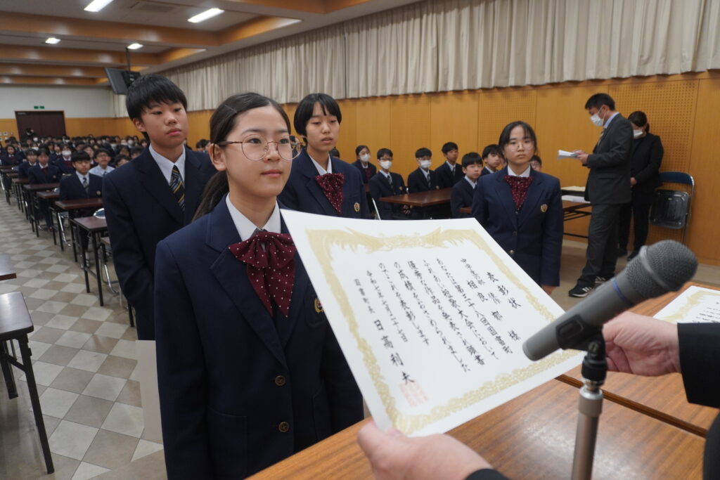 〇 学校奨励賞 代表受取 生徒会長:弓削 龍之介さん(西池小出身)