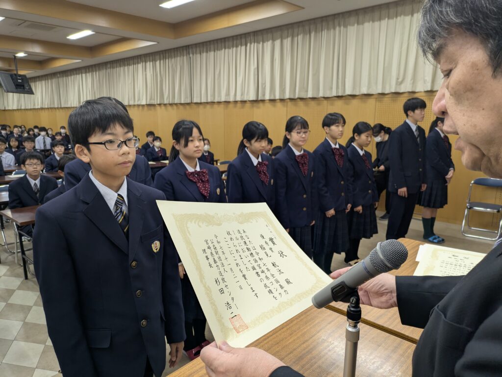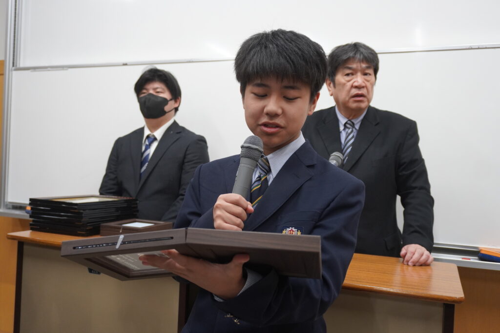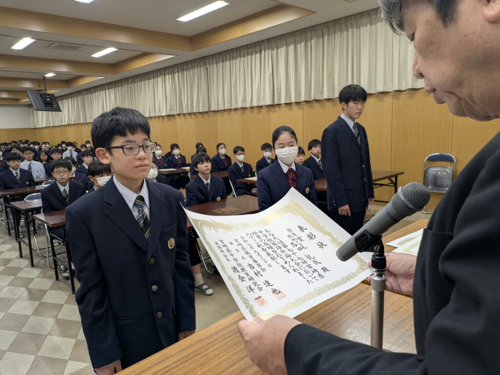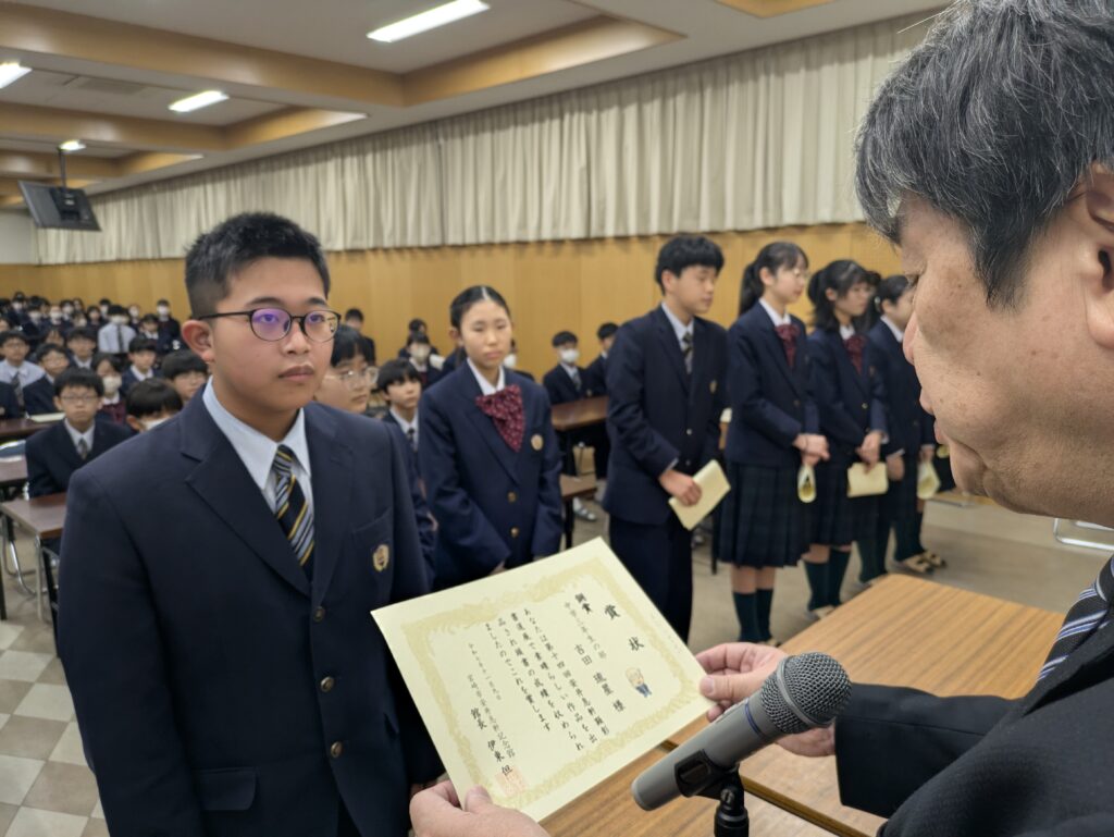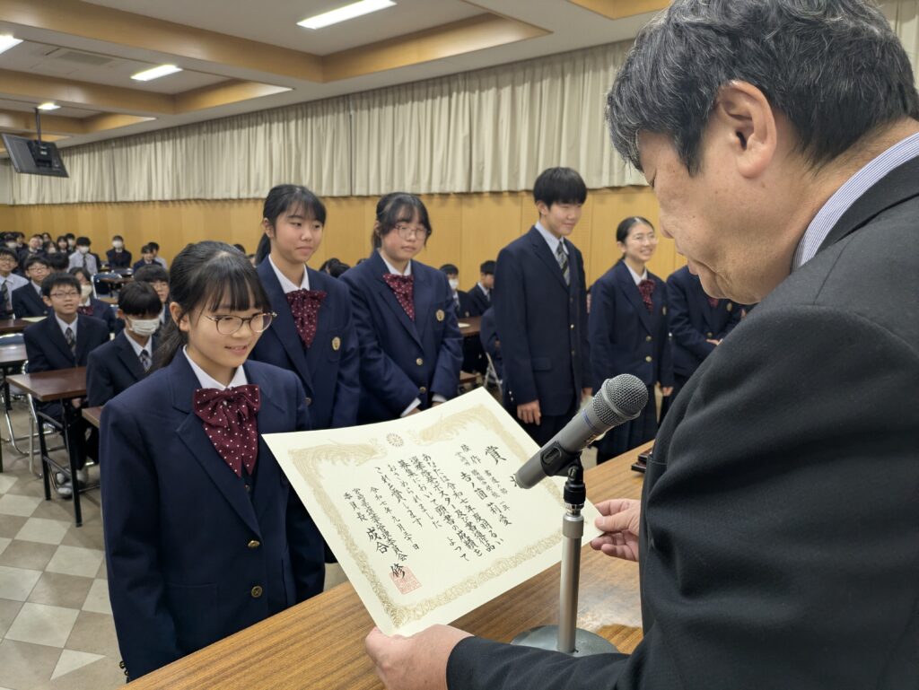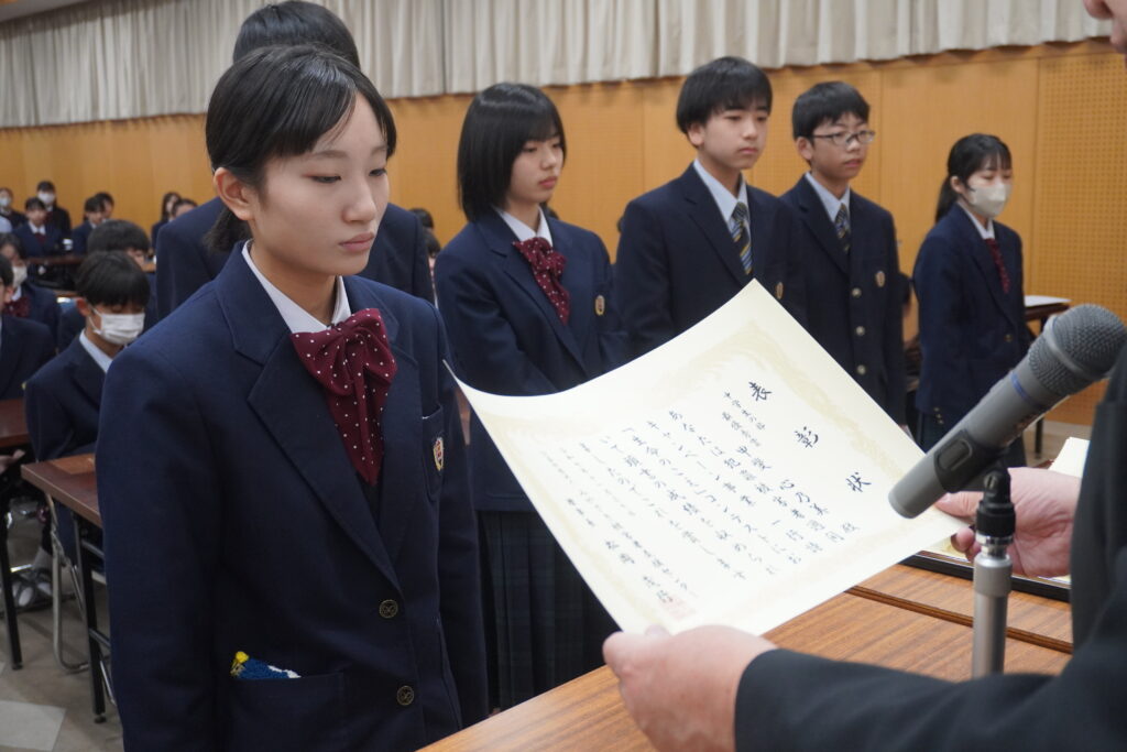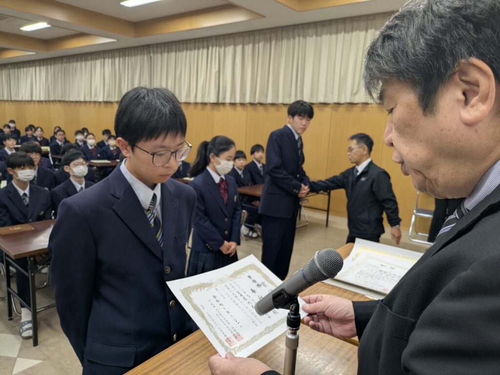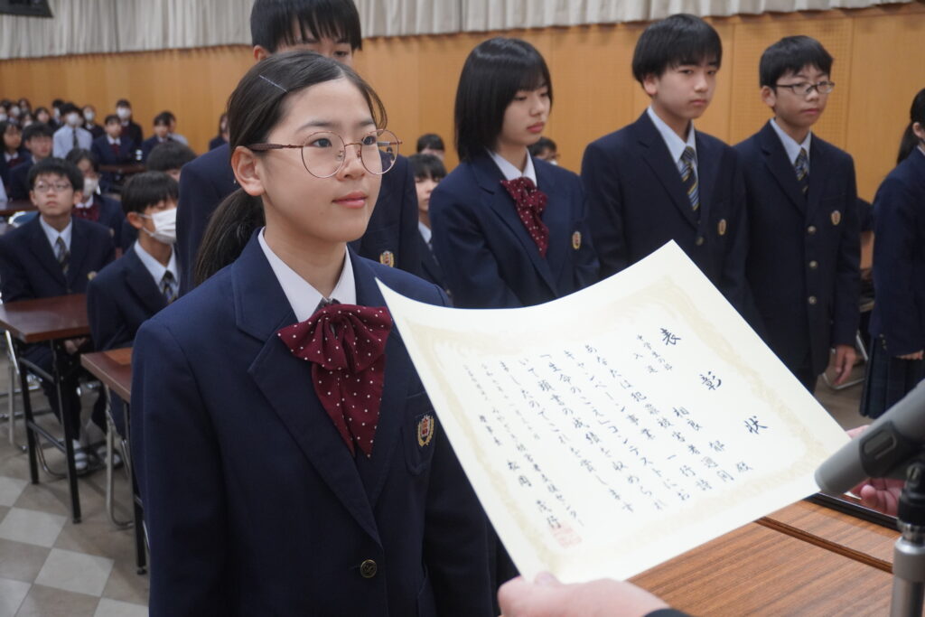 〇 学校奨励賞 代表受取 生徒会長:弓削 龍之介さん(西池小出身)