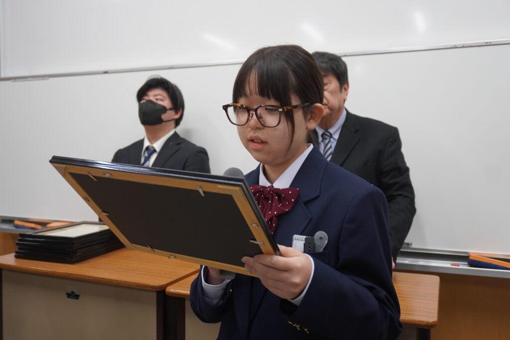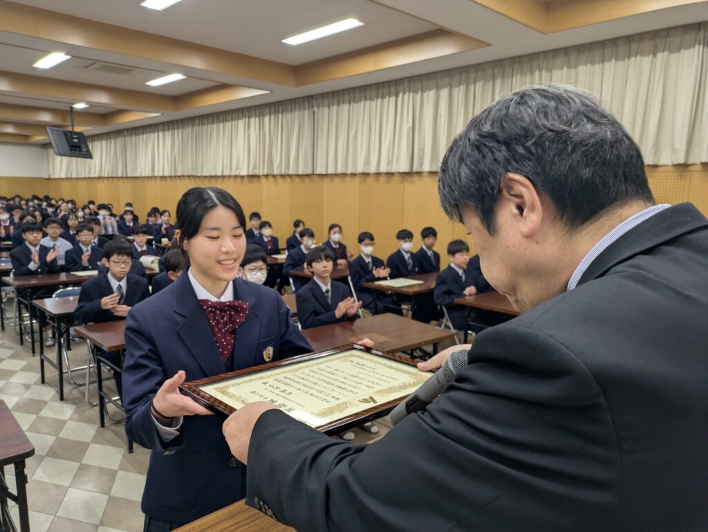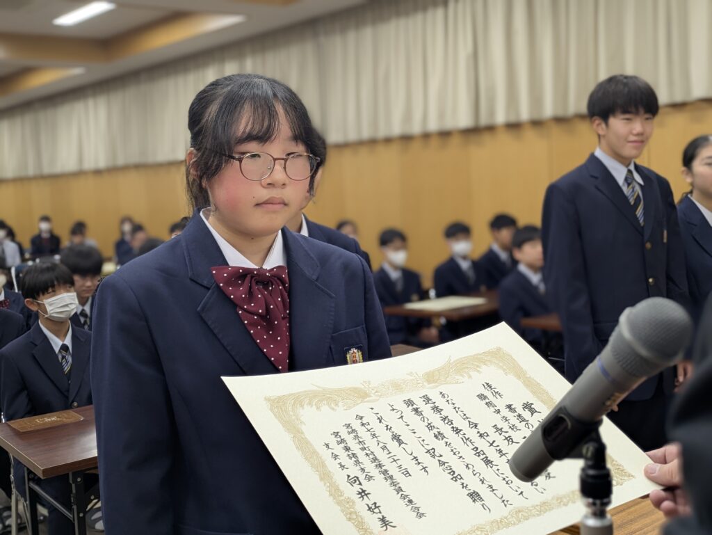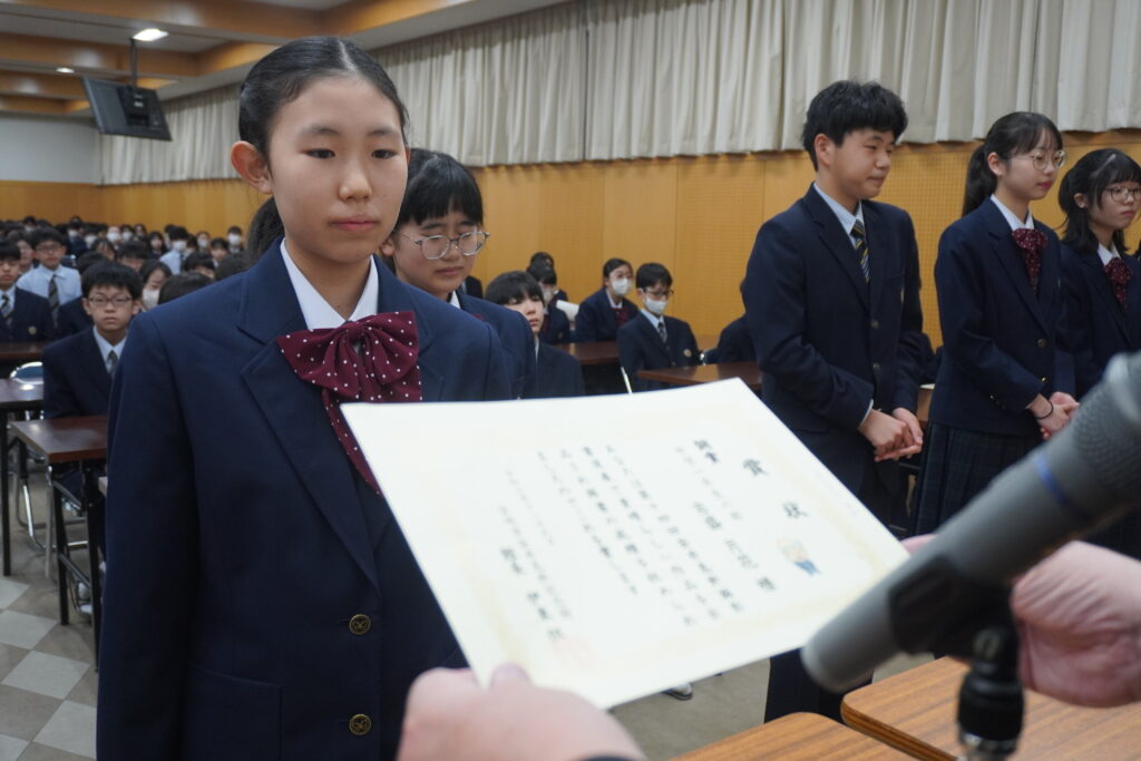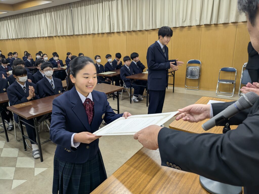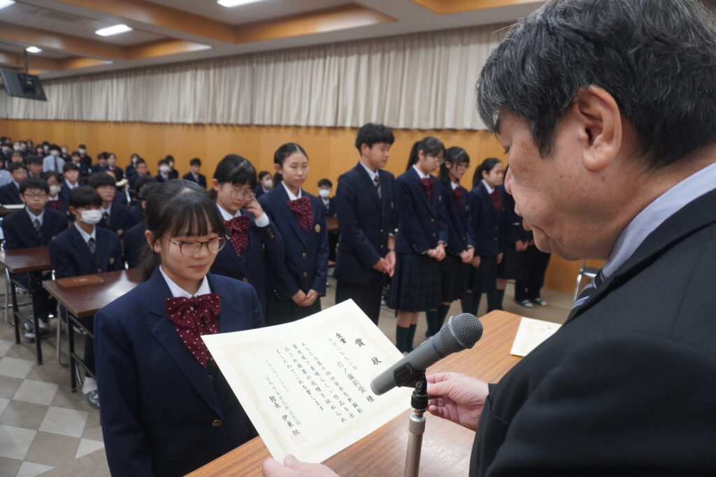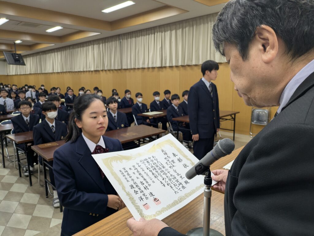 〇 学校奨励賞 代表受取 生徒会長:弓削 龍之介さん(西池小出身)