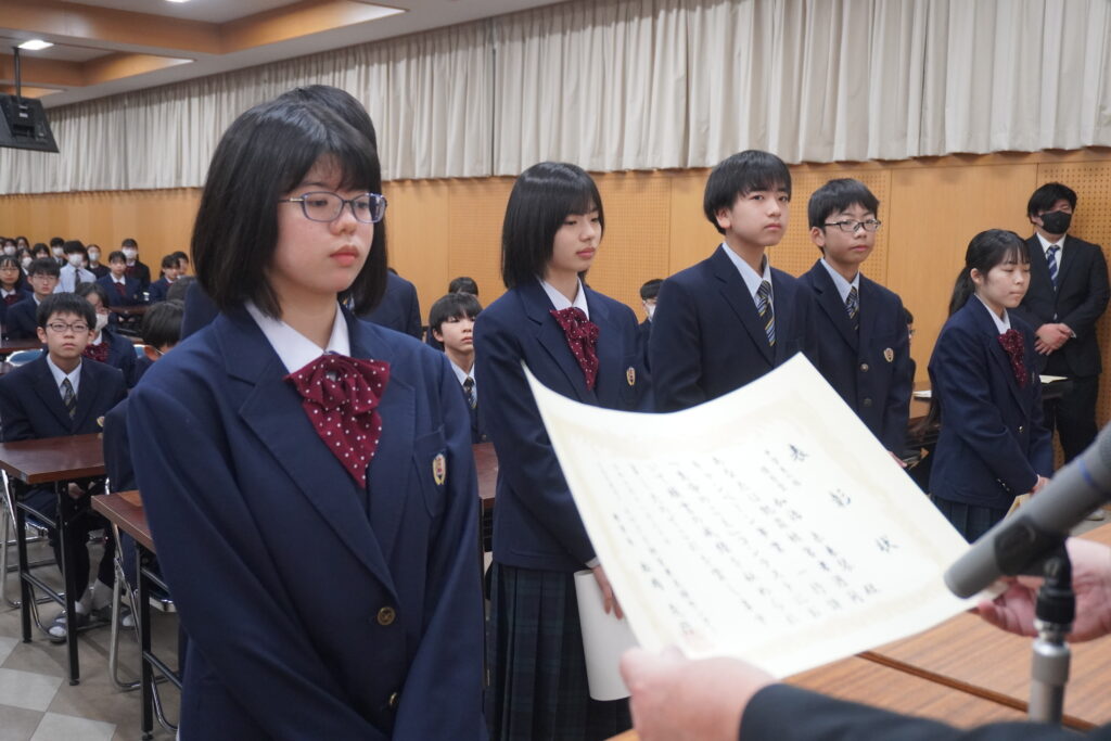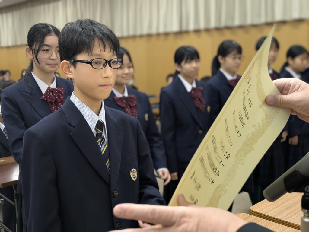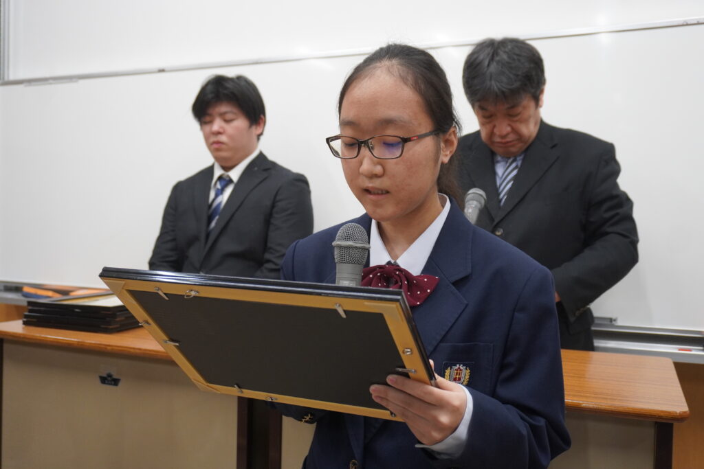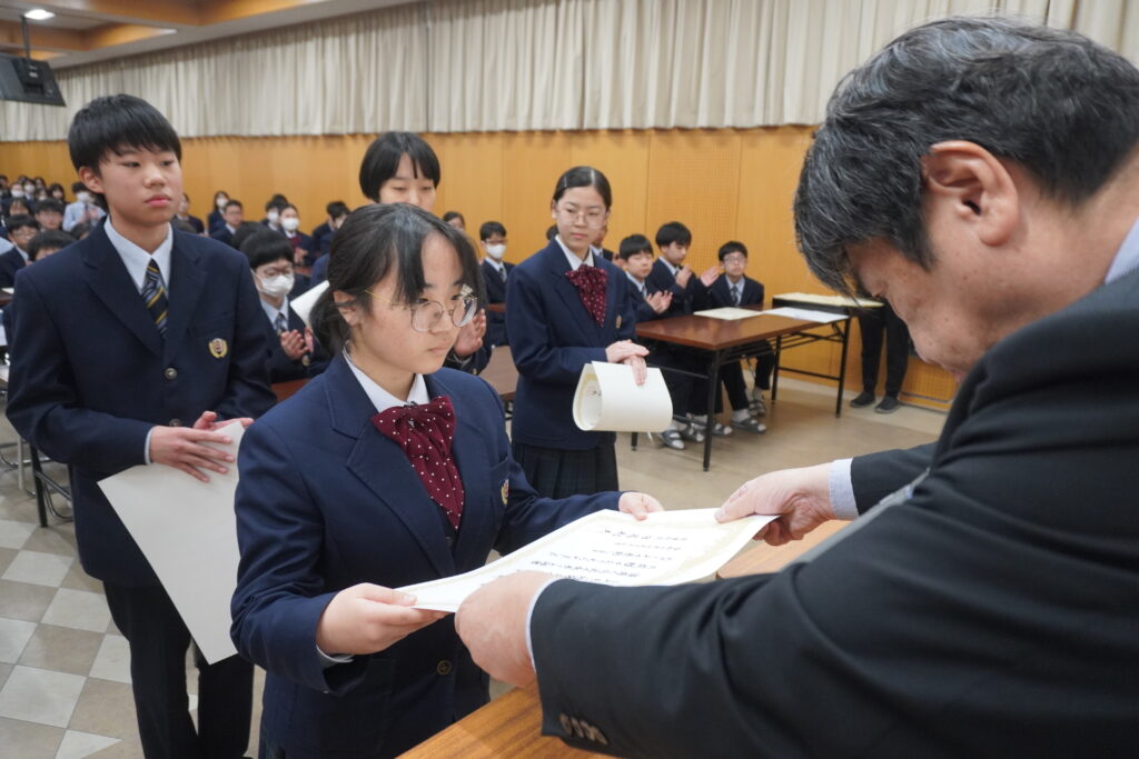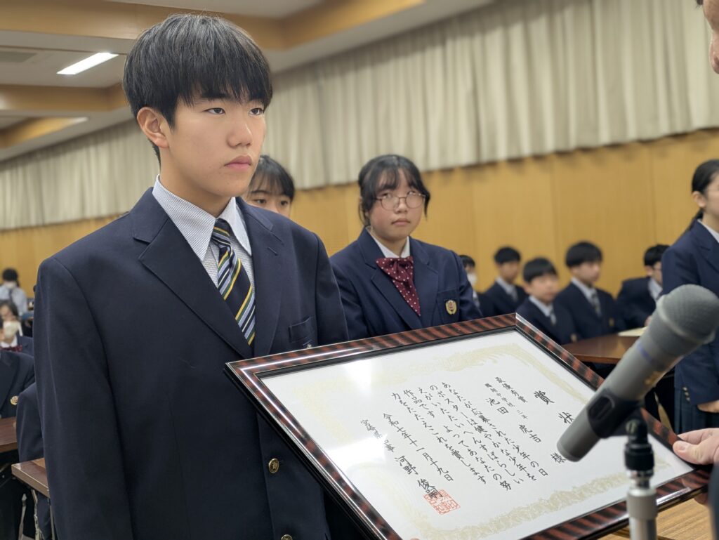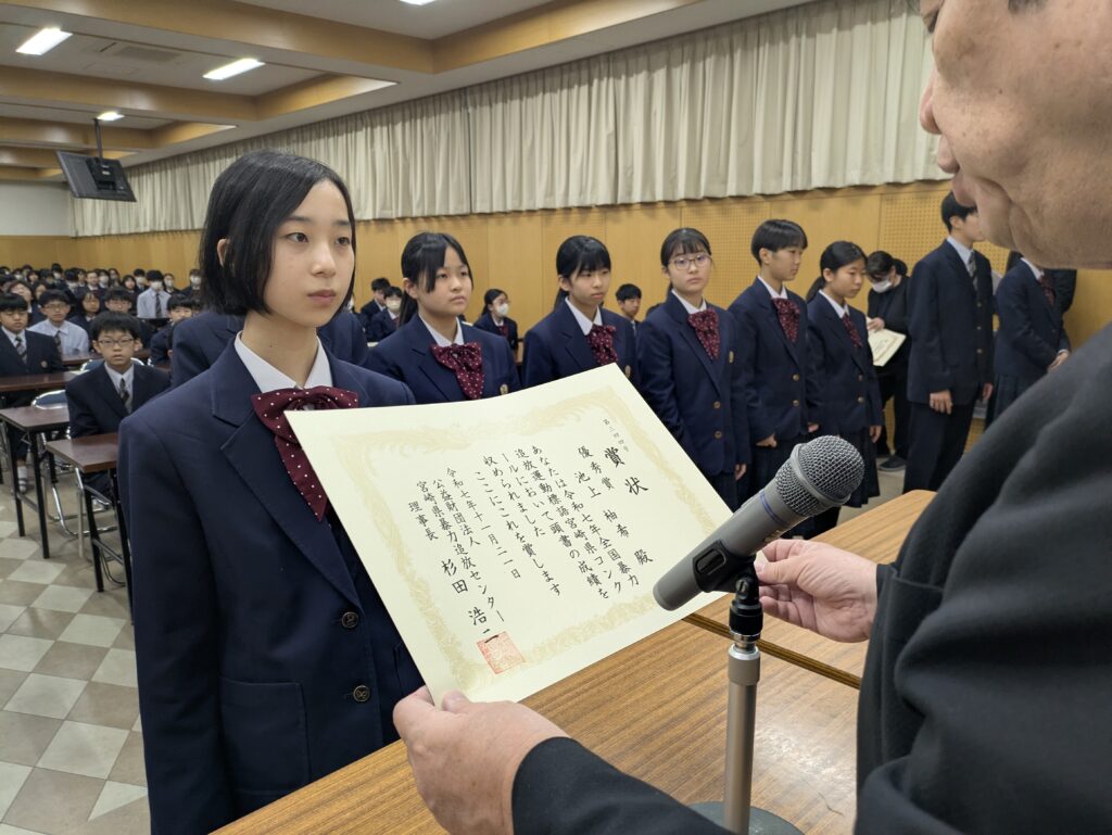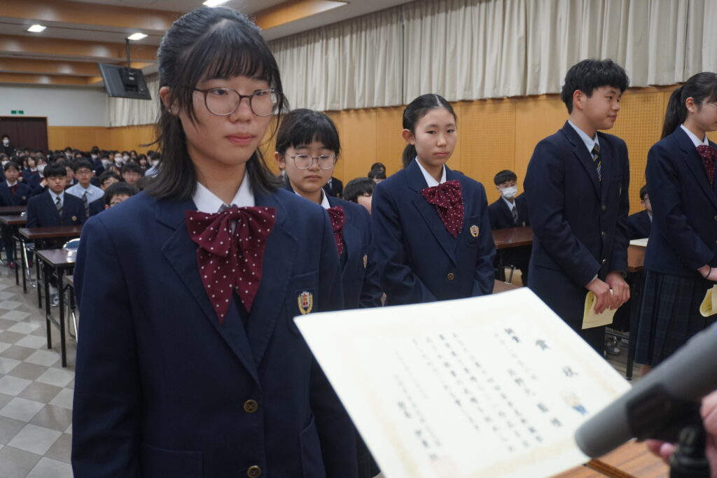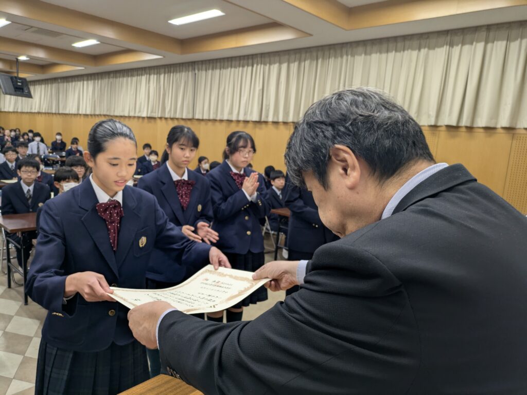 〇 学校奨励賞 代表受取 生徒会長:弓削 龍之介さん(西池小出身)
