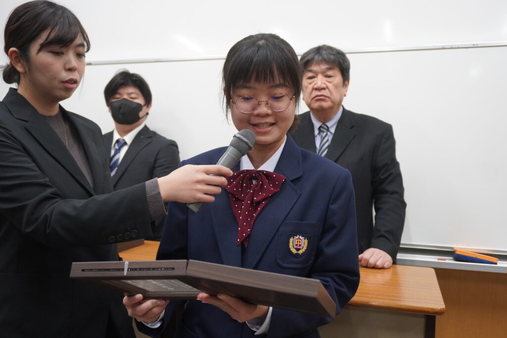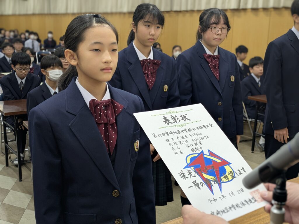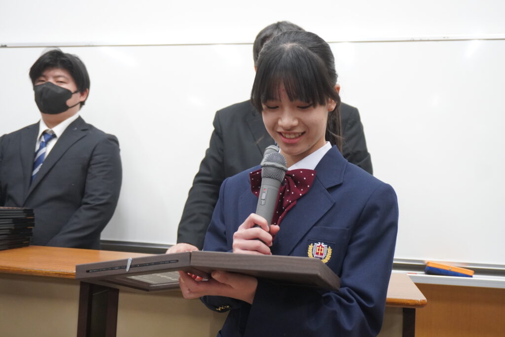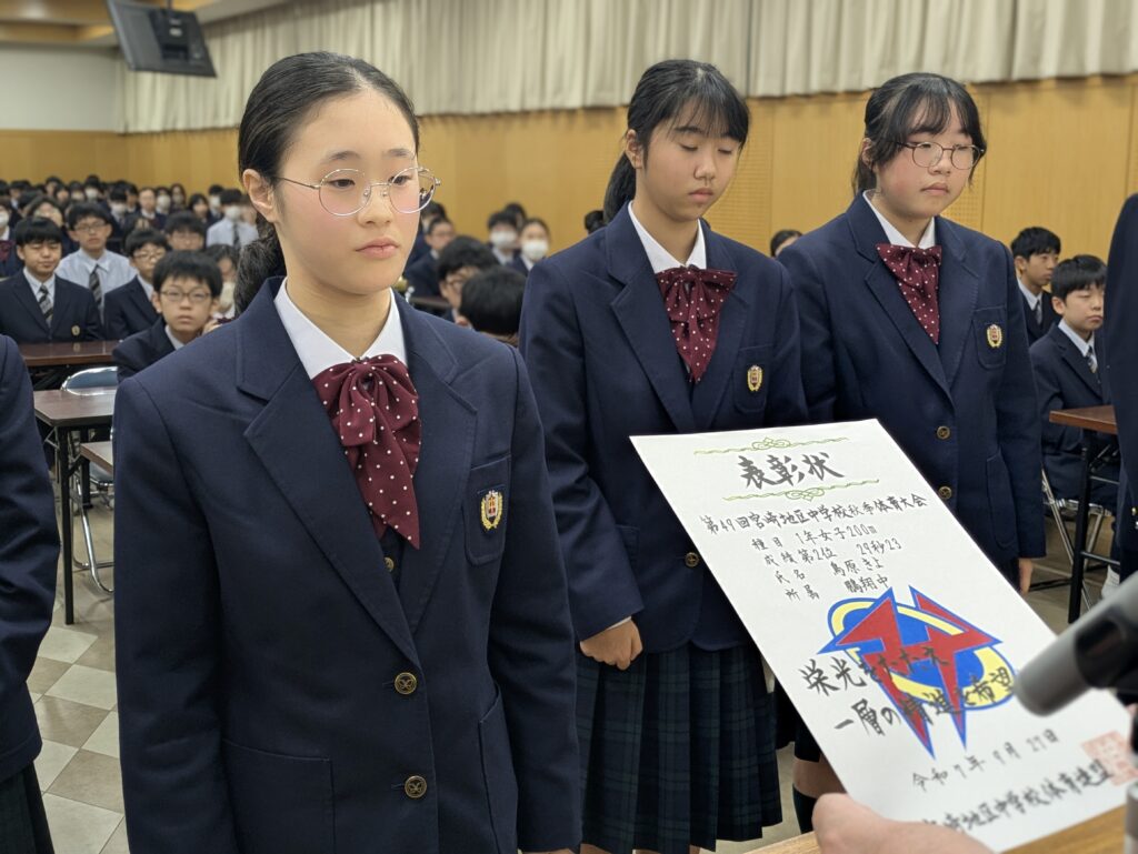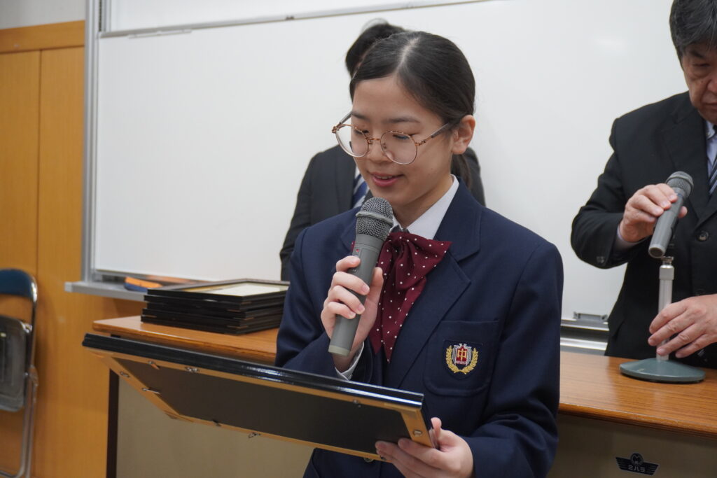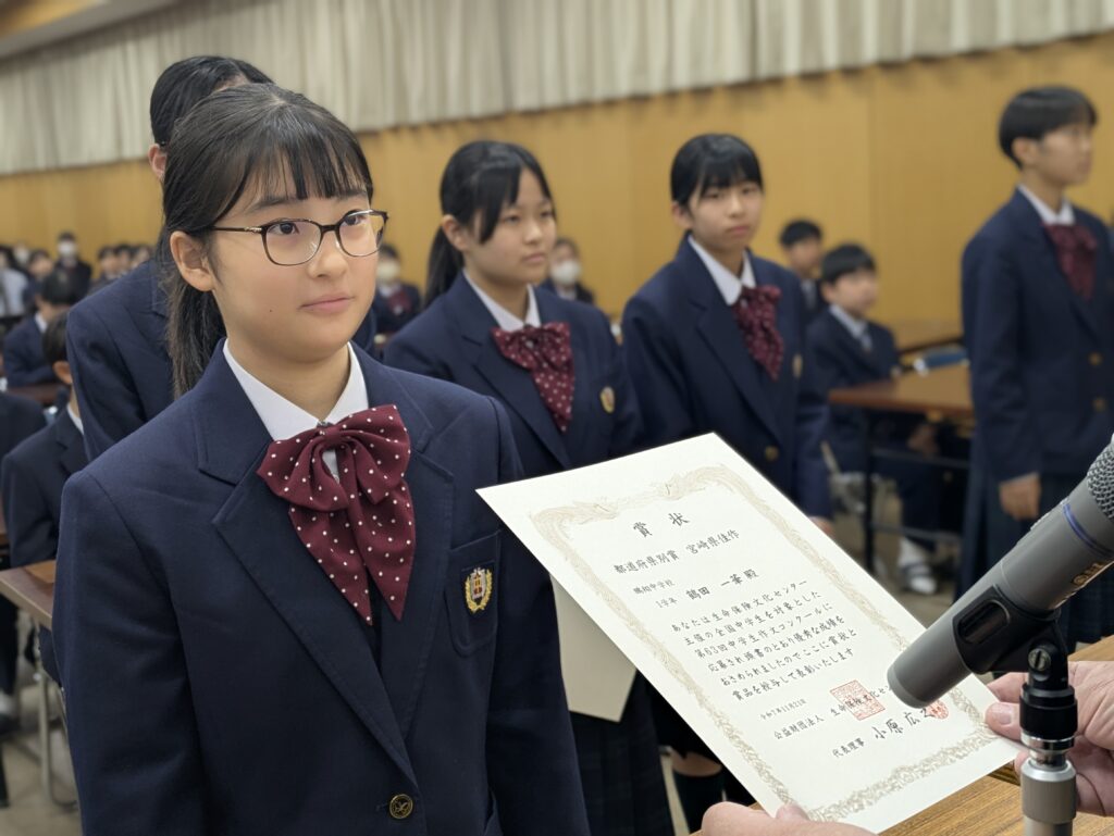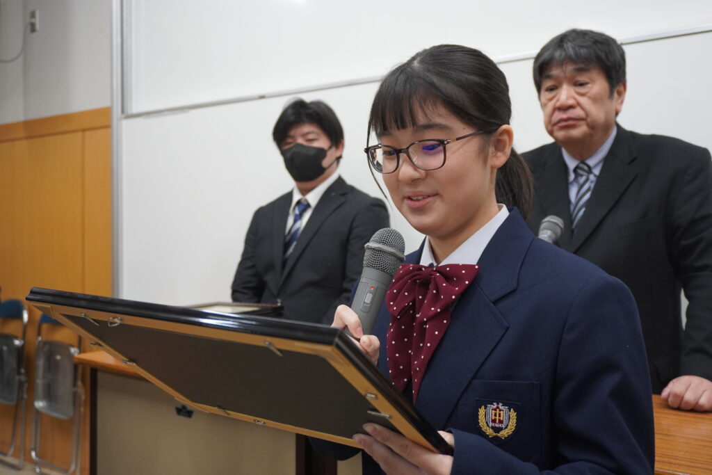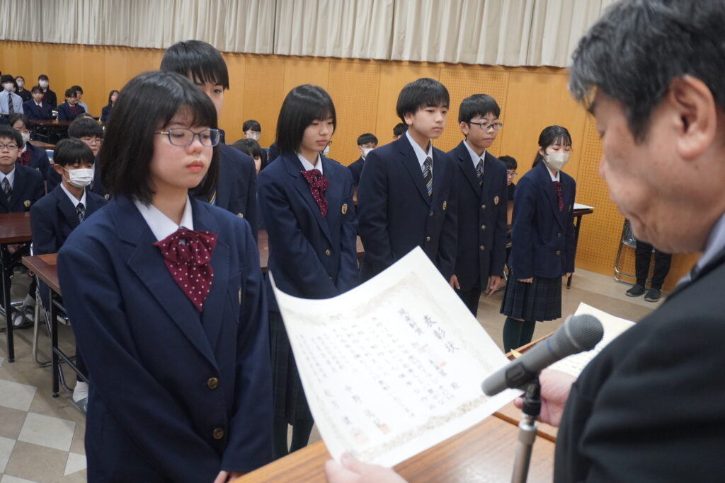 〇 学校奨励賞 代表受取 生徒会長:弓削 龍之介さん(西池小出身)
