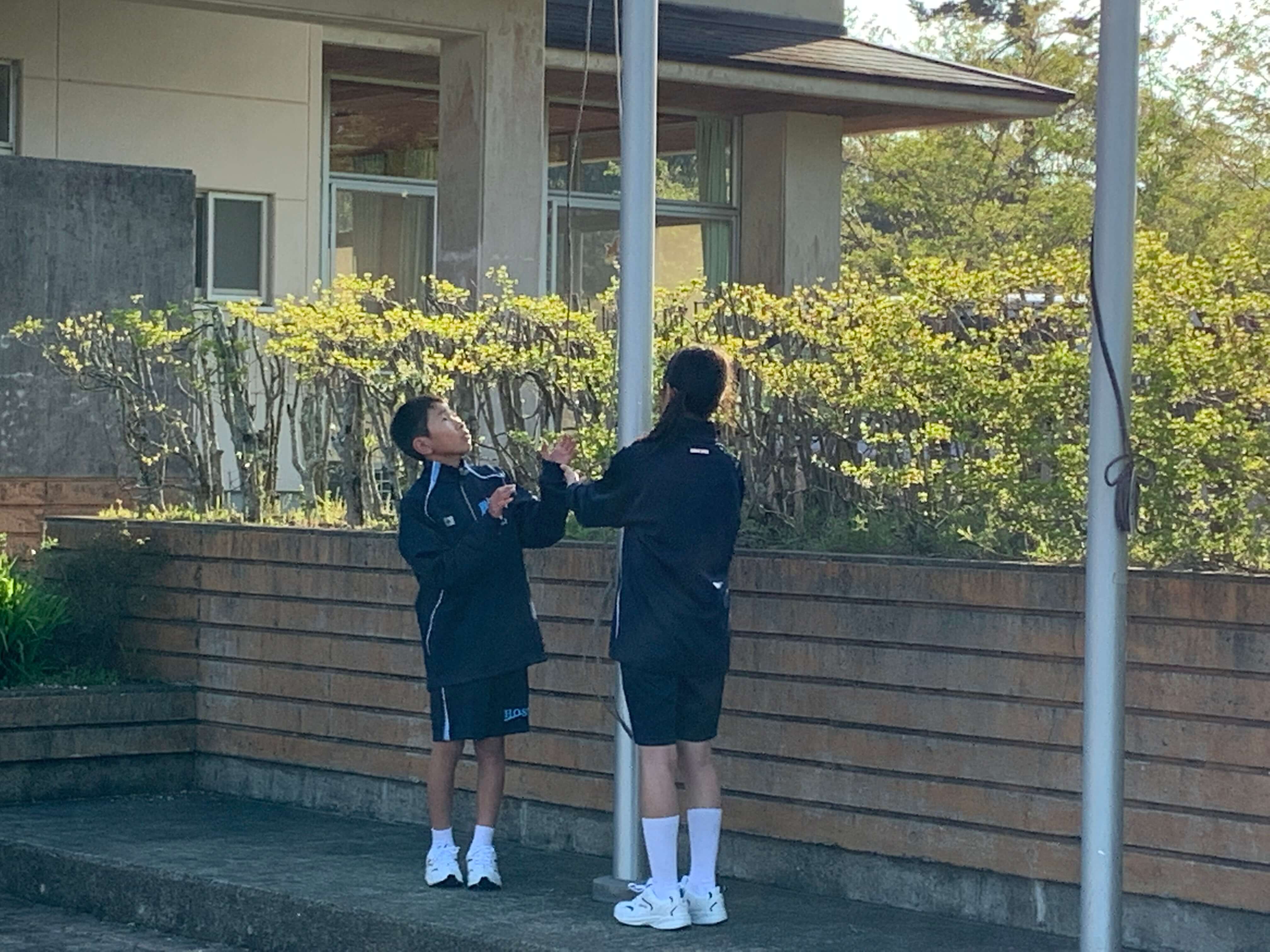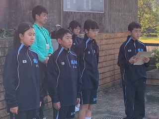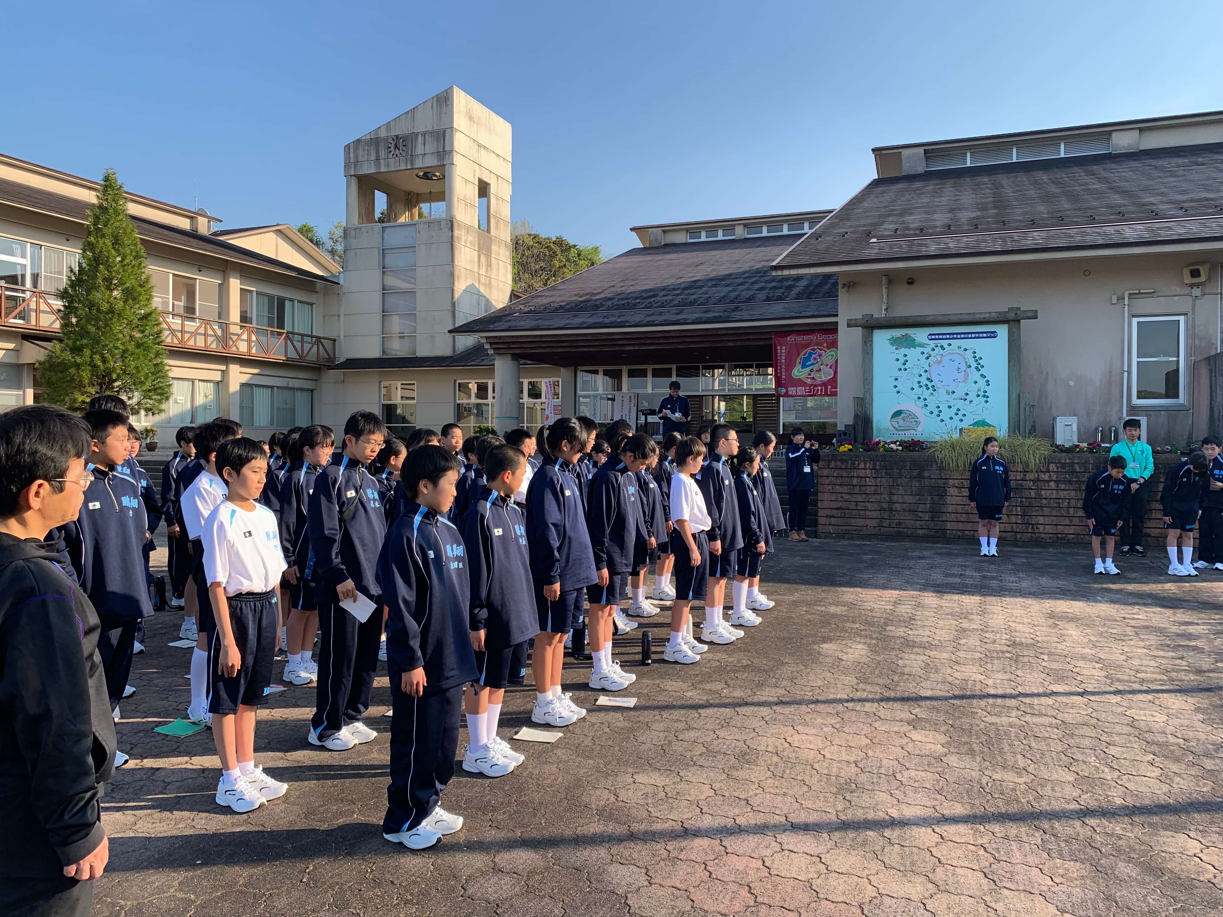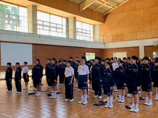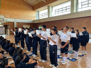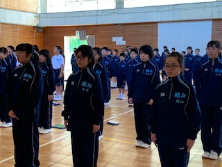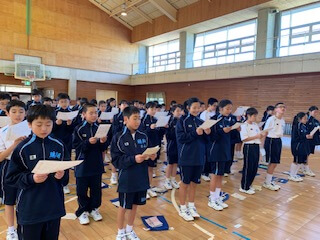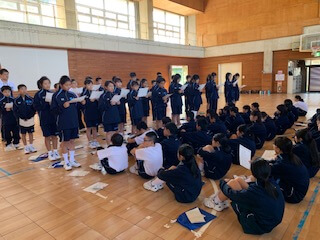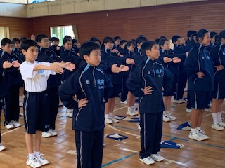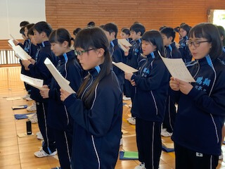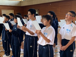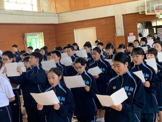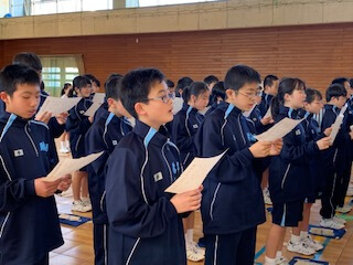 集団訓練のあとは、校歌の練習。6年間歌い続けることになりますから、しっかりと覚えて堂々と歌えるようになりましょう。