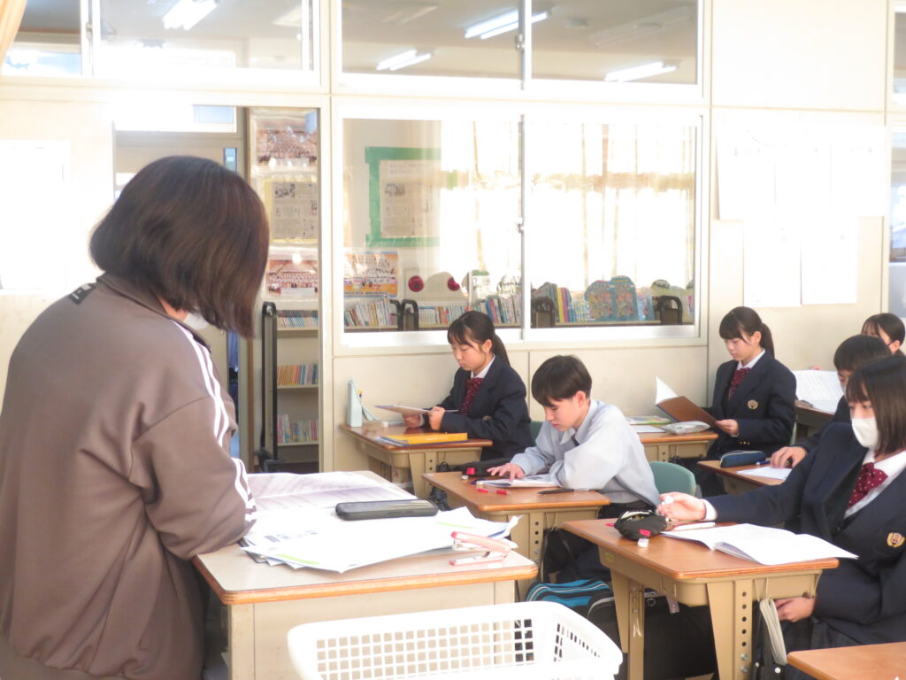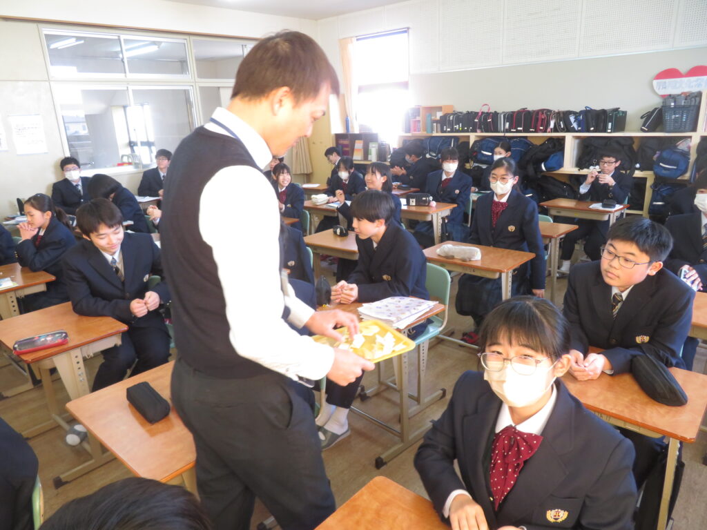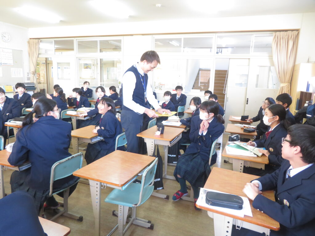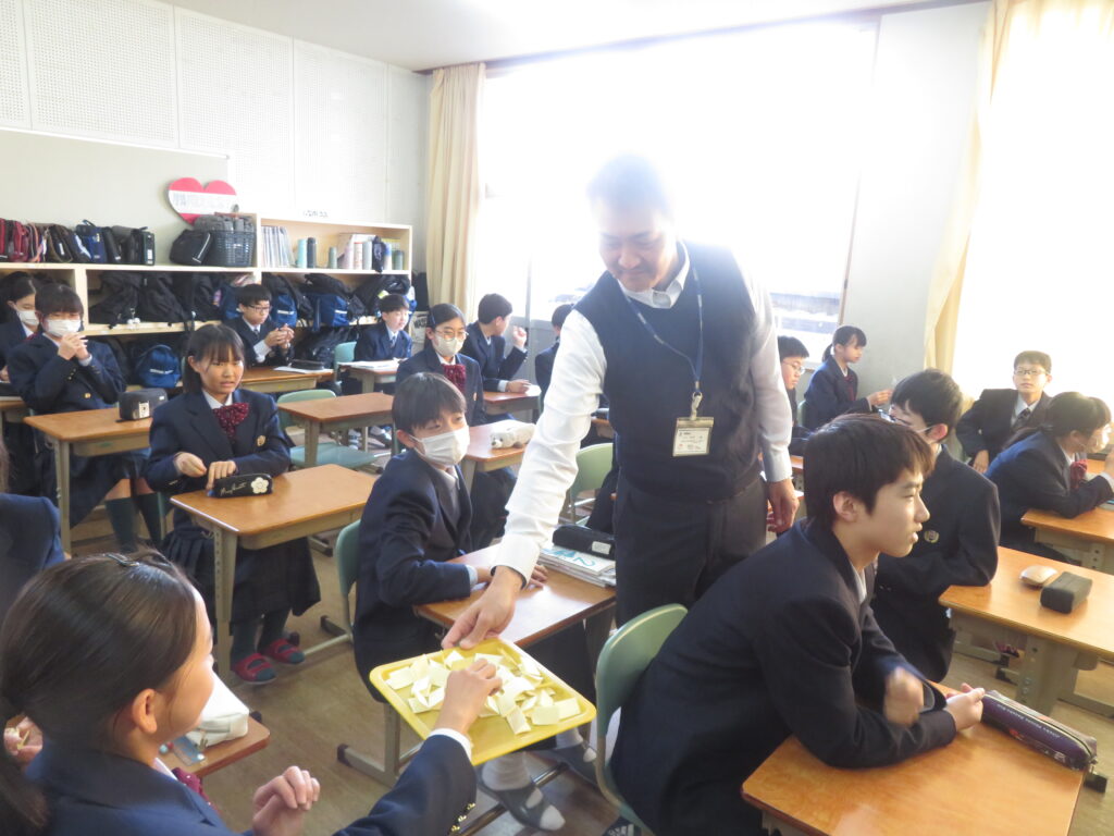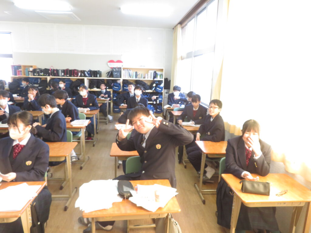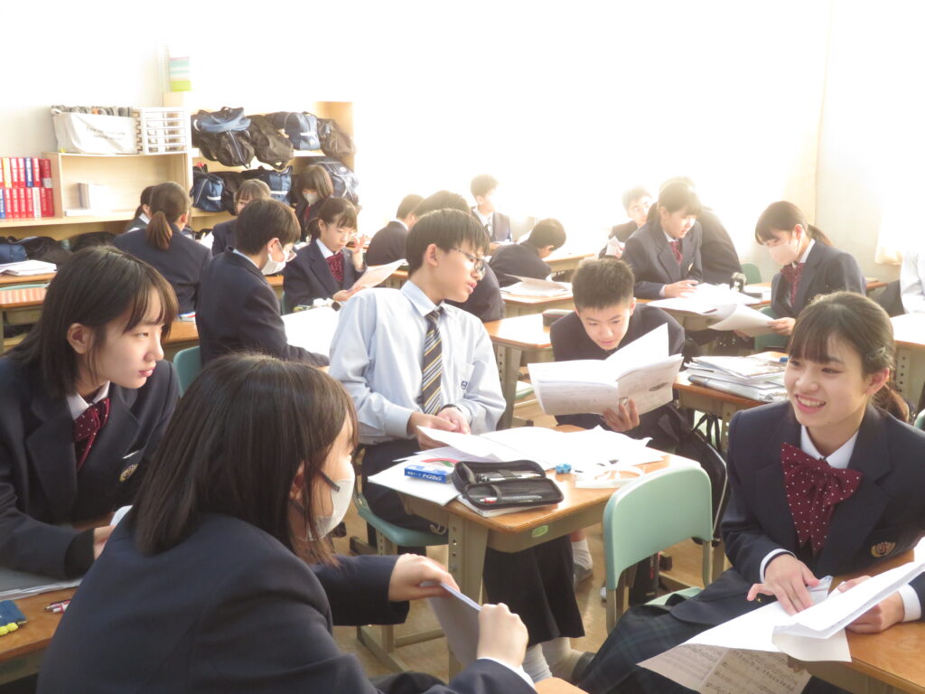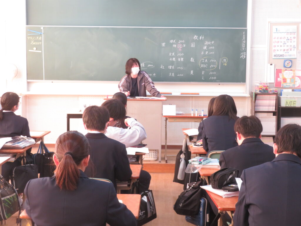 今日は、J1生のLHRにおける活動をご紹介します。先週の土日で高校3年生の先輩方が共通テストを受験し、今日がその自己採点の日です。J1Bでは、昨年から行っている大学調べの延長線上で、共通テストにおける各教科の配点について鳥原先生が説明をされました。その後は、卒業式に、J3生へ向けて歌う歌の準備を始めていました。楽譜を用意したり、自分たちが歌う歌の完成形をインターネットで聞いて、自分たちが歌うパートをイメージしたりしました。J1Aでは、席替えが行われていました。席替えは学校生活のうちで、最も楽しく、かつ緊張するイベントの一つです。ただ、どの席になったとしても、今後の授業を効率よく集中して勉強できるようになってほしいと願っております。