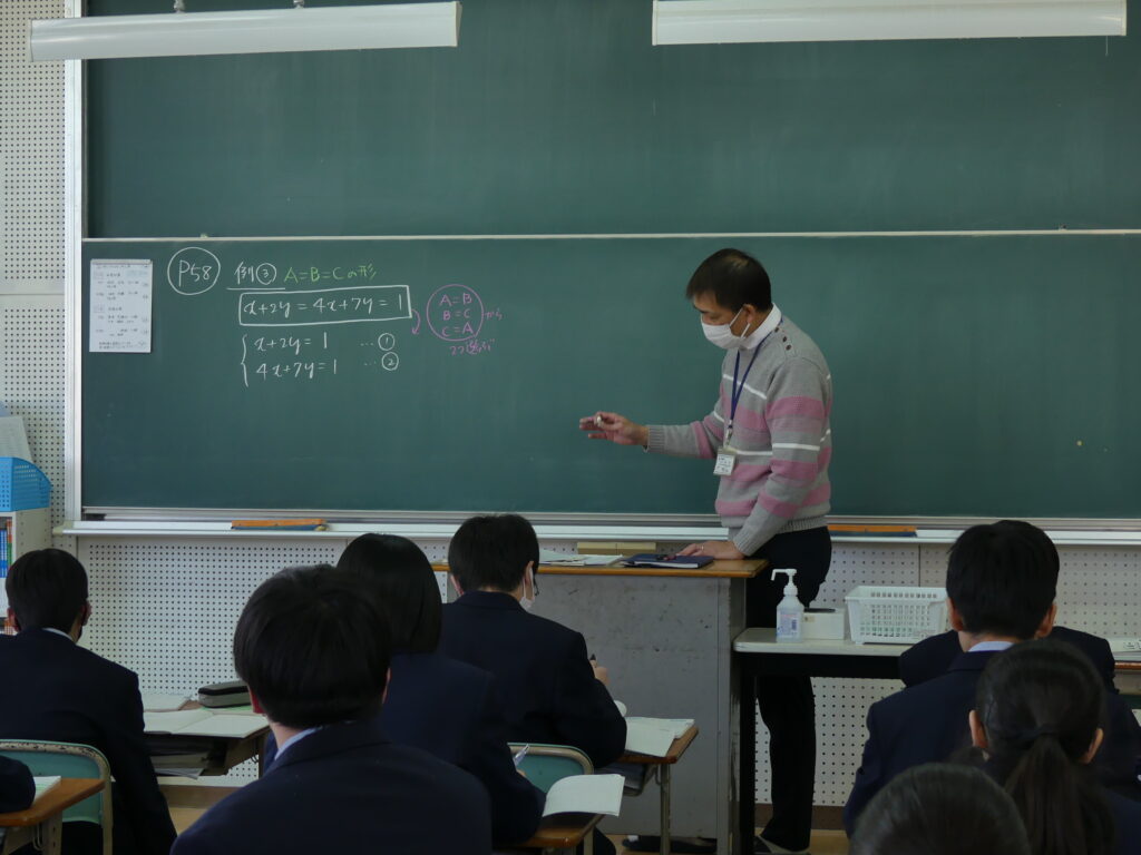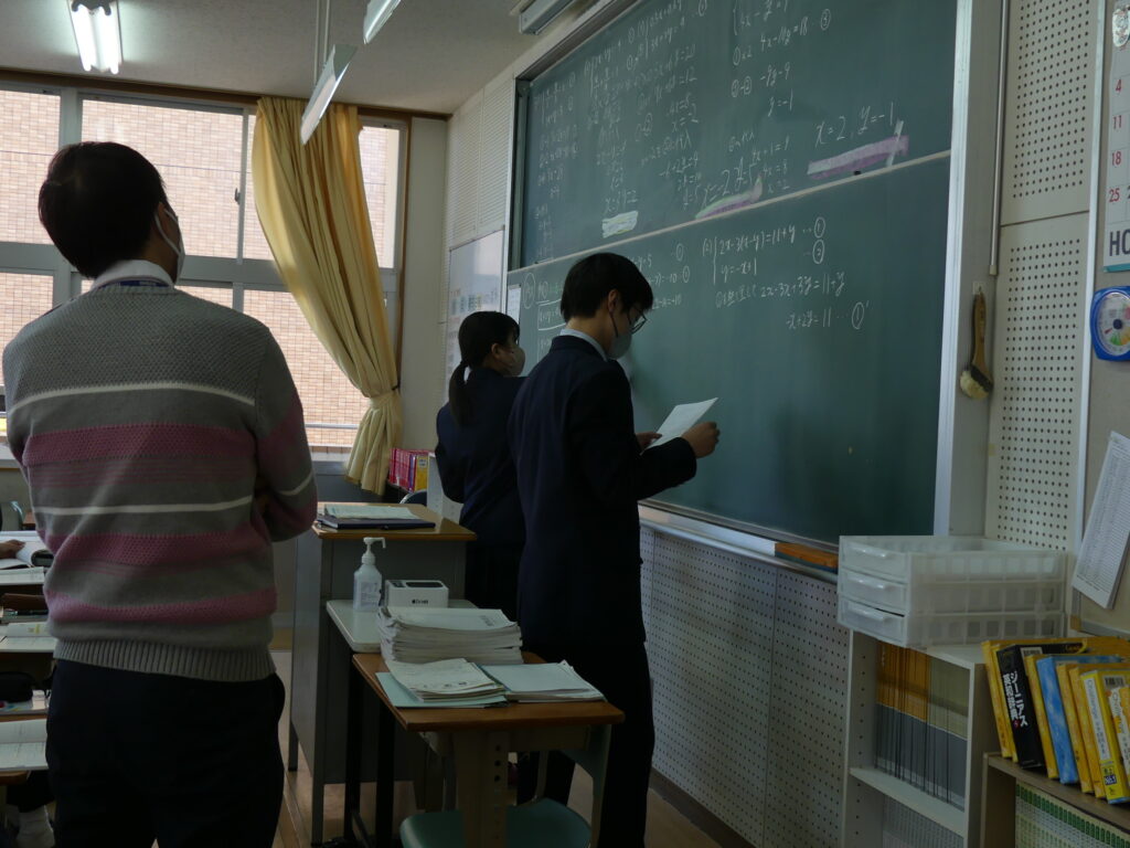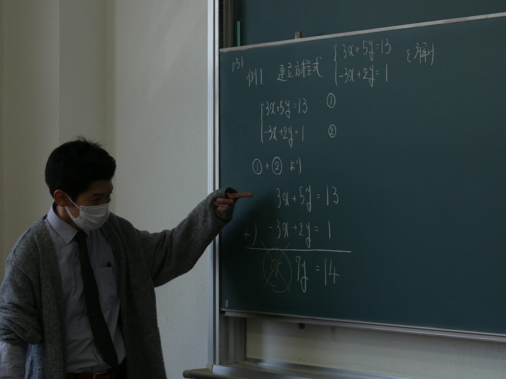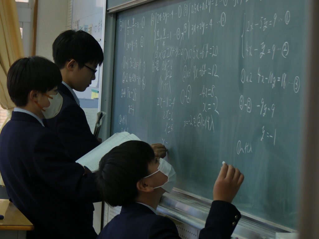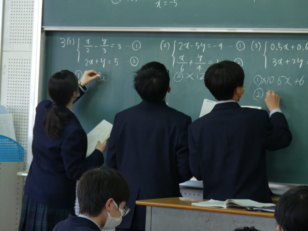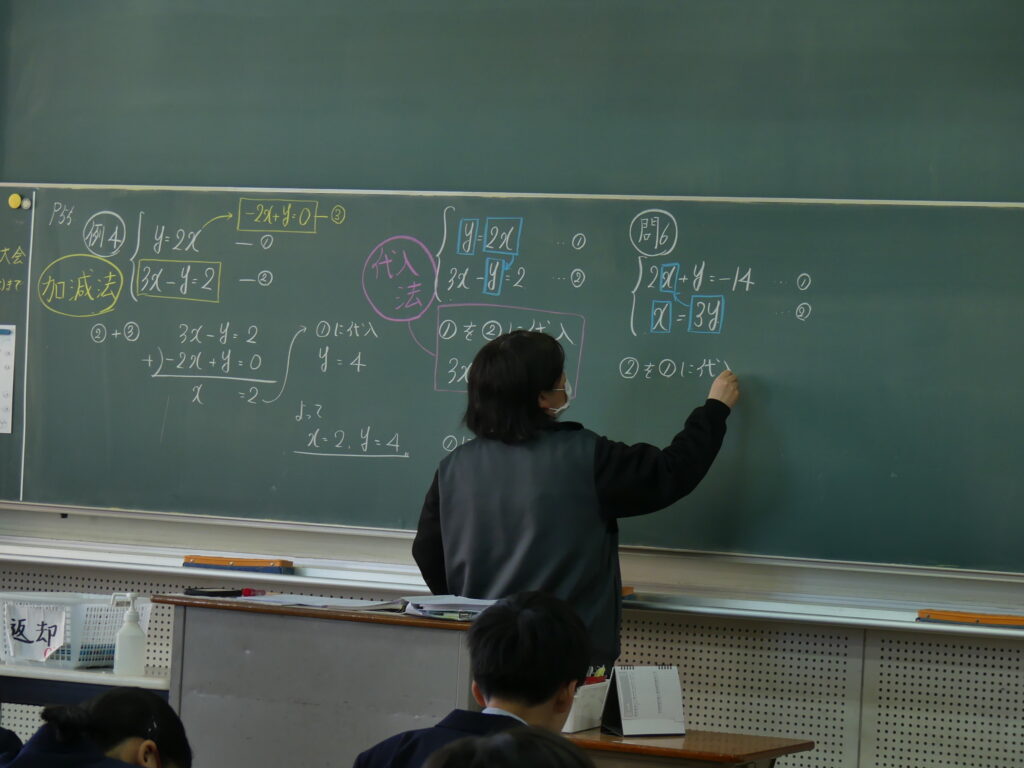 本日の授業内容は「連立方程式」で、加減法や代入法といった方法を学び、それらを用いて、問題を解いていました。