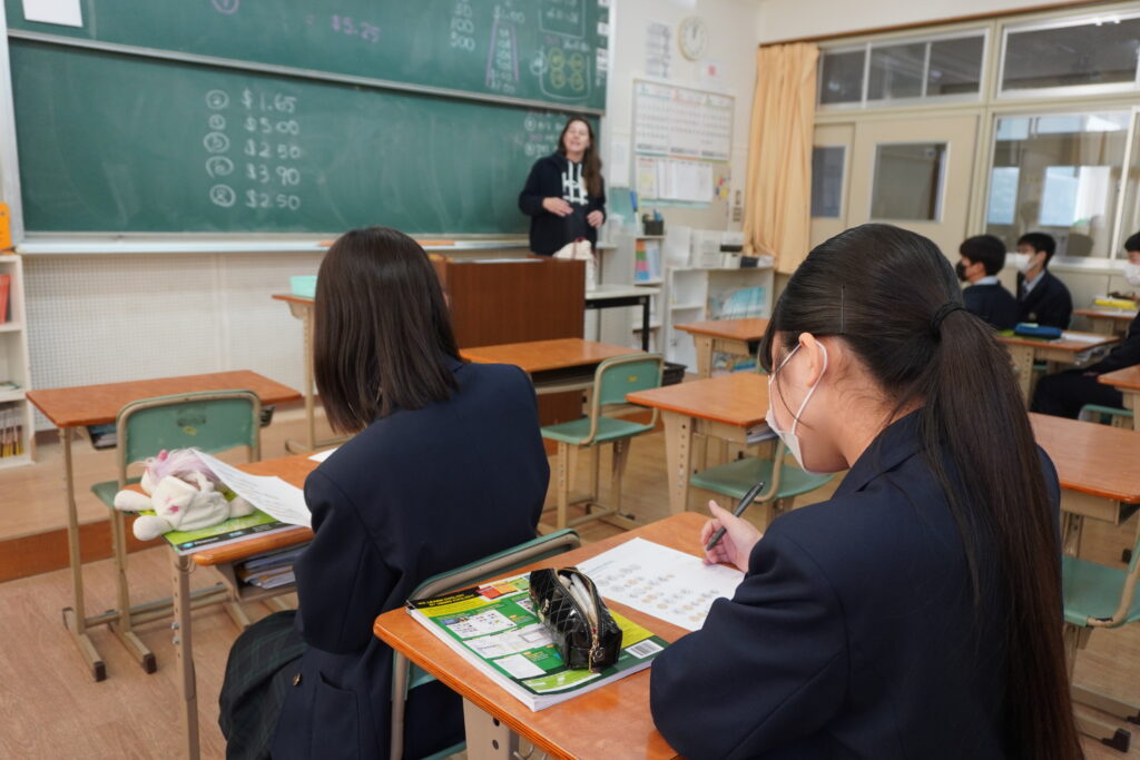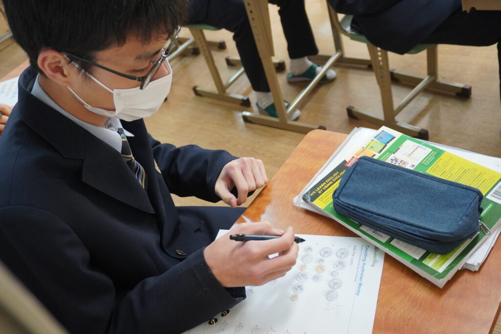 J3の英会話の授業では金額の言い方や表記の仕方を学んでいました。