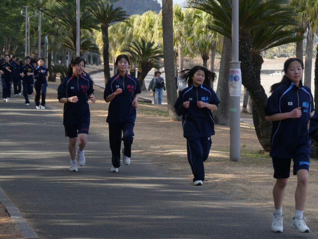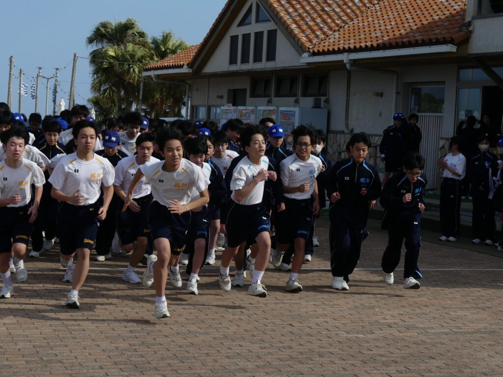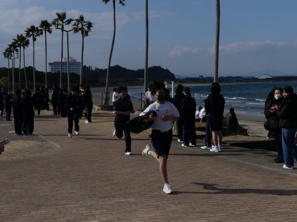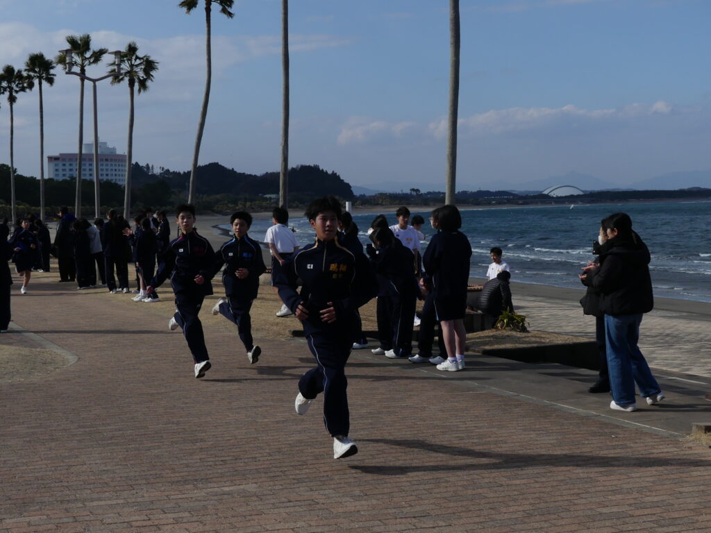 本日、青島で行われたマラソン大会の様子をお伝えします。今日のために3学期初めから体育の授業で練習を重ねてきました。日向灘に面した青島トロピカルロードを、男女ともに3キロメートル走りました。