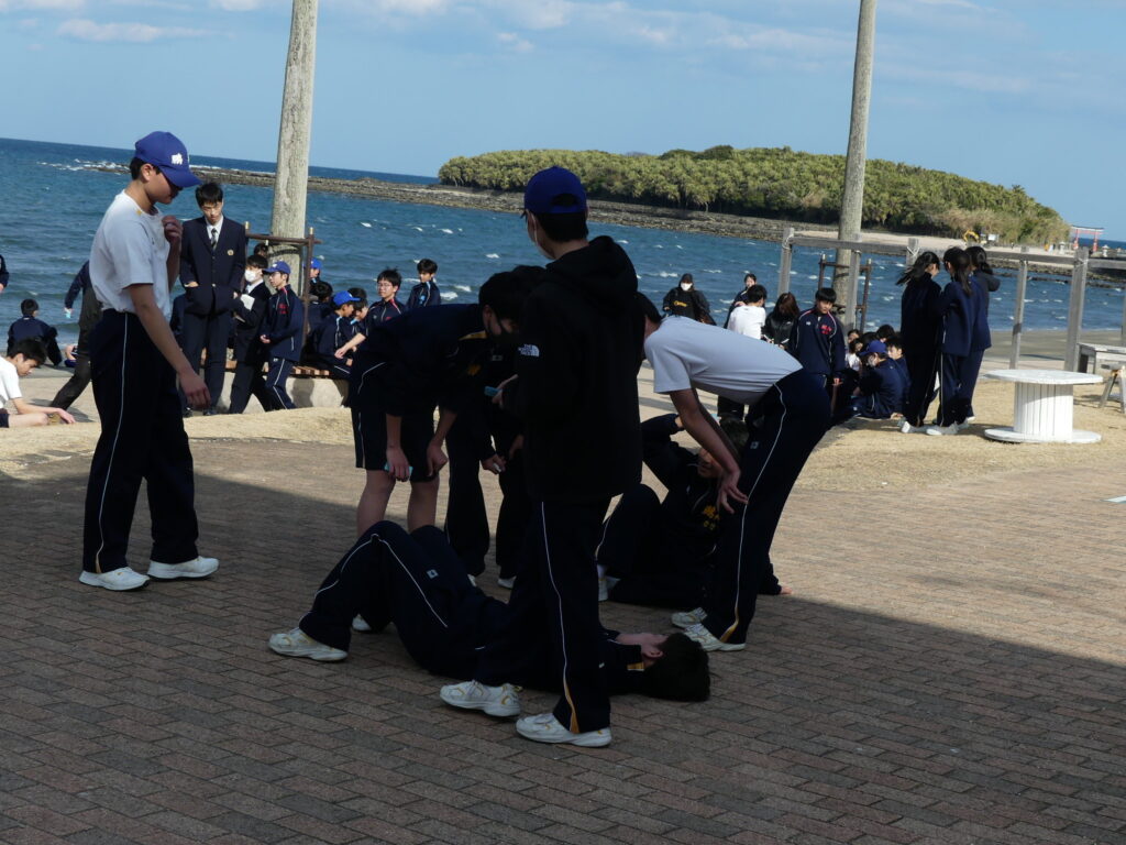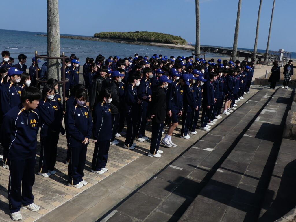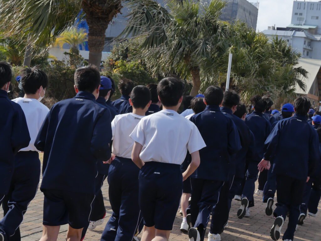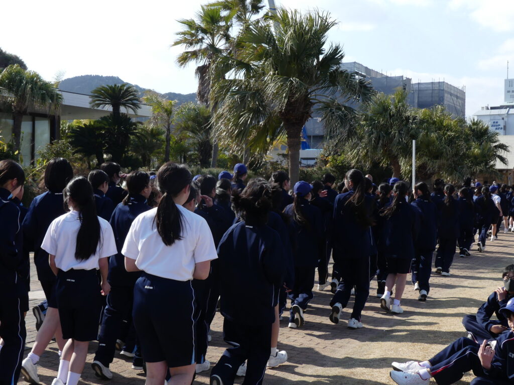本日、青島で行われたマラソン大会の様子をお伝えします。今日のために3学期初めから体育の授業で練習を重ねてきました。日向灘に面した青島トロピカルロードを、男女ともに3キロメートル走りました。