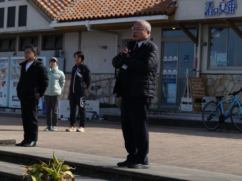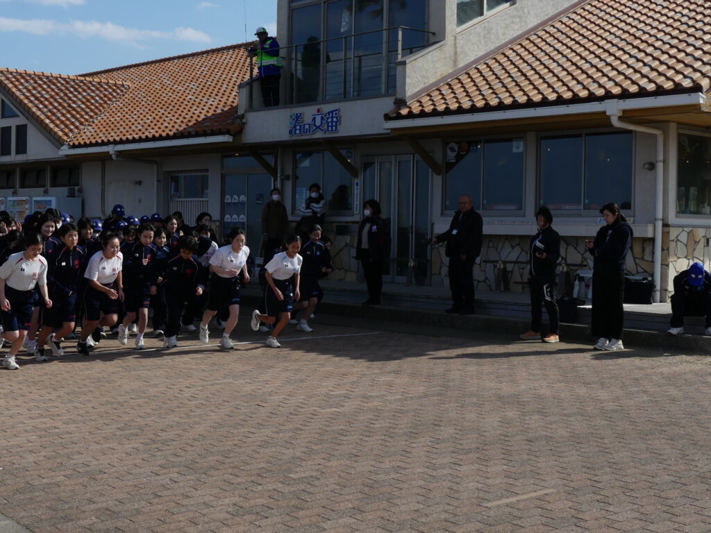 開会式の後、校長先生のスタートの合図で、まず女子がスタートし、そのゴールを見届けた後で男子がスタートしました。晴天に恵まれたものの、冷たい浜風が吹いて、かなり寒く感じられましたが、生徒の皆さんは最後まで懸命に力走していました。