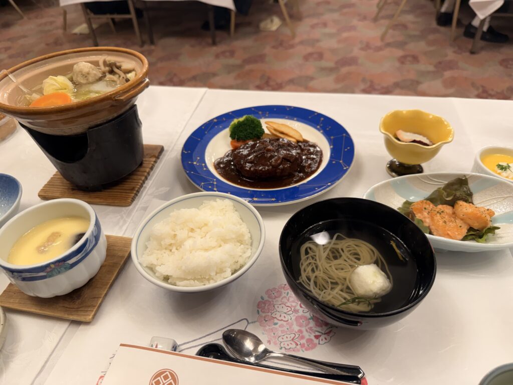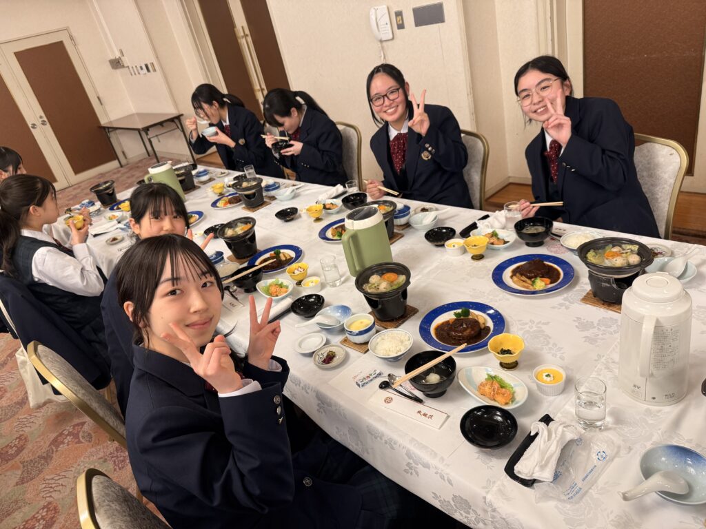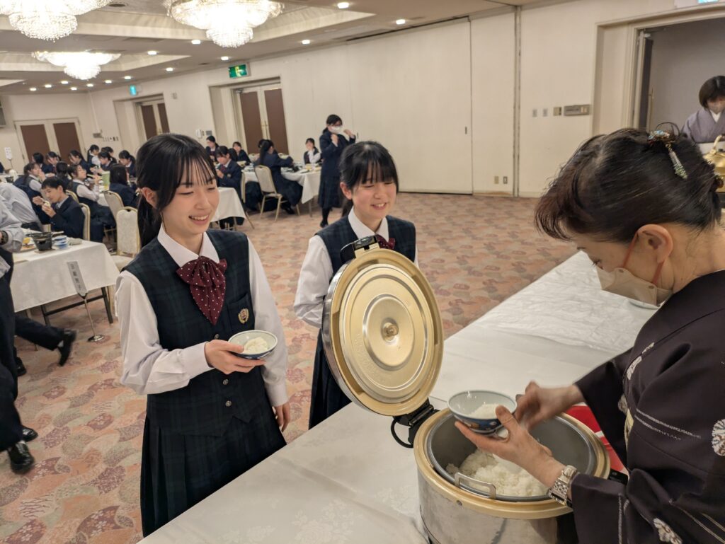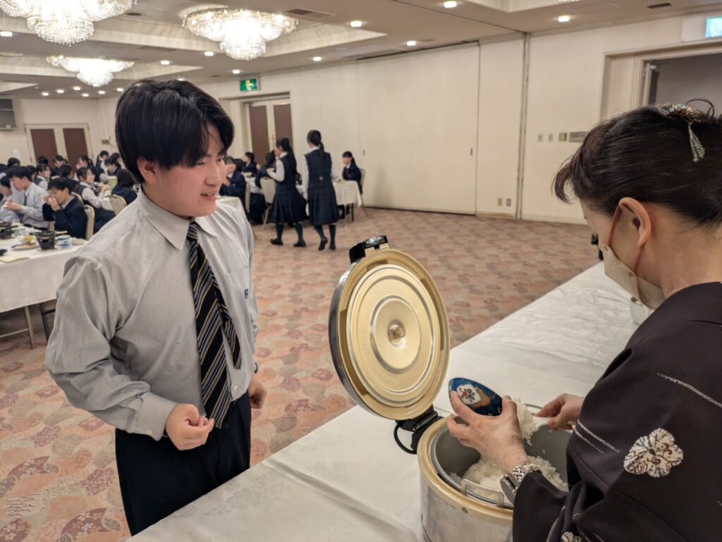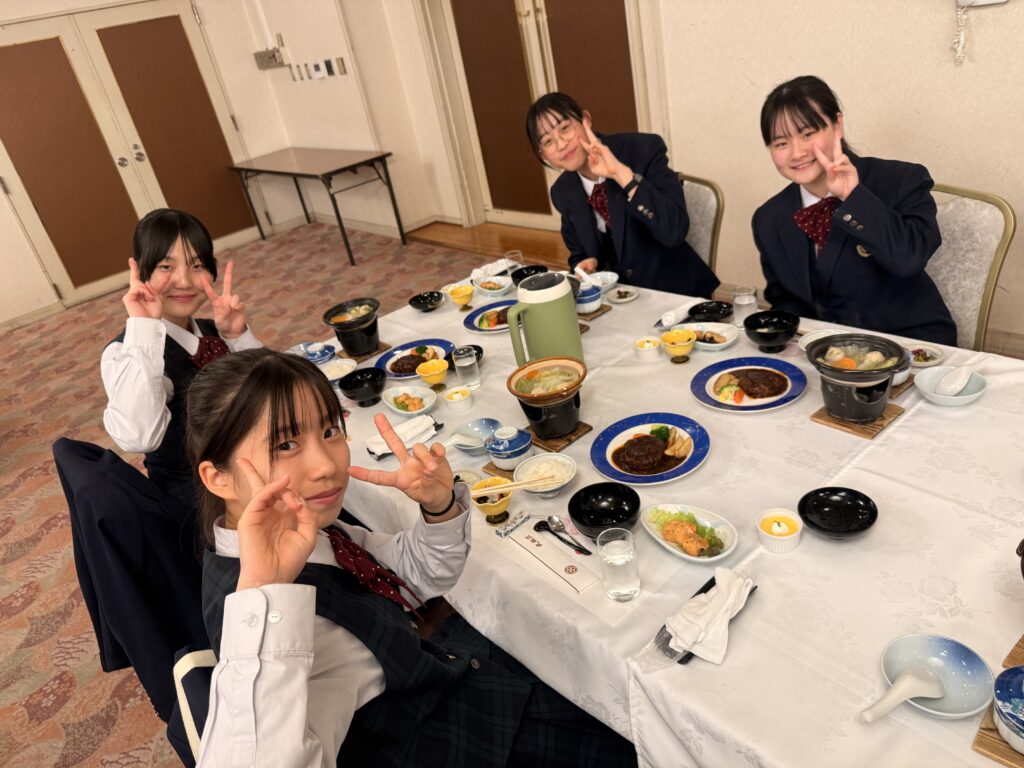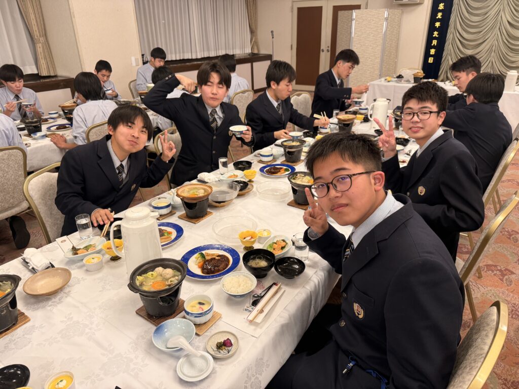 到着後、ちょっと一息の後夕食の時間です。おかわりをする生徒もたくさんいました。