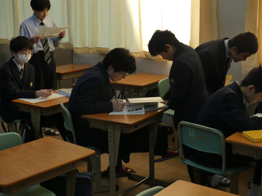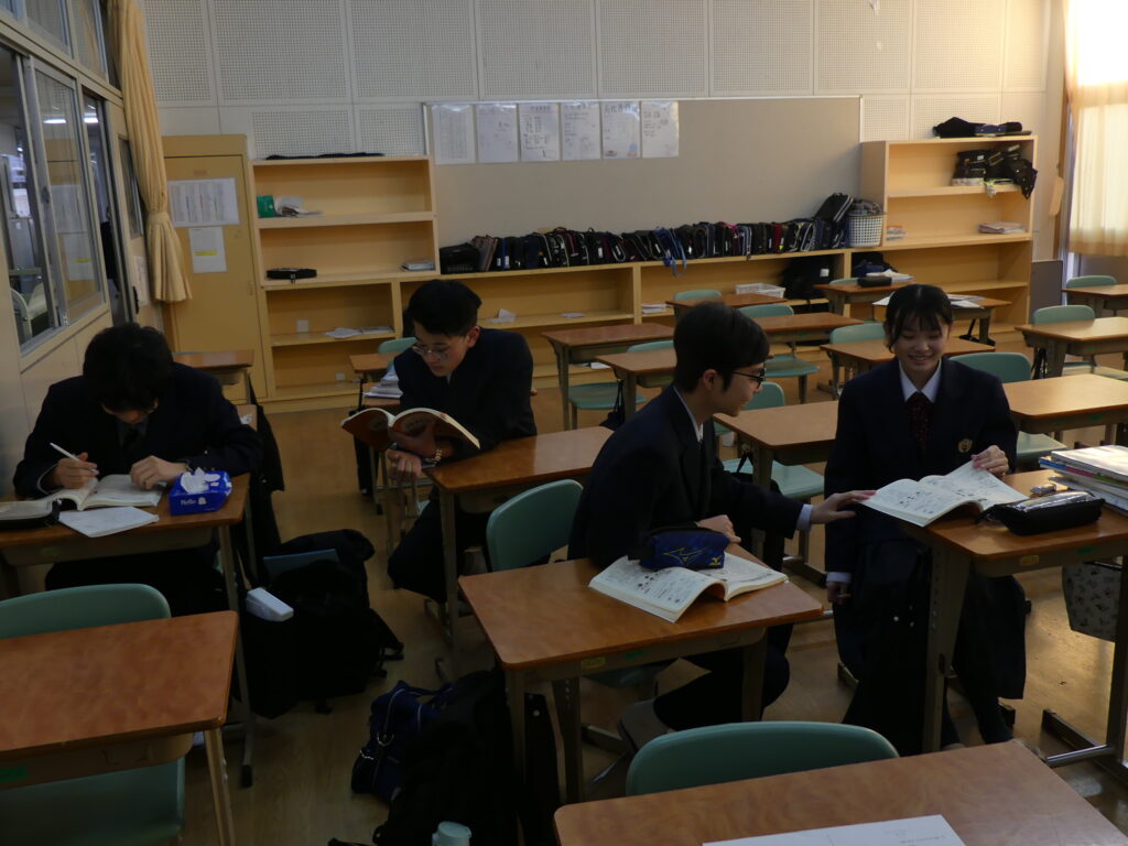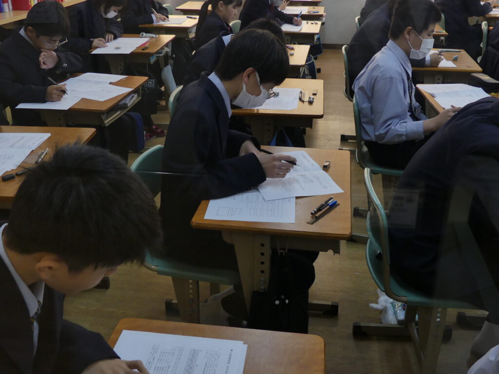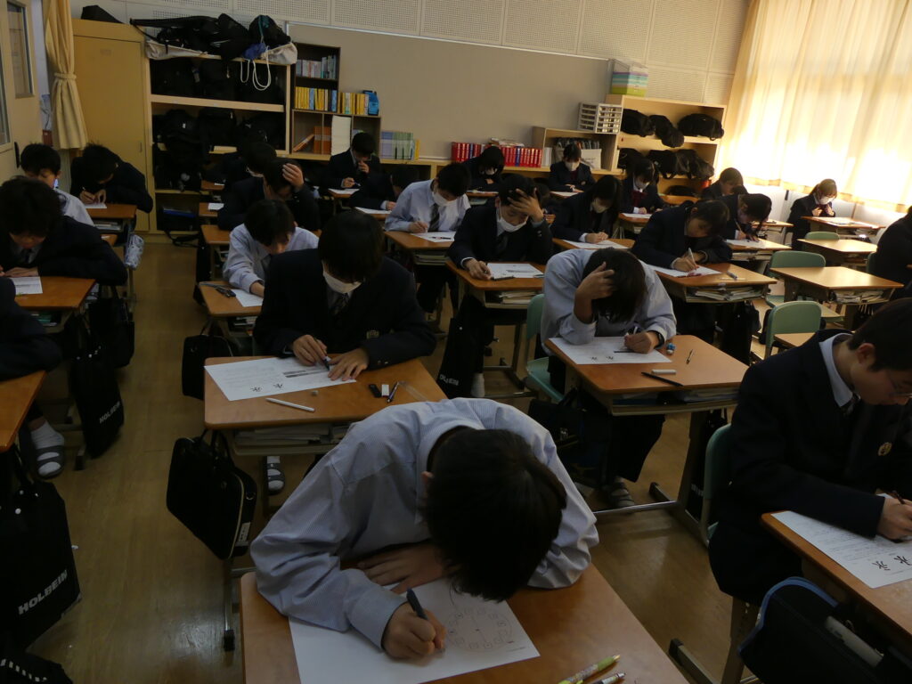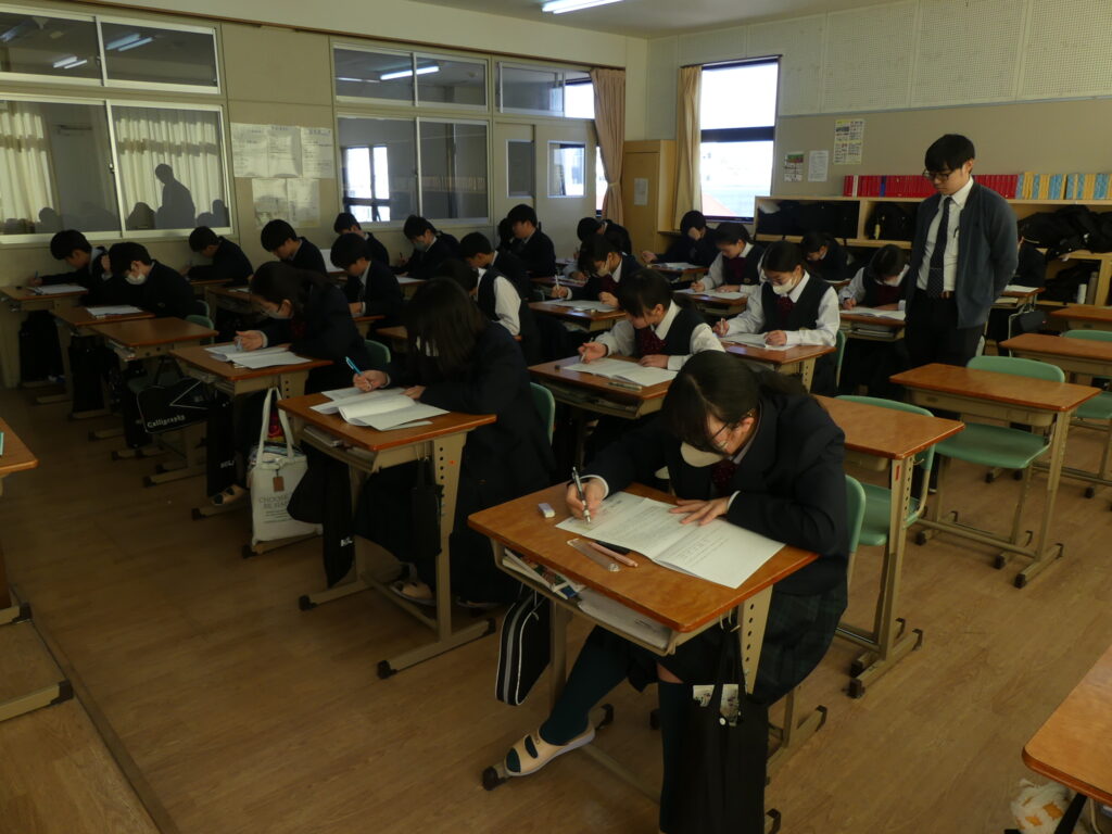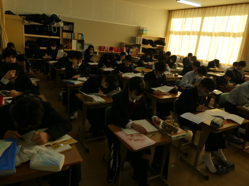 J1生、J2生は本日から2/18(水)まで第5回定期考査です。(今、オーストラリアに修学旅行に行っているJ3生は2/24(火)から)初日の今日はJ1生、J2生ともに国語、美術、理科が行われました。早朝から登校してノートを見直したり、友達と確認し合ったりする姿が見られました。