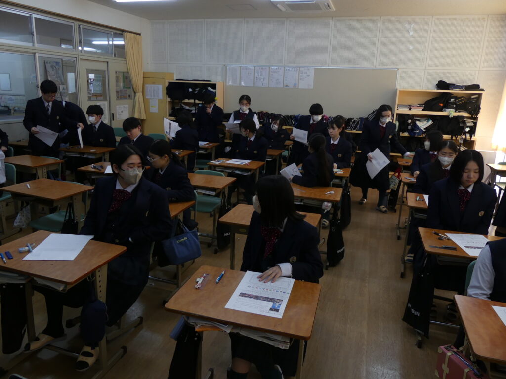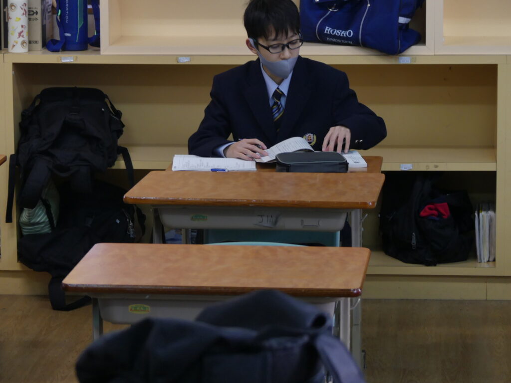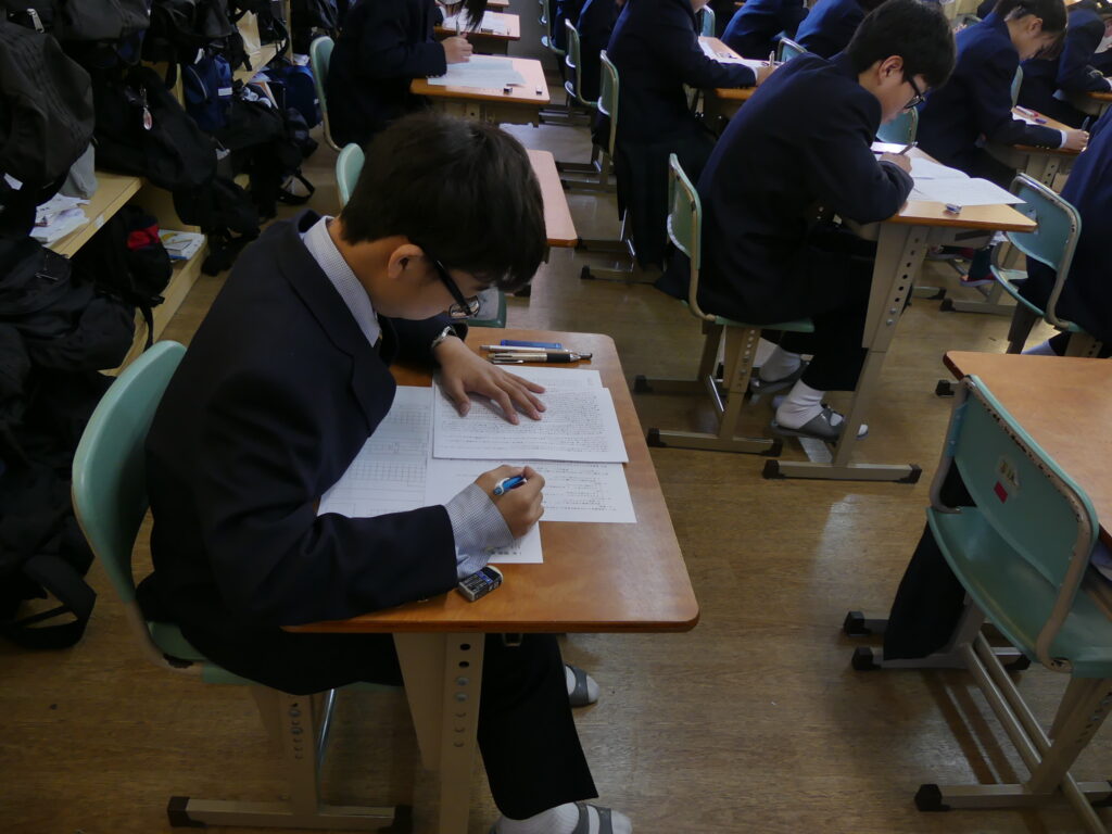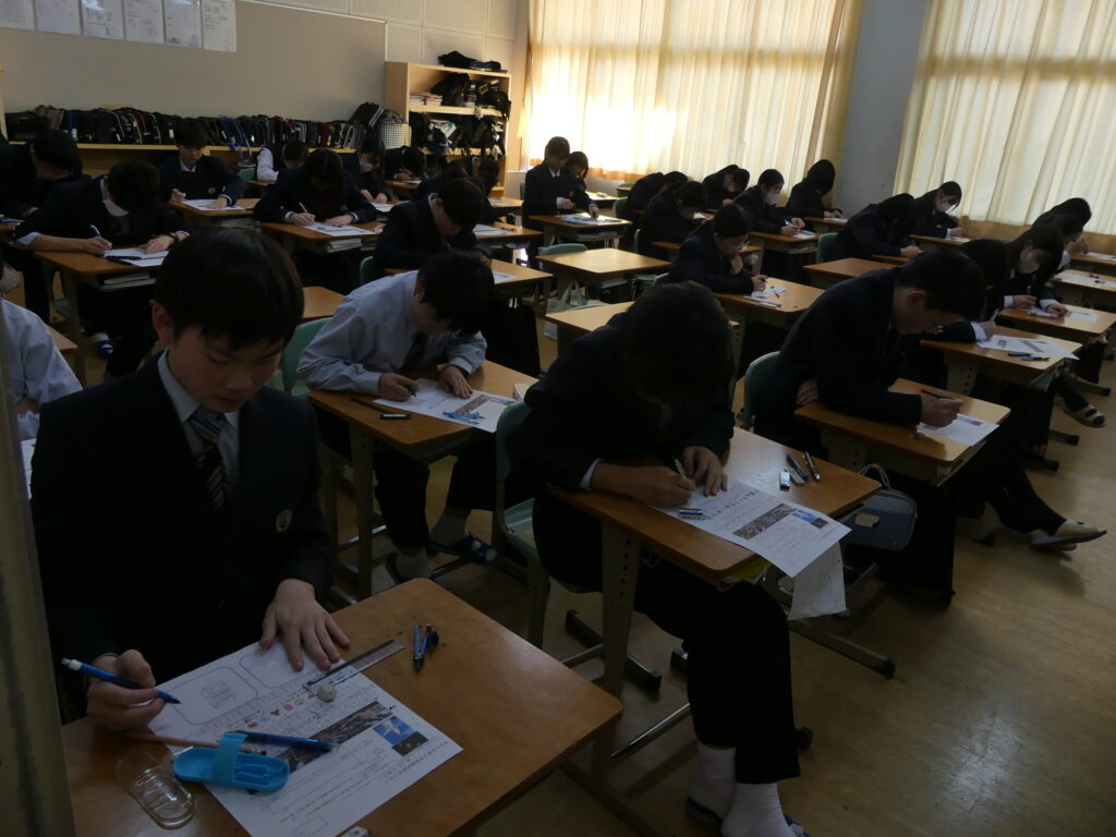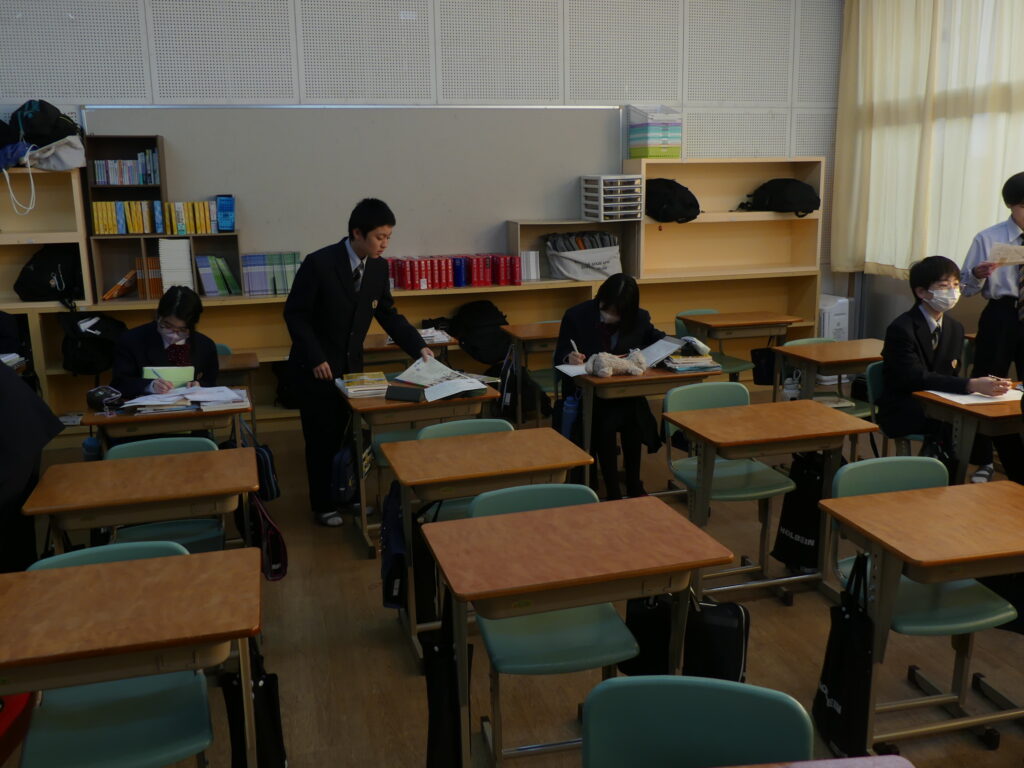 J1生、J2生は本日から2/18(水)まで第5回定期考査です。(今、オーストラリアに修学旅行に行っているJ3生は2/24(火)から)初日の今日はJ1生、J2生ともに国語、美術、理科が行われました。早朝から登校してノートを見直したり、友達と確認し合ったりする姿が見られました。