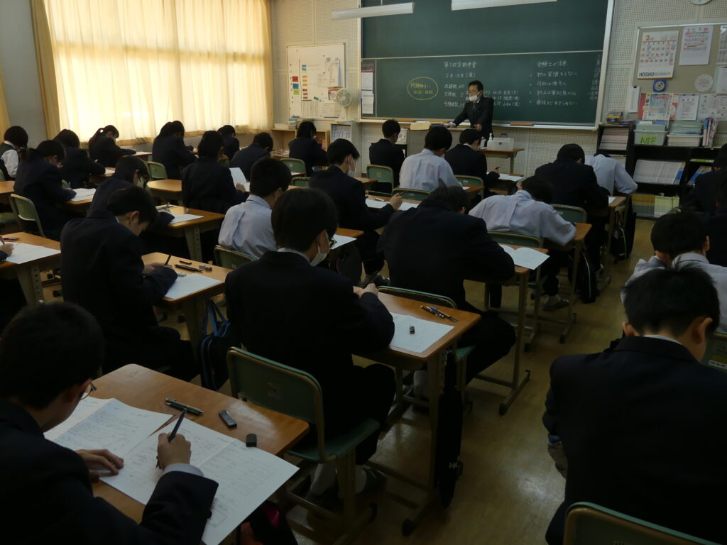 これまで各学期に2回ずつ考査を受けてきましたが、今回が本年度最後の学年末考査となります。3学期の学習状況を評価するとともに、年間の取り組みを総合的に評価する大切な試験です。今週から部活動も中止となり、その分を放課後学習に参加したり、職員室に質問に来たりする姿が多く見られました。今回は保健体育や芸術、技術家庭も含めたすべての教科の試験となりますが、しっかりと準備をして臨み、納得のいく結果を出してほしいと思います。それが3月の学習、つまり次年度へ向けた学習につながります。