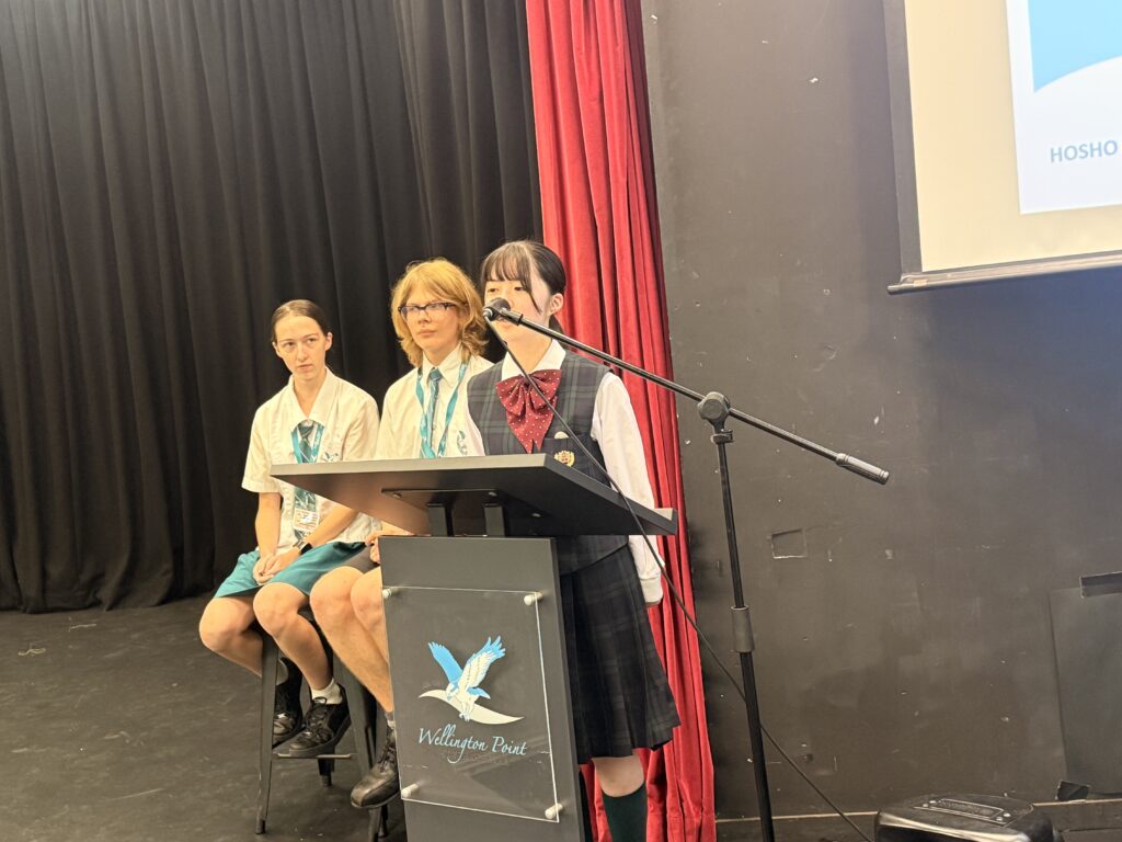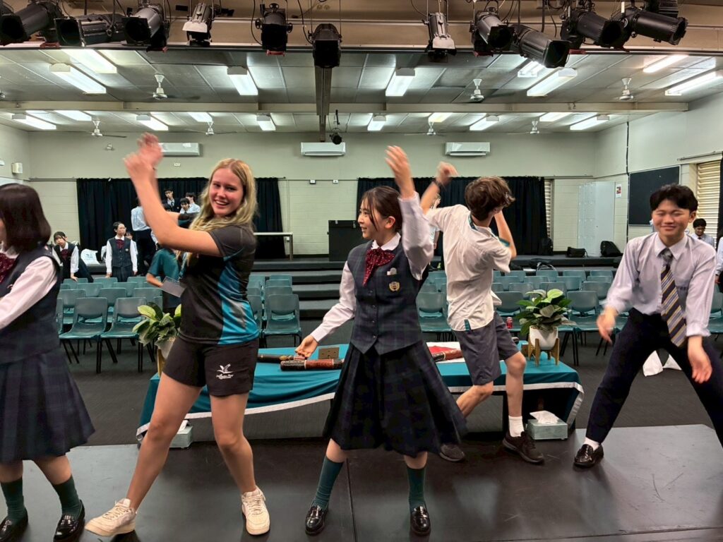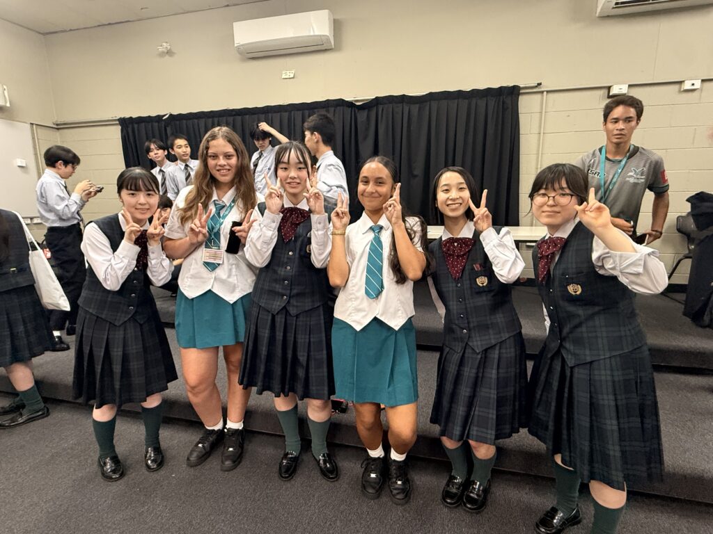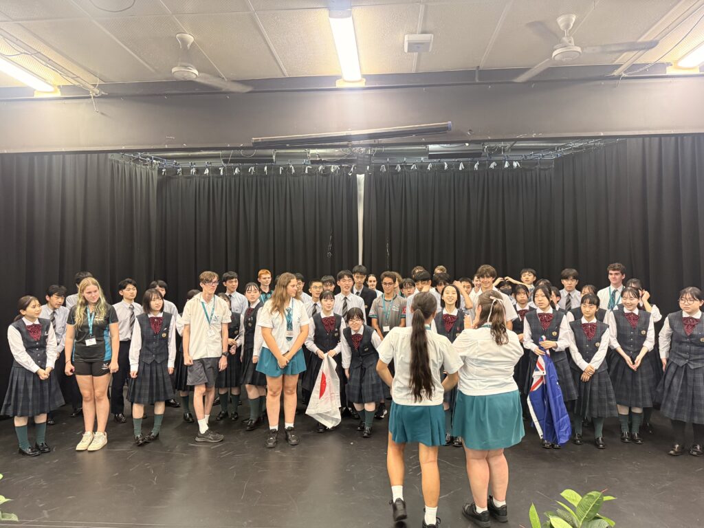 まずはWelcome Ceremonyがあり、本校生徒を代表して黒木ゆき乃さん(都農南小出身)が挨拶を行いました。その後、J3Aの生徒全員で「ソーラン節」を披露しました。