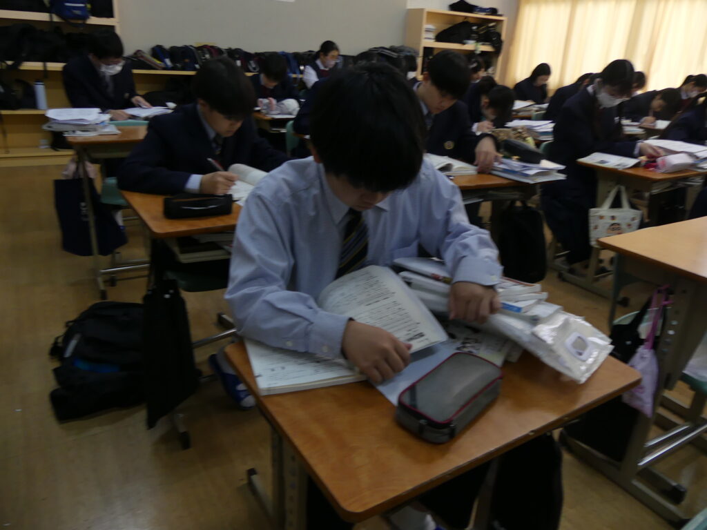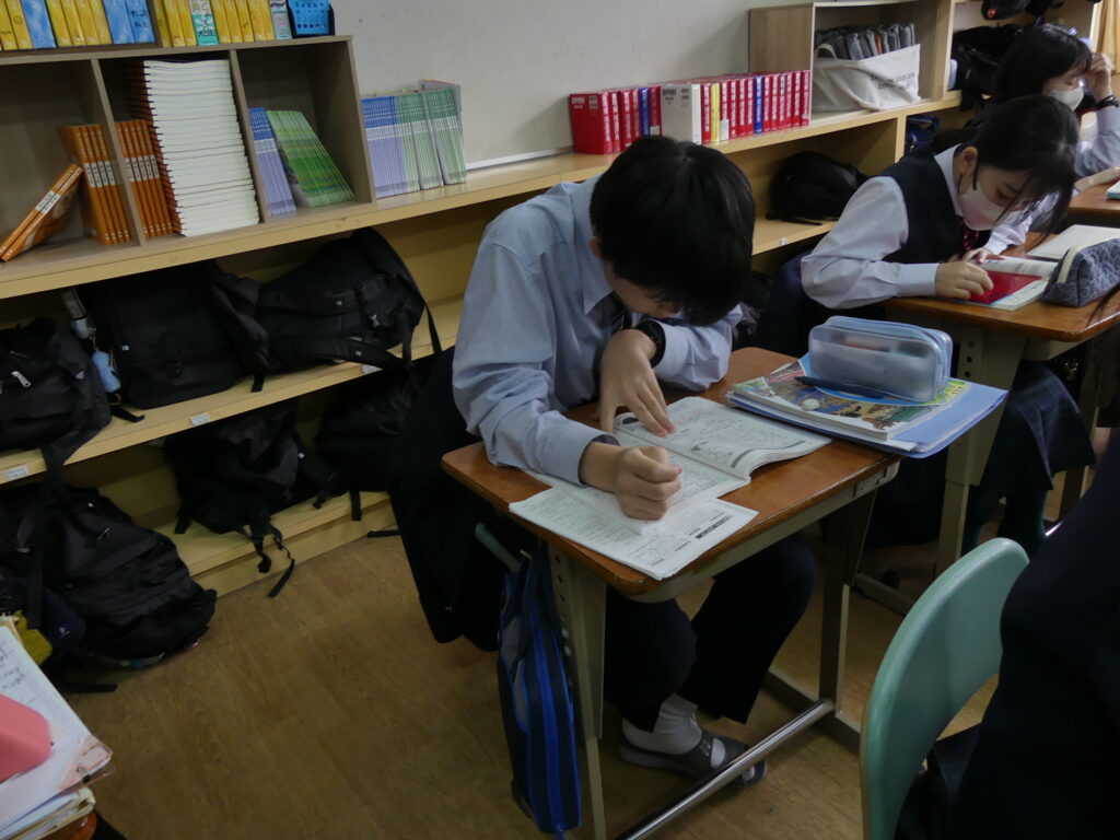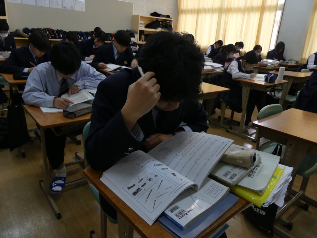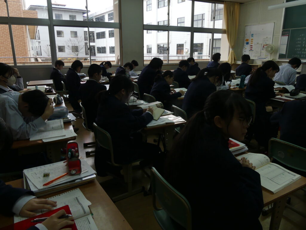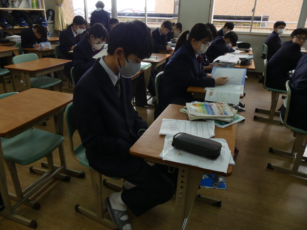 定期考査3日目です。3日目は体力的、精神的に一番大変な時ではないかと思います。今日の時間割は1限目自学、2限目英語、3限目音楽、4限目社会、5.6限自学です。1.5.6限の自学の様子を見てみました。