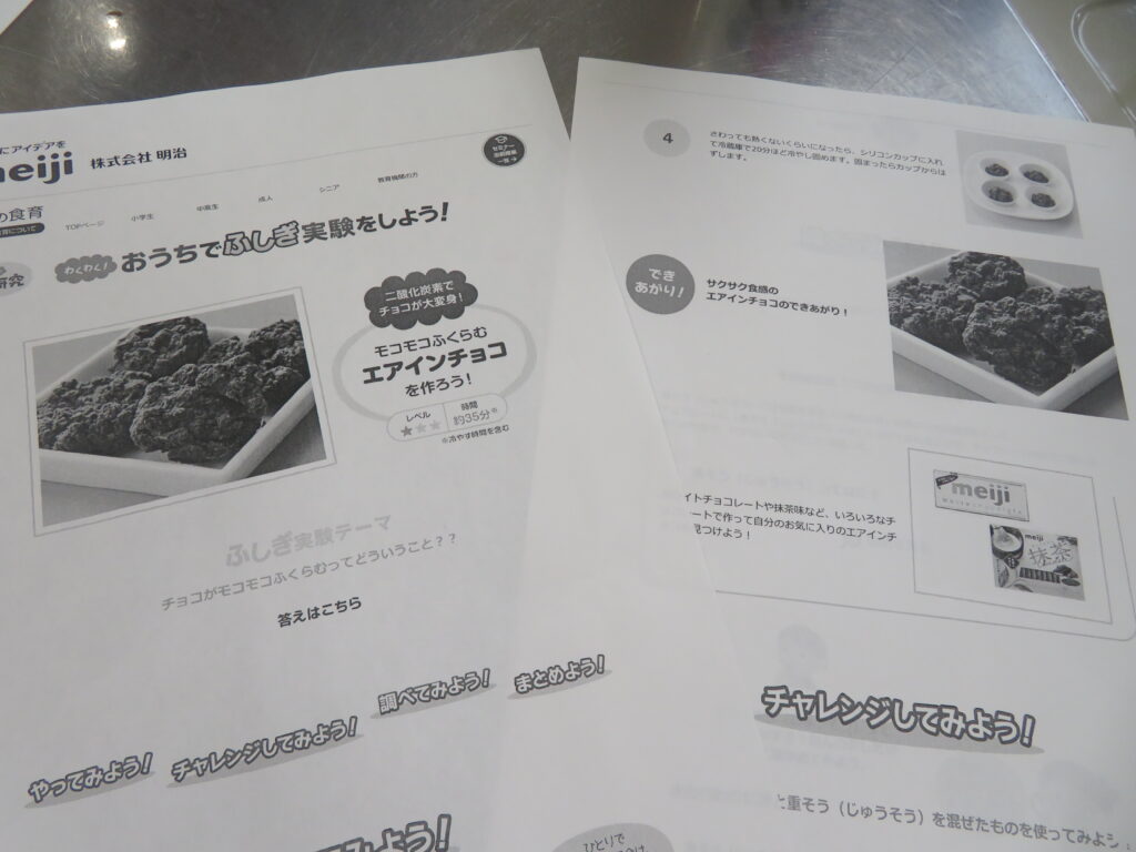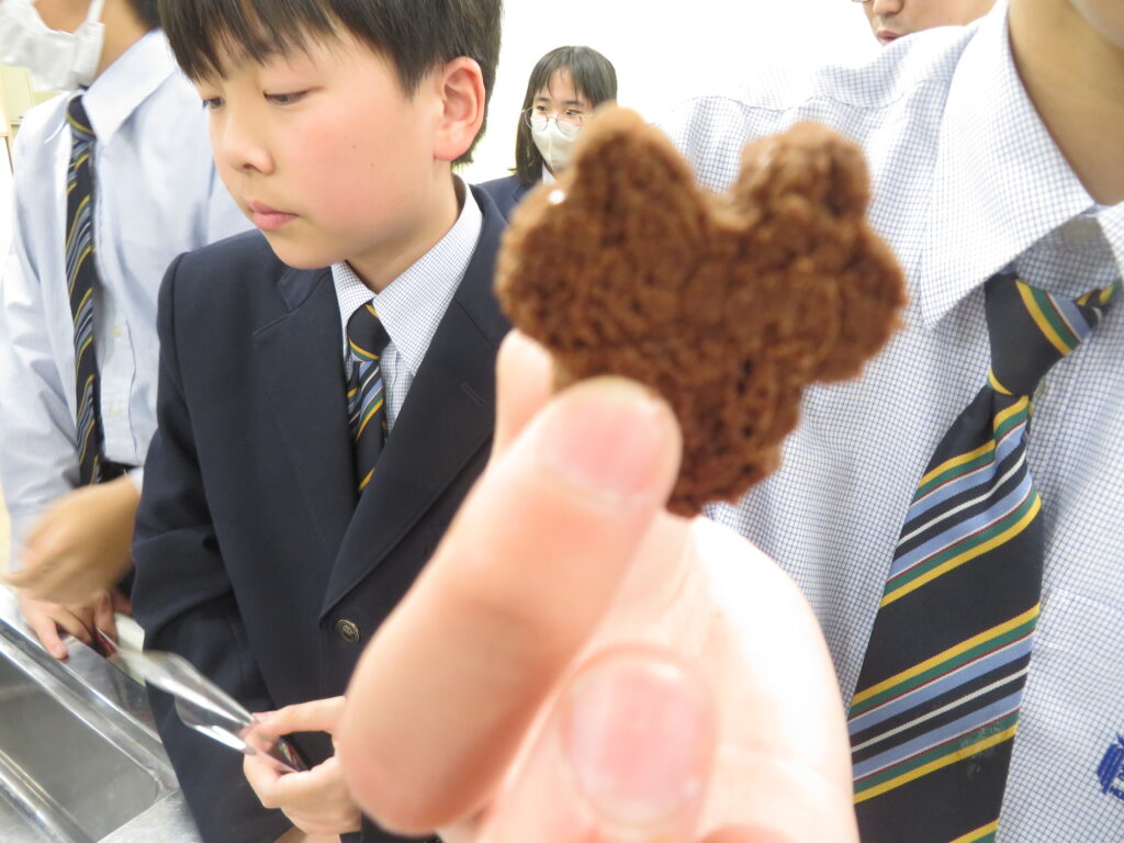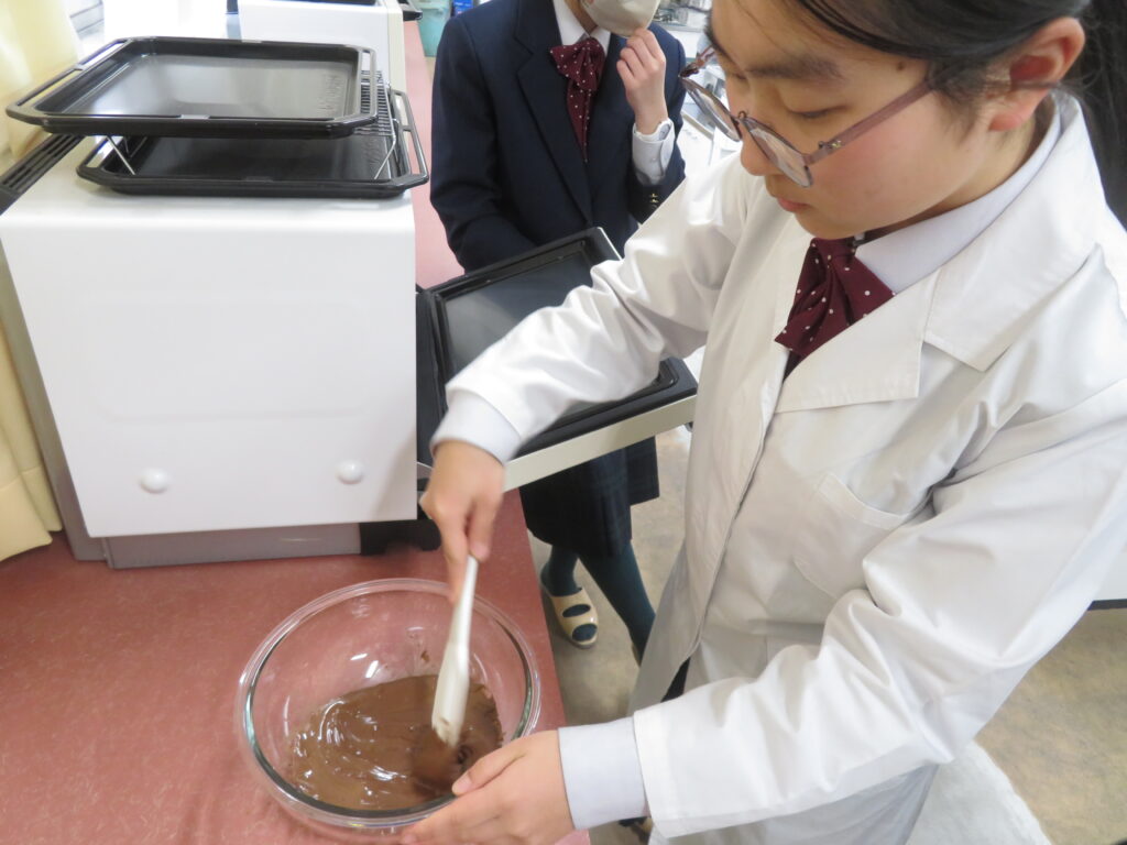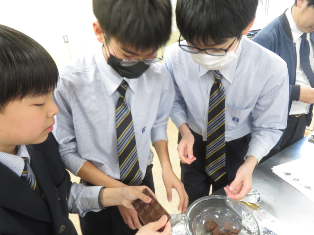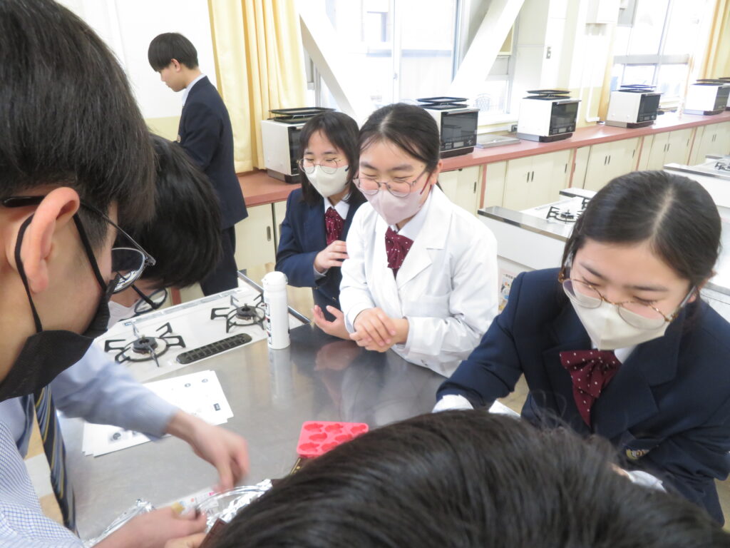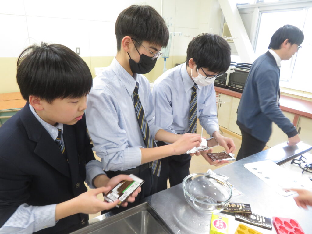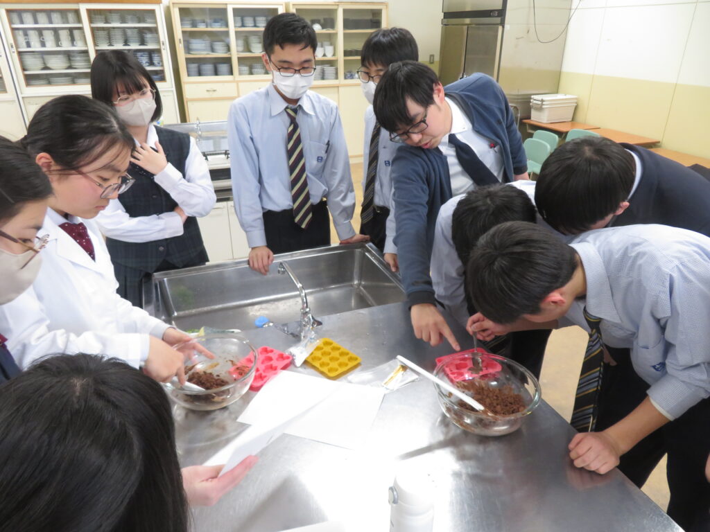 本日は,サイエンス部が家庭科室で何やら実験をするとのことで,おじゃましてみました。J3生が修学旅行の振替休日のためJ1,J2生での活動でしたが,珍しく中高一貫の高3生が2人 遊びに来ていました。ちなみに2人とも中学時代はサイエンス部です。バレンタインデーはテスト期間中だったので,少し遅れたチョコづくりの実験です。形は完璧とはいかなかったようですが,美味しいエアインチョコが完成したようで,ラッピングして余った分をみんなで味見していました。