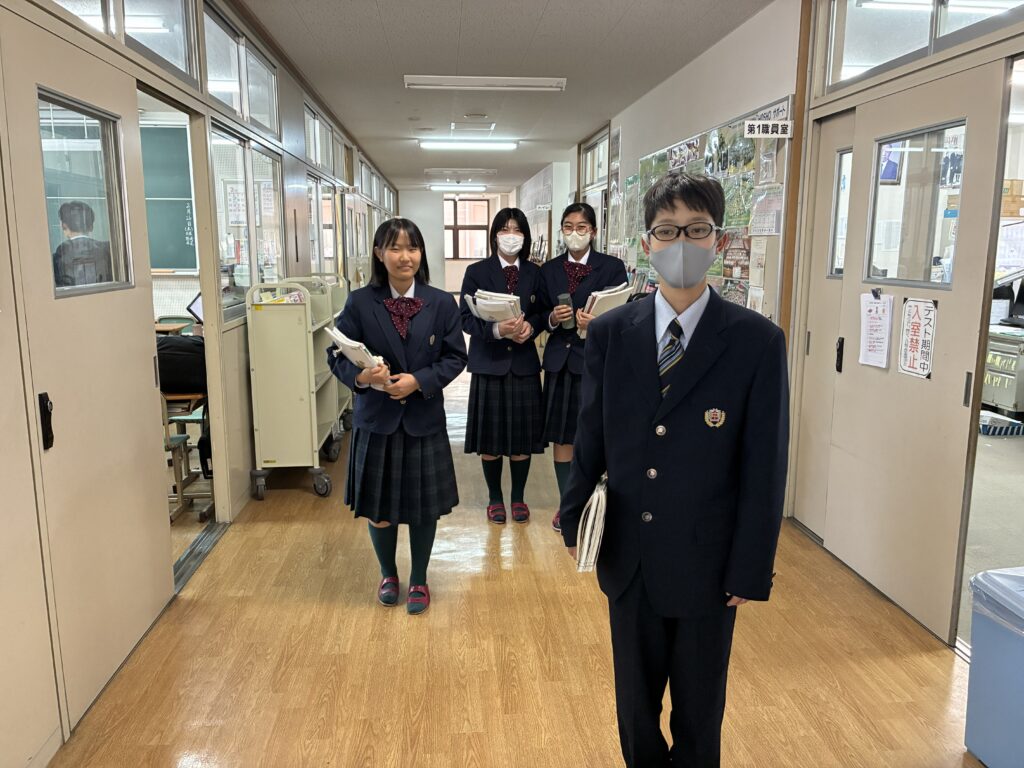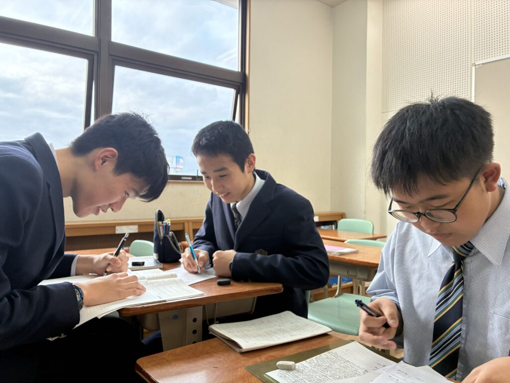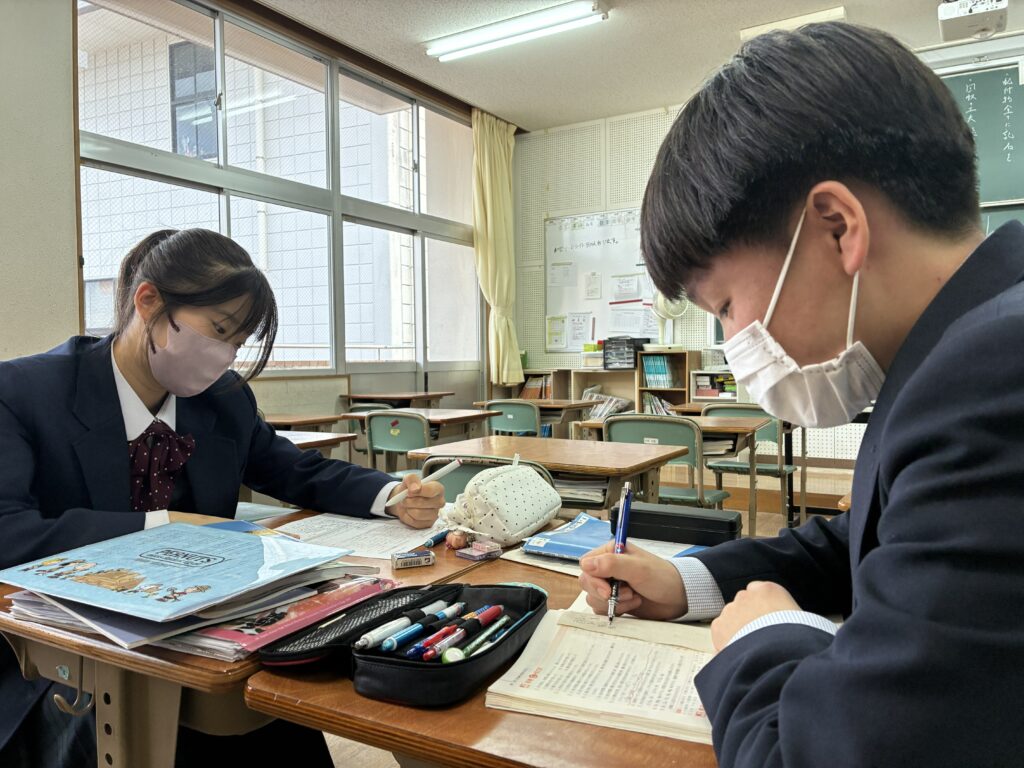 本日は、放課後の様子の一部を紹介します。定期考査中のJ3生は、問題を出し合うなどして過ごしていました。また、定期考査を終えたばかりの下級生は、先生にアドバイスを受ける様子や放課後学習に参加する生徒など有意義な時間を過ごしていました。