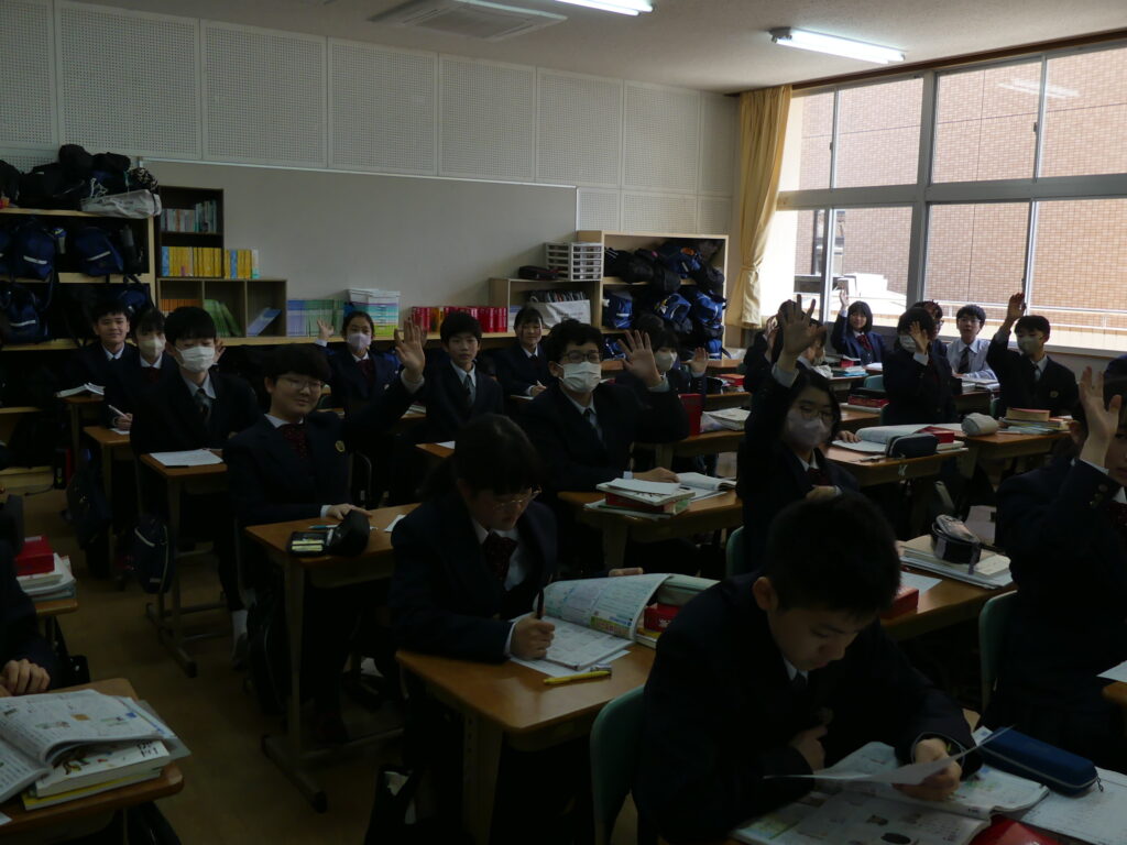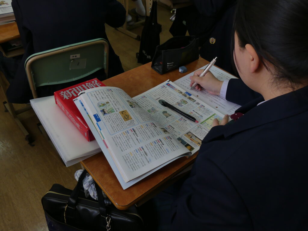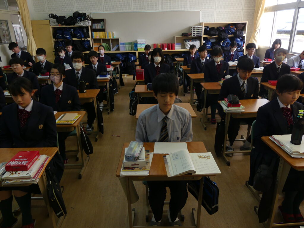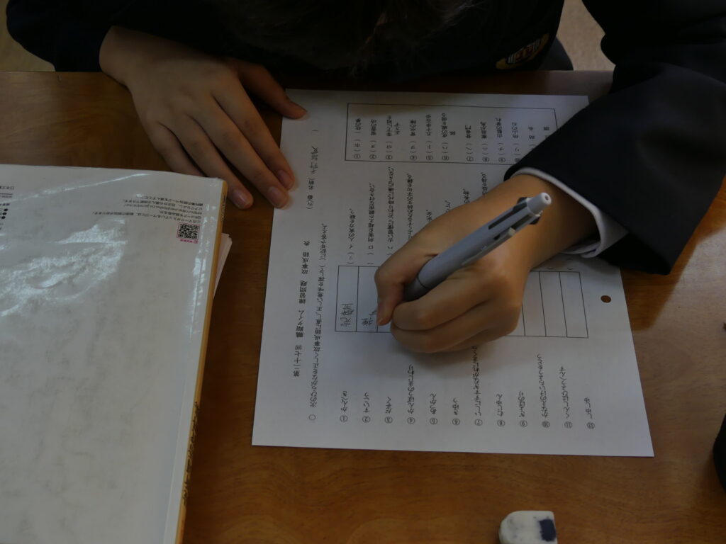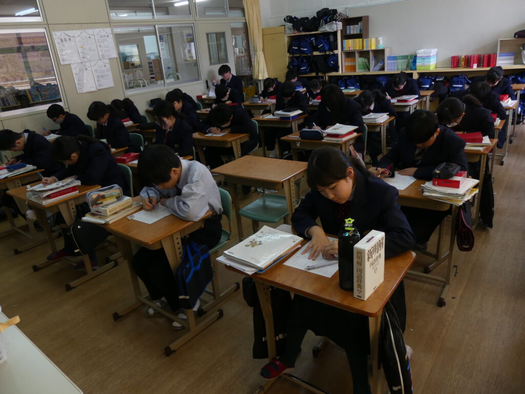 第5回定期考査(学年末考査)が先週までで終了し、生徒の皆さんはほっと一息というところだと思いますが、再来週の3月17日(火)には「総復習テスト」があります。この1年間、国・数・英の各教科で朝のHOSHOタイムの時間を中心に、故事成語や四字熟語などの漢字、数学の基本公式を利用した問題、英語の基本文型などの各教科の基本を繰り返し学習してきましたが、その習得・定着度を確認するのがこのテストです。 国語は明日のHOSHOタイムが学習範囲の最後の回(「故事成語」)になりますが、1年生については、それへ向けた問題演習を今日の授業の中で行いました。故事を理解し、難しい漢字を憶えようと、皆真剣に取り組んでいました。