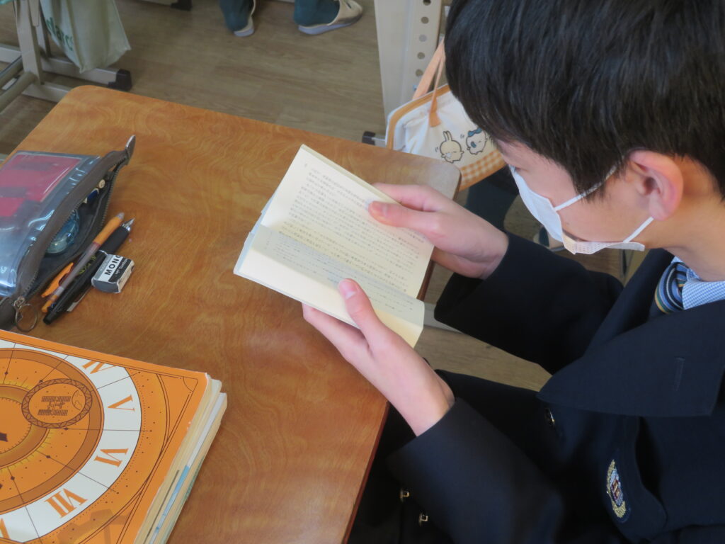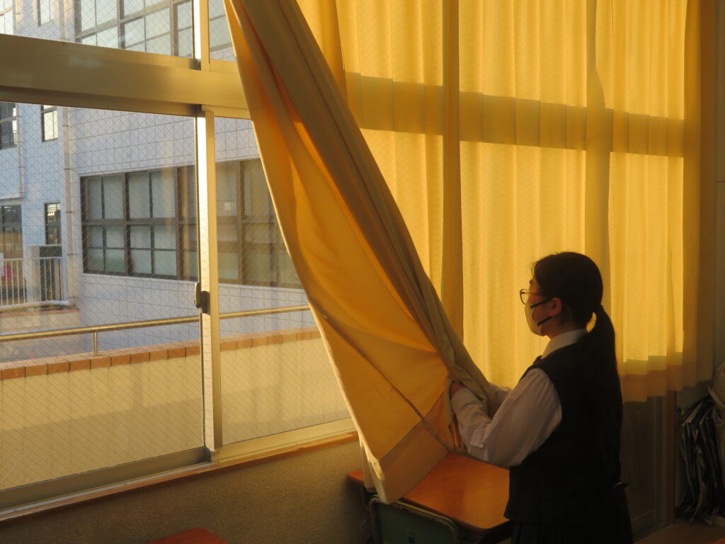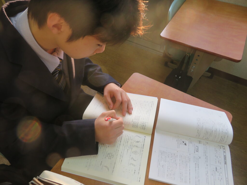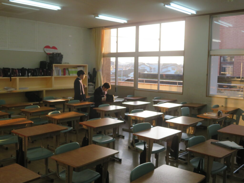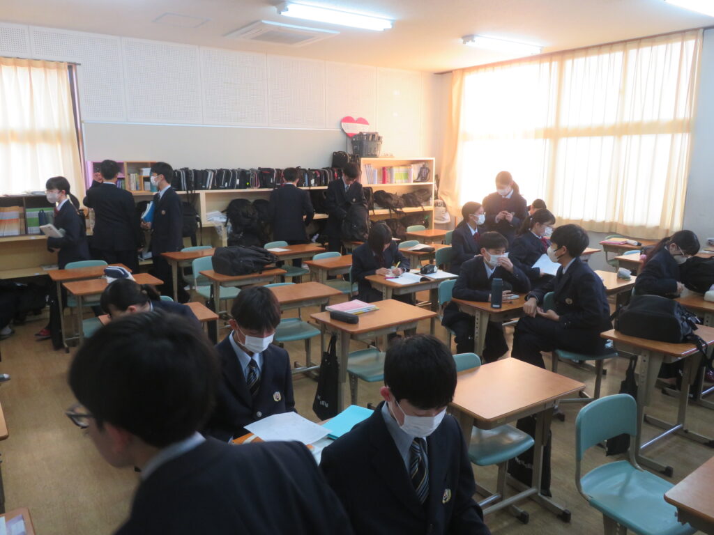 只今の時刻は7:15,早朝の肌寒い空気の中,日が昇るとともに鵬翔中生は各々校舎に集まってきます。JRを利用して登校してくる生徒を中心に7時前には1番乗りの生徒が教室の鍵を開け,カーテンを束ね,窓を開け空気を入れ替えてくれます。7:40に始まる朝の課外の1分前黙想の時間まで,生徒たちはそれぞれの過ごし方をしています。新聞に目を通す生徒,授業の予習をする生徒,読書をする生徒,クラスメイトと語らう生徒,本日のブログはそんな朝の様子です。