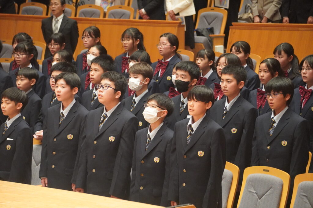 ウェルカムコンサートもあり、歓迎ムードの中、 新しい制服に身を包んだ1年生が緊張した面持ちで式典に臨んでいました。