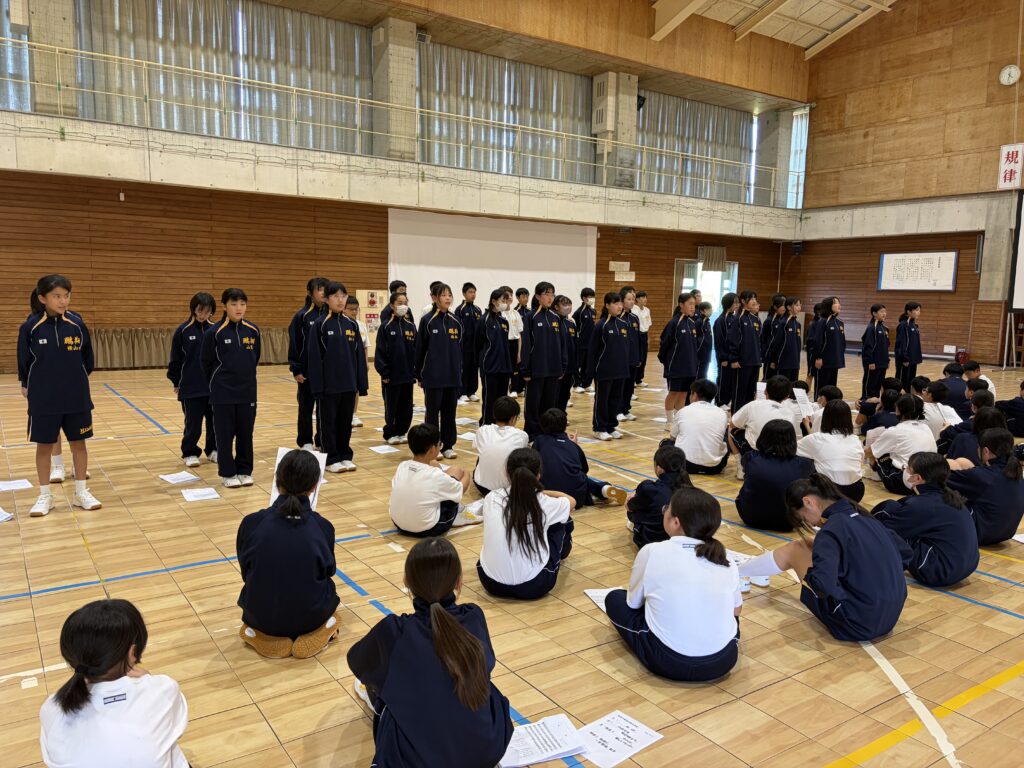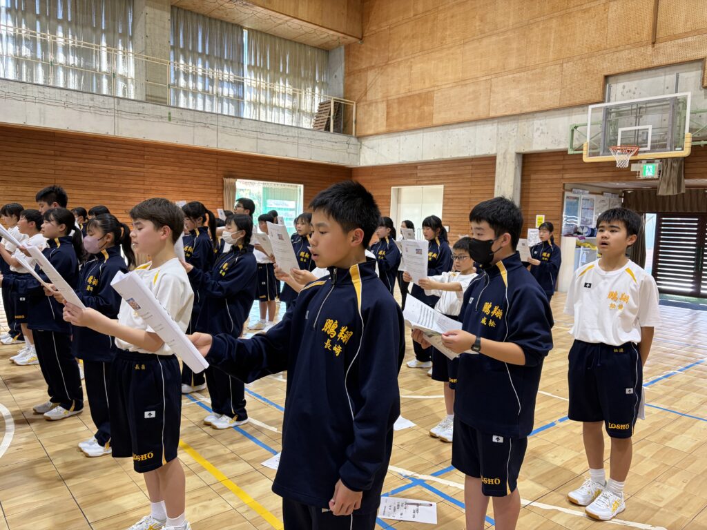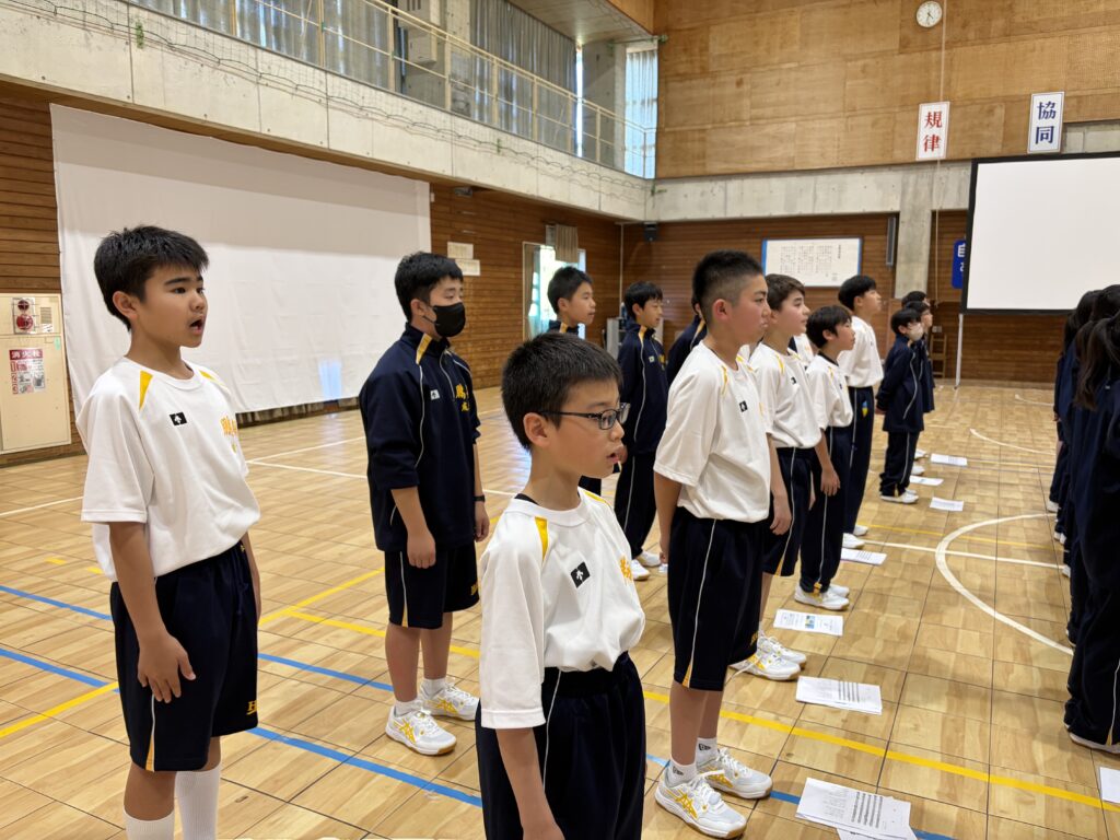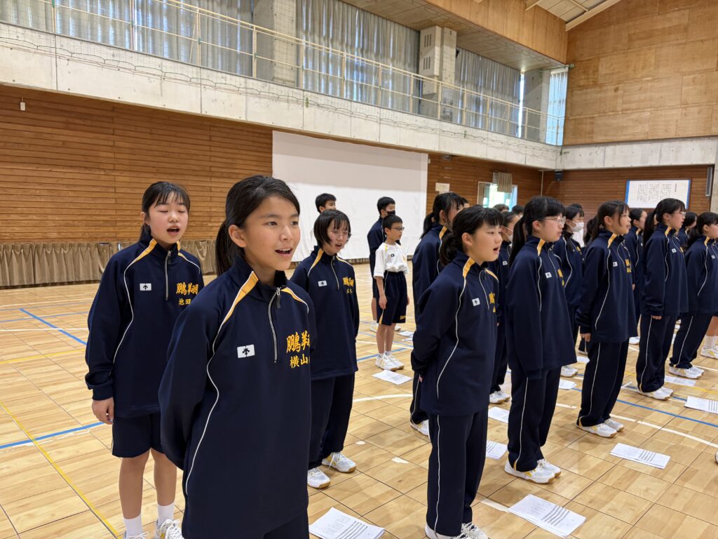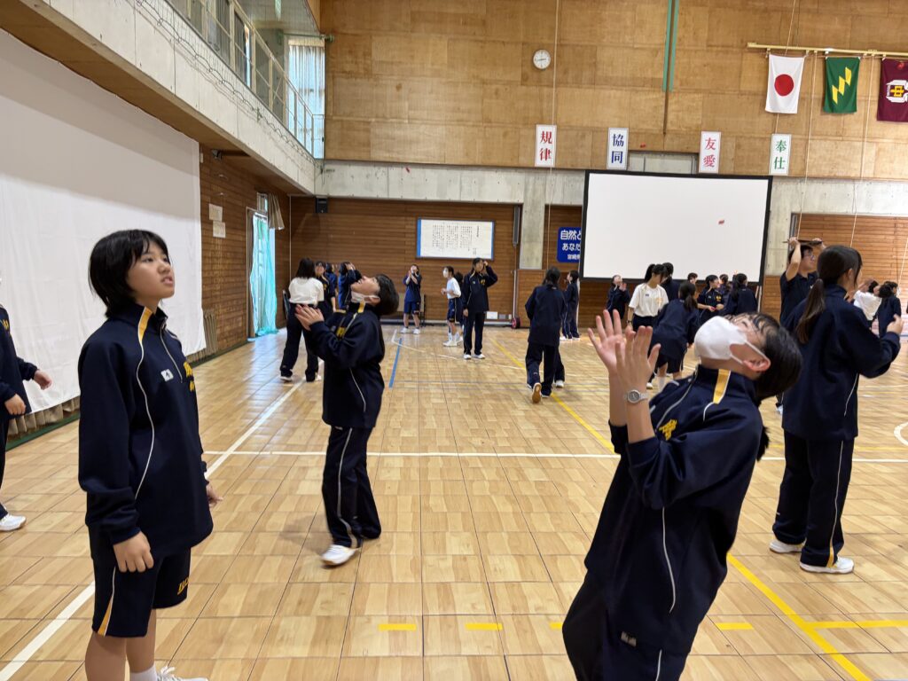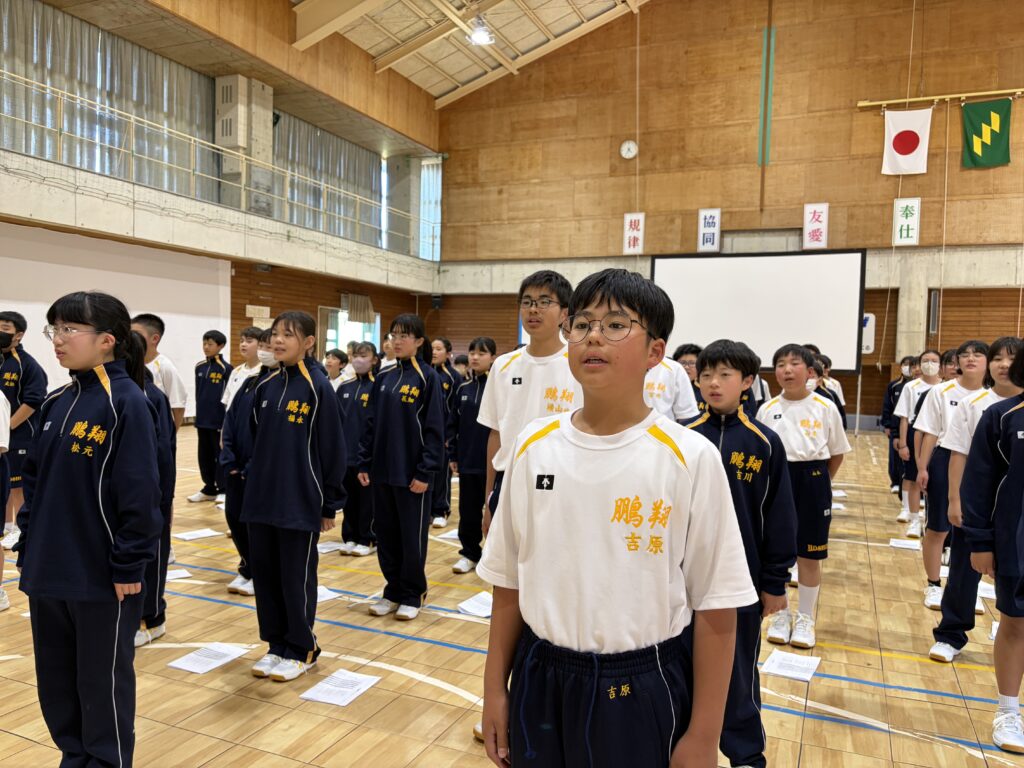 次は、校歌練習です。宮﨑先生がお手本で歌い、それに続いて生徒たちも歌います。最初は自信がなく声も小さかったのですが、徐々に歌声も大きくなっていきました。自信と誇りを持って歌ってほしいと思います‼︎