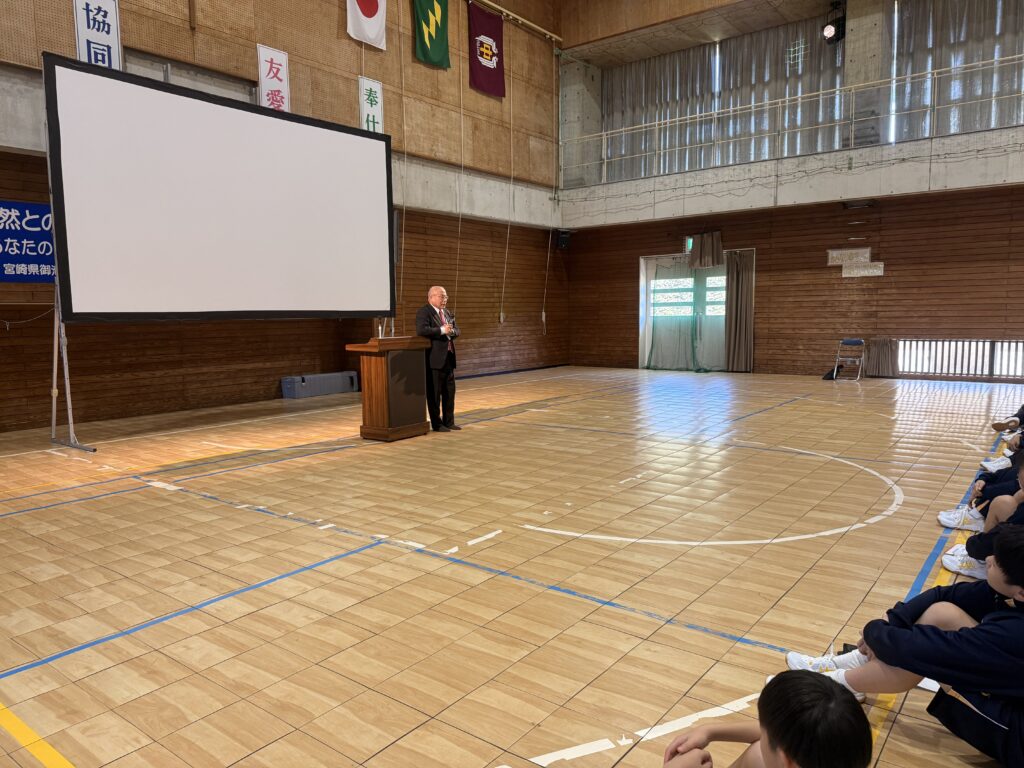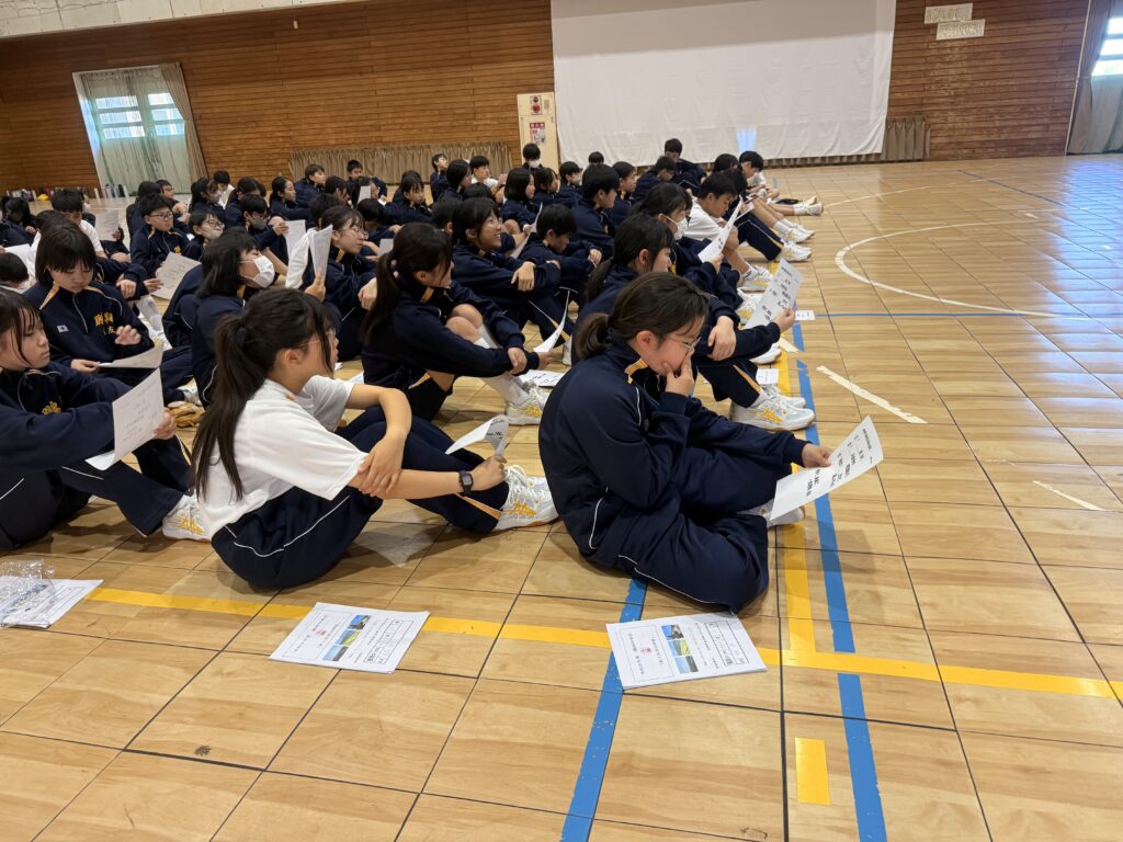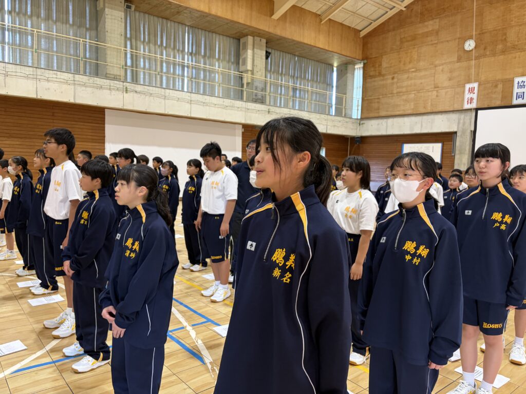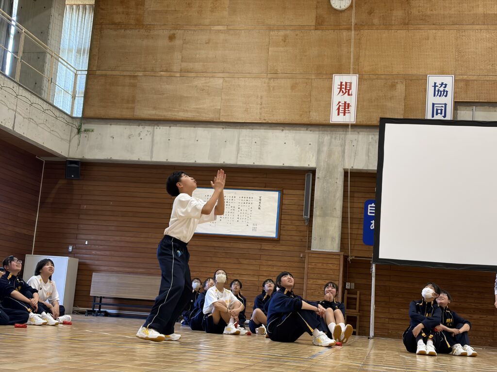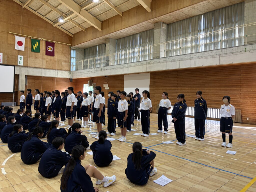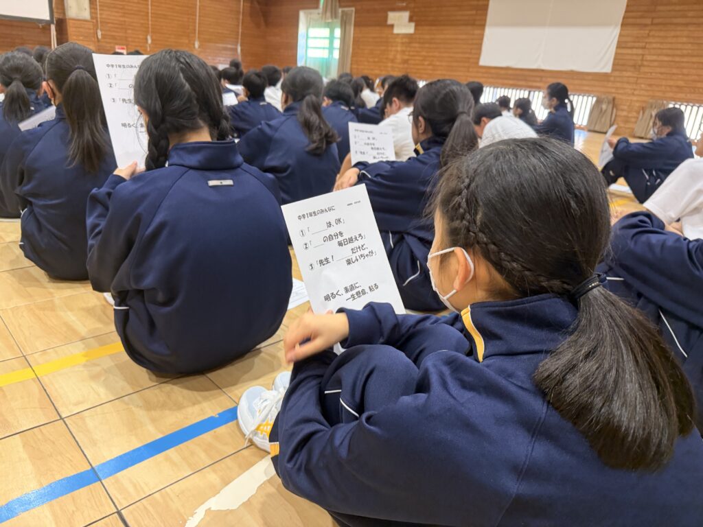 次は、校歌練習です。宮﨑先生がお手本で歌い、それに続いて生徒たちも歌います。最初は自信がなく声も小さかったのですが、徐々に歌声も大きくなっていきました。自信と誇りを持って歌ってほしいと思います‼︎