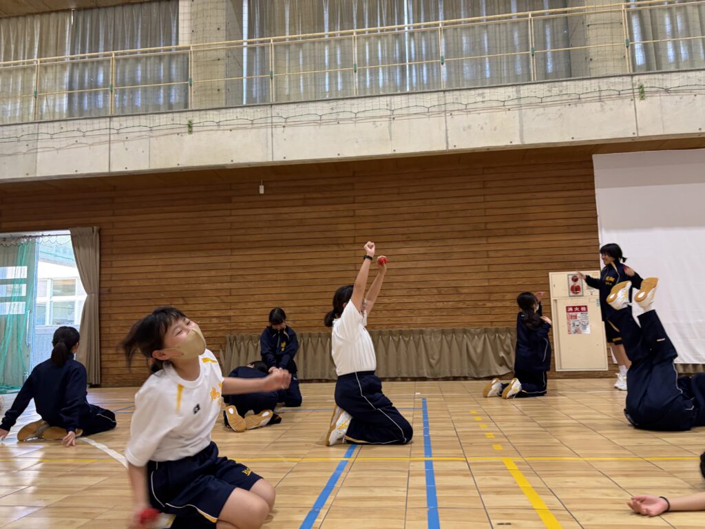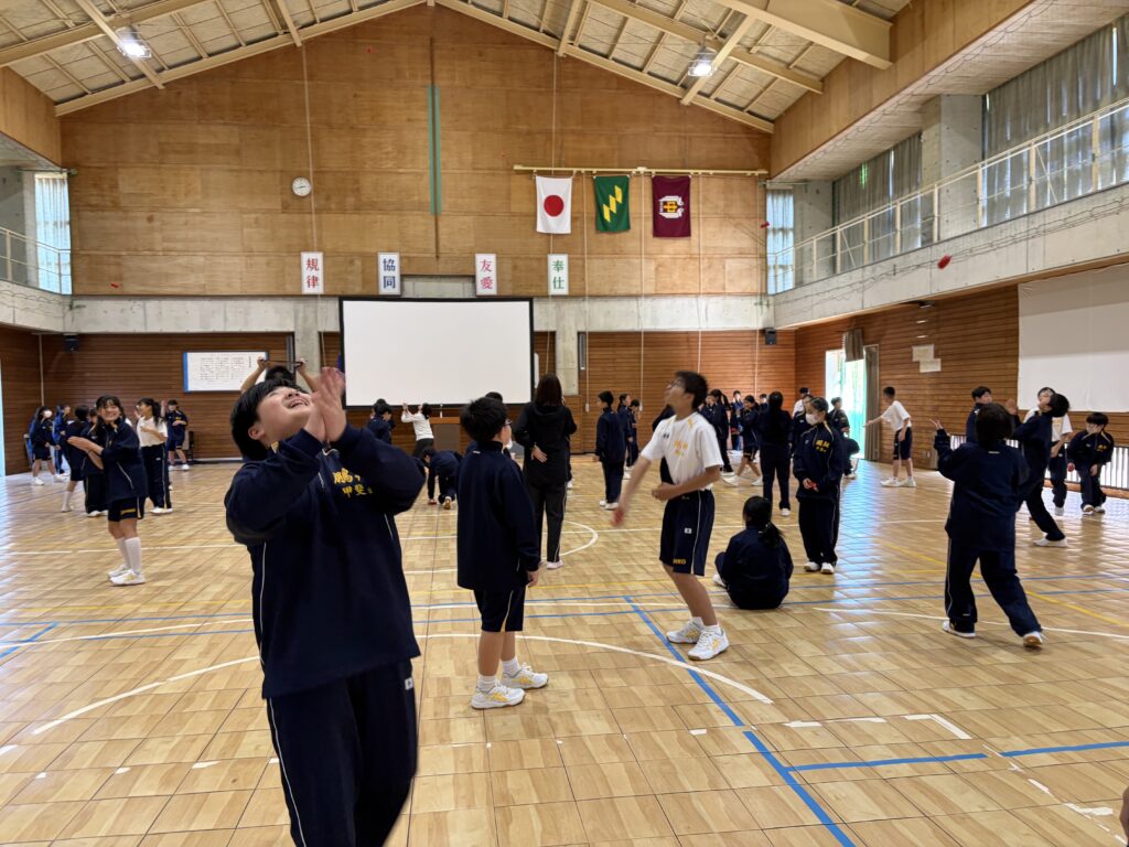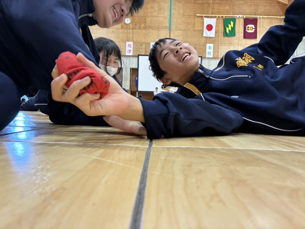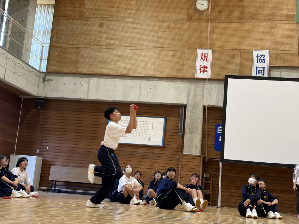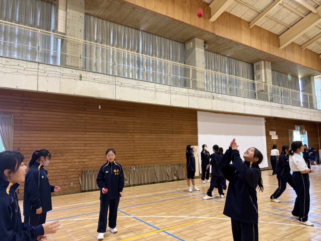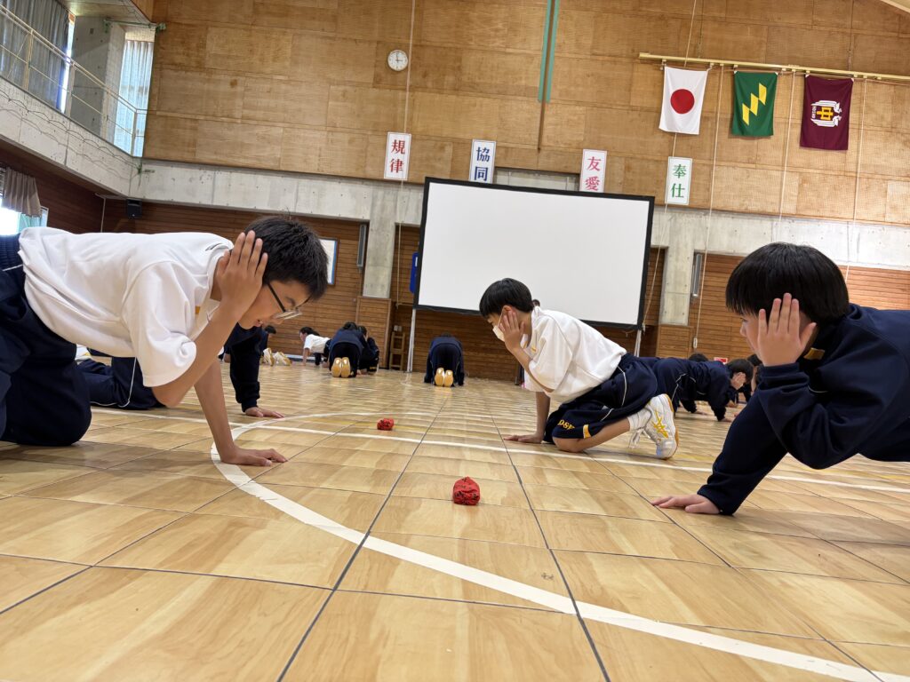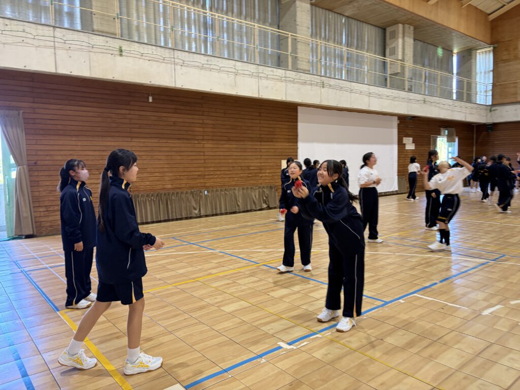 次に、体育の天賀先生と集団行動の練習を行いました。足の使い方など基本動作を学び、全員で繰り返し練習しました。生徒たちは、天賀先生の指示をしっかり聞き、スムーズに練習が進んでいきます。その後、おじゃみを使ってコミュニケーションを図る活動をしました。とても楽しそうに活動しています!!