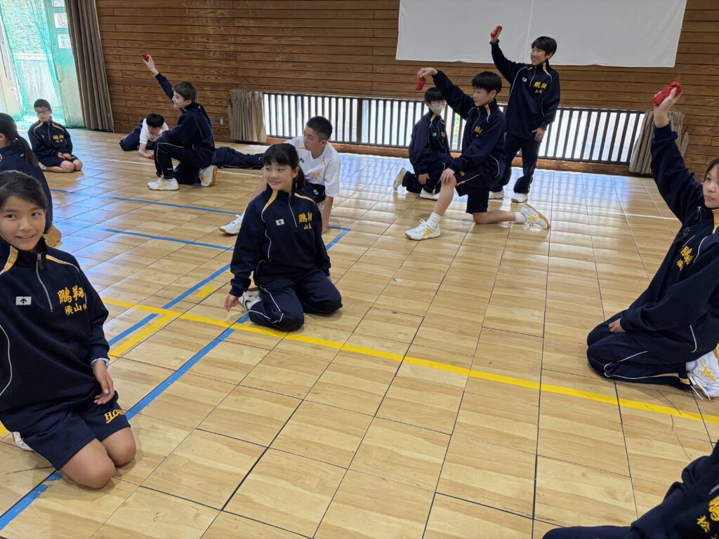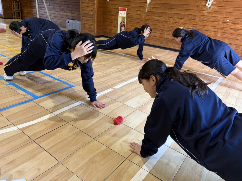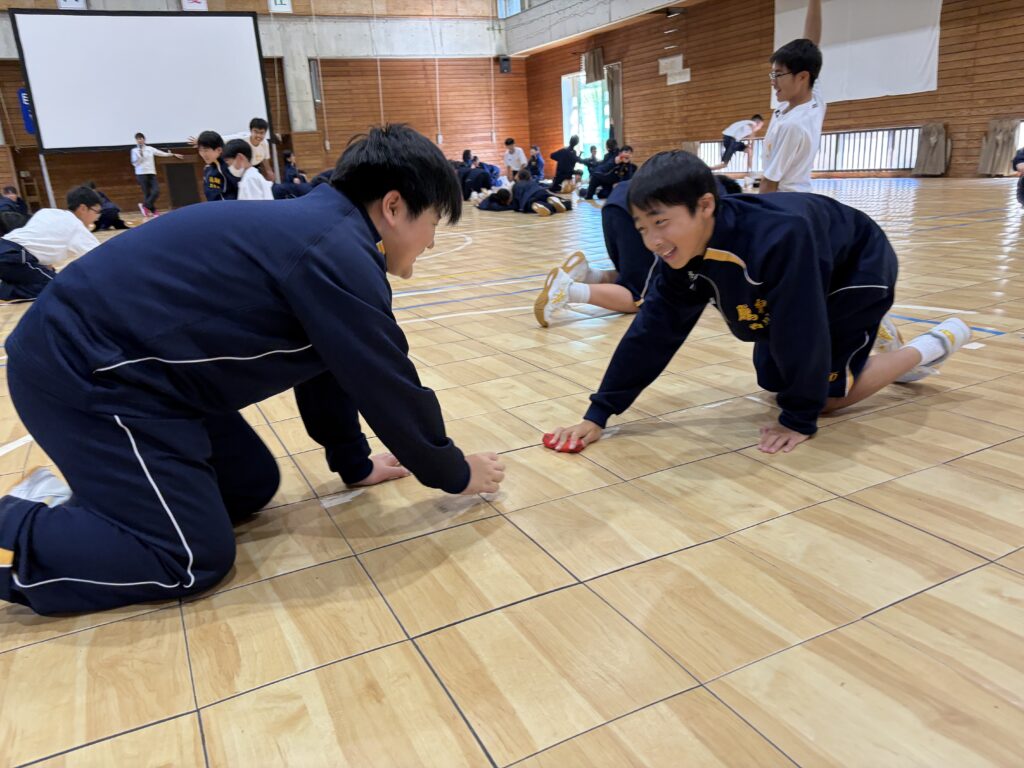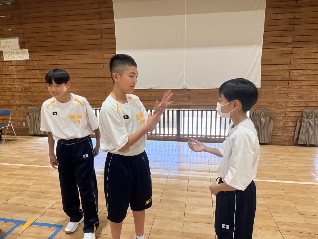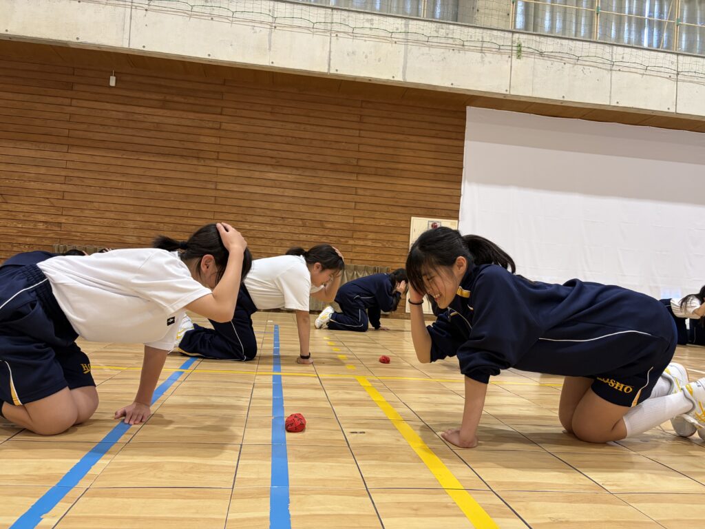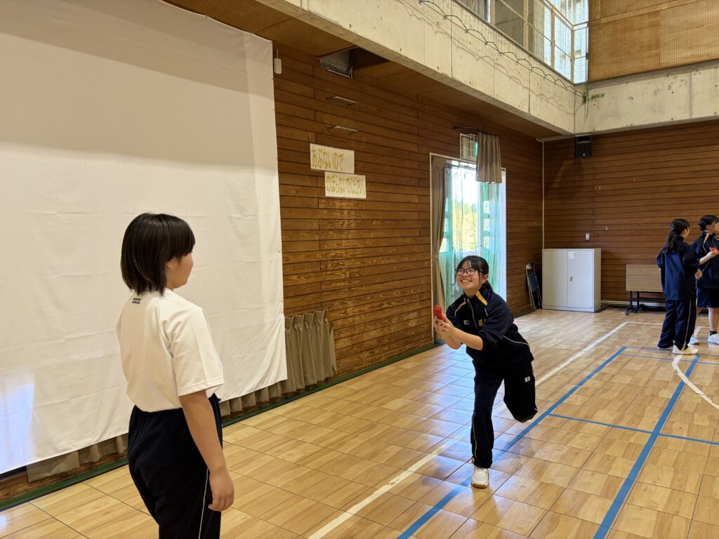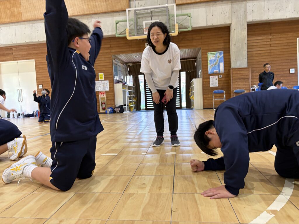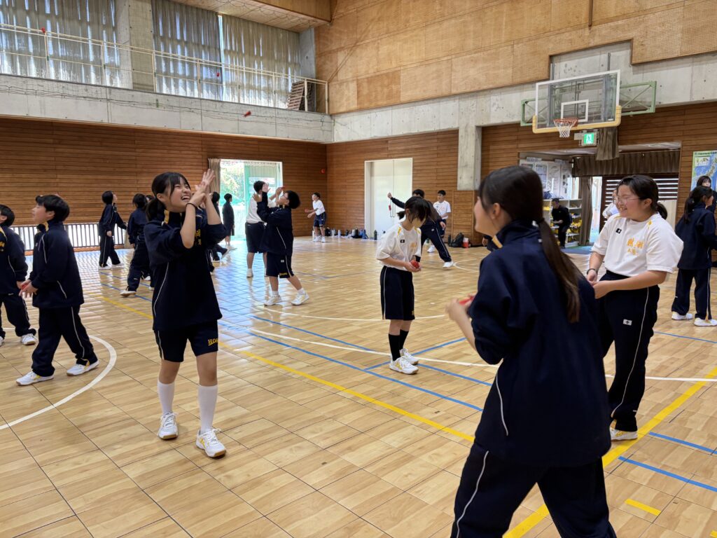 次に、体育の天賀先生と集団行動の練習を行いました。足の使い方など基本動作を学び、全員で繰り返し練習しました。生徒たちは、天賀先生の指示をしっかり聞き、スムーズに練習が進んでいきます。その後、おじゃみを使ってコミュニケーションを図る活動をしました。とても楽しそうに活動しています!!