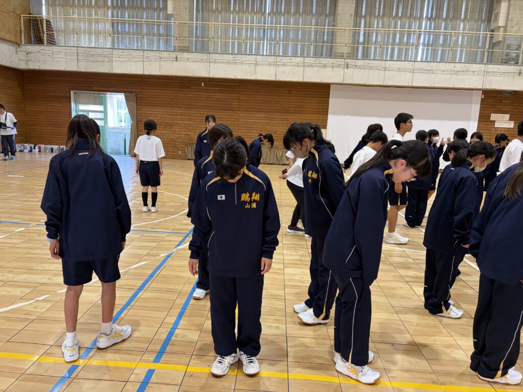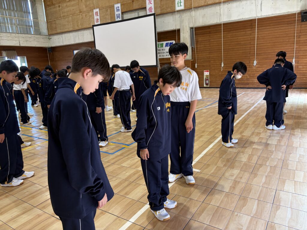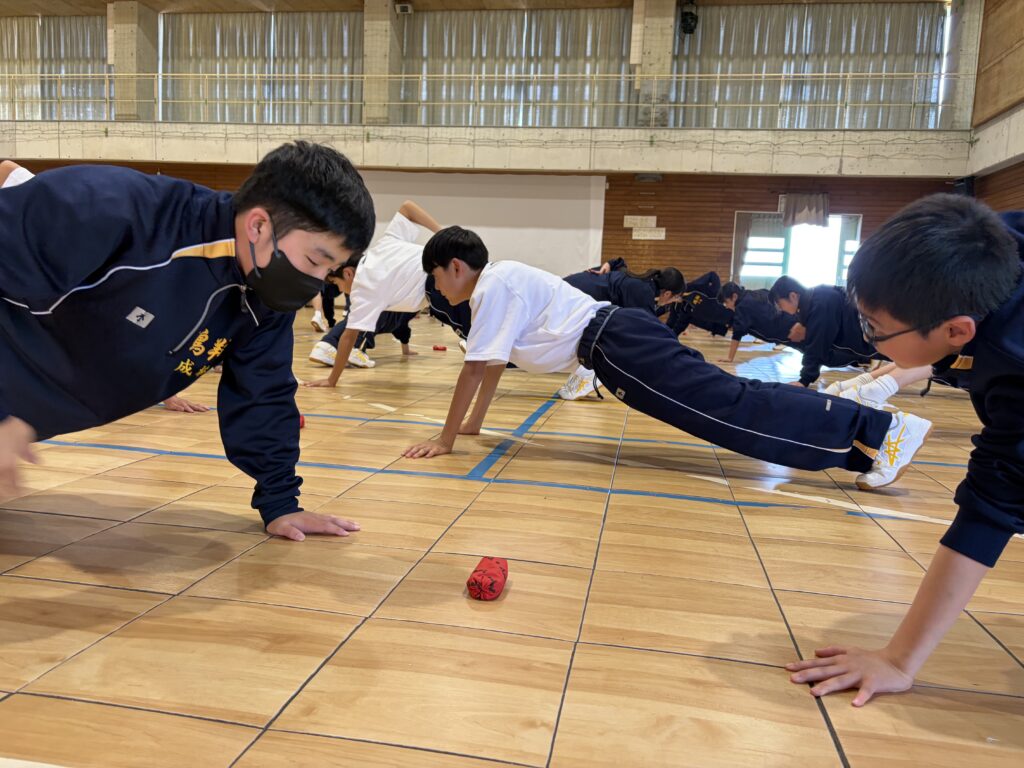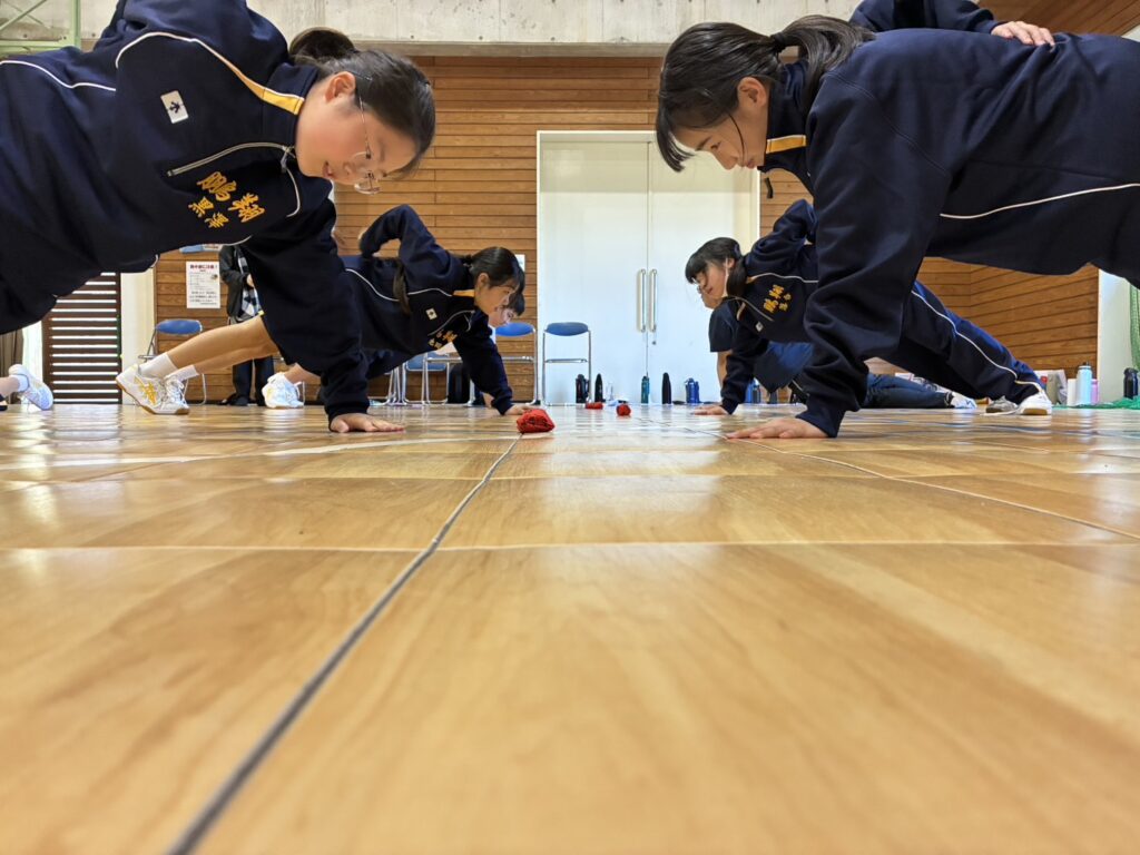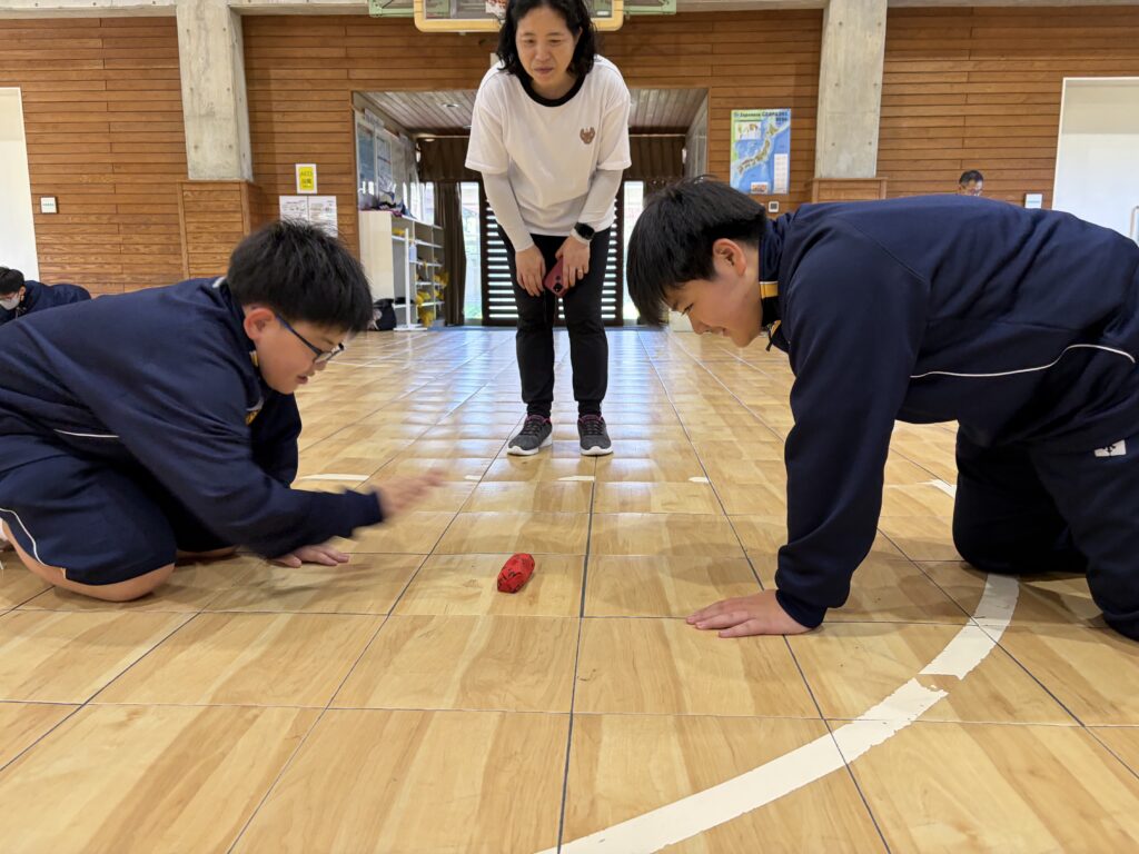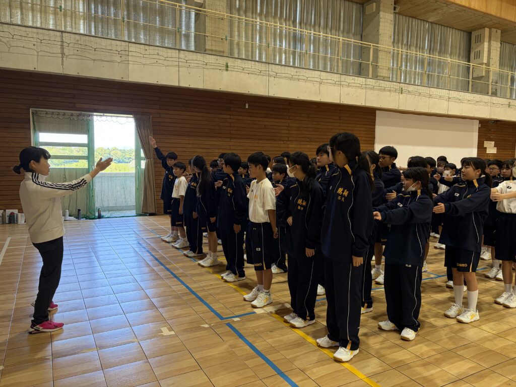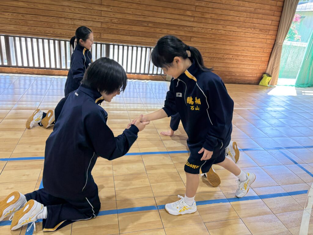 次に、体育の天賀先生と集団行動の練習を行いました。足の使い方など基本動作を学び、全員で繰り返し練習しました。生徒たちは、天賀先生の指示をしっかり聞き、スムーズに練習が進んでいきます。その後、おじゃみを使ってコミュニケーションを図る活動をしました。とても楽しそうに活動しています!!